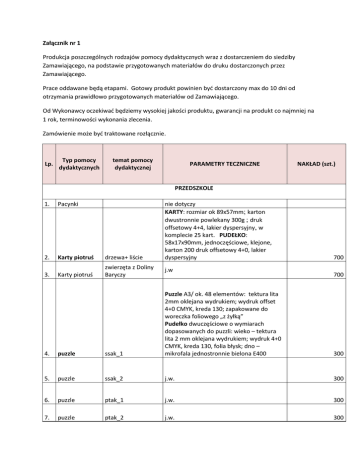 Załącznik nr 1 Produkcja poszczególnych rodzajów pomocy dydaktycznych wraz z dostarczeniem do siedziby Zamawiającego, na podstawie przygotowanych materiałów do druku dostarczonych przez Zamawiającego. Prace oddawane będą etapami. Gotowy produkt powinien być dostarczony max do 10 dni od otrzymania prawidłowo przygotowanych materiałów od Zamawiającego. Od Wykonawcy oczekiwać będziemy wysokiej jakości produktu, gwarancji na produkt co najmniej na 1 rok, terminowości wykonania zlecenia. Zamówienie może być traktowane rozłącznie. Lp. Typ pomocy dydaktycznych temat pomocy dydaktycznej PARAMETRY TECZNICZNE NAKŁAD (szt.) PRZEDSZKOLE 1. Pacynki 2. Karty piotruś drzewa+ liście Karty piotruś zwierzęta z Doliny Baryczy 3. nie dotyczy KARTY: rozmiar ok 89x57mm; karton dwustronnie powlekany 300g ; druk offsetowy 4+4, lakier dyspersyjny, w komplecie 25 kart. PUDEŁKO: 58x17x90mm, jednoczęściowe, klejone, karton 200 druk offsetowy 4+0, lakier dyspersyjny j.w 700 700 4. puzzle ssak_1 Puzzle A3/ ok. 48 elementów: tektura lita 2mm oklejana wydrukiem; wydruk offset 4+0 CMYK, kreda 130; zapakowane do woreczka foliowego „z żyłką” Pudełko dwuczęściowe o wymiarach dopasowanych do puzzli: wieko – tektura lita 2 mm oklejana wydrukiem; wydruk 4+0 CMYK, kreda 130, folia błysk; dno – mikrofala jednostronnie bielona E400 5. puzzle ssak_2 j.w. 300 6. puzzle ptak_1 j.w. 300 7. puzzle ptak_2 j.w. 300 300 8. puzzle ptak_3 j.w. 300 9. puzzle ryba_1 j.w. 300 10. puzzle ryba_2 j.w. 300 11. puzzle mapa Doliny Baryczy 12. domino 13. domino 14. plansza 15. kolorowanka 16. kolorowanka nie dotyczy WARIANT A: klocek domina: drewniane, rozmiar pojedynczego klocka ok 10 x 5 cm, ilość domina w komplecie 24 szt. ilość elementów drukowanych ok 24 szt., na dominie druk zwierząt w kolorze, druk metodą termodruku pudełko dopasowane rozmiarami do gry, klejone, 4/0, lakier dyspersyjny, karton 300 g. (dopasowany do ciężaru gry – można dopasować odpowiednie wielkości) WARIANT B: Domino z tektury: rozmiar klocka domina 10x 5 cm, tektura lita 2 mm, zwierzęta leśne i ich oklejona dwustronnie kartonem GC2, 300 rodziny g.+ pudełko j.w. grzyby jadalne i trujące j.w. format: A2 Plansza: materiał: karton jednostronnie powlekany Alaska 250; druk offsetowy 4+0 CMYK, folia matowa/błyszcząca, Cztery pory roku ewentualnie -dziurki umożliwiające nad stawem powieszenie planszy 500 500 150 Urodziny Milusia A4 poziom, szyte zeszytowo po krótszym boku, środek: 8 str., 1/1, offset 120 g; okładka: 4/0, kreda 200 g 5000 O czym szumi tatarak A4 poziom, szyte zeszytowo po krótszym boku,środek: 24 str., 4/1, offset 150 g; okładka: 4/0, kreda 200 g 5000 POZIOM I-III Lp. Typ pomocy dydaktycznych 1. "8 wspaniałych" na patyku 2. Karty piotruś temat pomocy dydaktycznej PARAMETRY TECZNICZNE Postaci zwierząt jako pacynki na patyku. Komplet składa się z 8 szt. pacynek. Forma pacynek wykonana po obrysie postaci 8 wspaniałych zwierząt – (zwierzę rozmieszczone na (żaba, bocian, żmija, formacie A5), nadrukowana na drewnie bóbr, nietoperz, metodą termodruku, lakierowane. Pacynki karp, kozioróg drewniane przeznaczone do teatrzyku dębosz, Grabek) lalkowego. KARTY: rozmiar ok 89x57mm; karton dwustronnie powlekany 300g ; druk offsetowy 4+4, lakier dyspersyjny, w komplecie 25 kart. PUDEŁKO: 58x17x90mm, jednoczęściowe, klejone, karton 200 druk offsetowy 4+0, lakier ptaki+gniazda dyspersyjny NAKŁAD (szt.) 200 1500 3. puzzle ssak_1a Puzzle A4/ ok. 60 elementów: tektura lita 2mm oklejana wydrukiem; wydruk laserowy 4+0 CMYK, kreda 130; zapakowane do woreczka foliowego „z żyłką” Pudełko dwuczęściowe o wymiarach dopasowanych do puzzli: wieko – tektura lita 2mm oklejana wydrukiem; wydruk 4+0 CMYK, kreda 130, folia błysk; dno – mikrofala jednostronnie bielona E400 4. puzzle ssak_2a j.w. 450 5. puzzle ptak_1a j.w. 450 6. puzzle ptak_2a j.w. 450 7. puzzle ptak_3a j.w. 450 8. puzzle ryba_1a j.w. 450 9. puzzle ryba_2a j.w. 450 450 11. domino Puzzle: w jednym pudełku 8 rodzajów "ramek gminnych", każda: ok B3, w środku puzzel wysztancowny wg granic gminy; format puzzla gminy między A4 a A5 w zależności od wielkości i kształtu gminy, dookoła puzzla gminy - dołączone 8 szt. elementów dopasowanych do granic gminy tworzących "ramkę gminną"* (rysunek poglądowy poniżej). Puzzle gmin złożone w całość mają tworzyć obszar Doliny Baryczy. Do każdej "ramki gminnej" wydruk: 8 kart formatu A5, 4/4, karton dwustronnie powlekany 300 g. , lakier dyspersyjny. 8 kart spięte razem. Każdy komplet puzzli dotyczący jednej gminy zapakowany w woreczek foliowy zamykany żyłką. Puzzle: tektura lita 2mm oklejana wydrukiem; wydruk offsetowy 4+0 CMYK, kreda 130; Pudełko dwuczęściowe o wymiarach "Mój dom w Dolinie dopasowanych do puzzli: wieko – tektura Baryczy" - mapy z lita 2mm oklejana wydrukiem; wydruk 4+0 każdej gminy Doliny CMYK, kreda 130, folia błysk; dno – Baryczy (8 gmin) mikrofala jednostronnie bielona E400. WARIANT A: klocek domina: drewniany, rozmiar pojedynczego klocka ok 8 x 4 cm, ilość domina w komplecie 24 szt., ilość elementów drukowanych ok 24 szt., klocek na dominie składa się z elementów: zwierzę+ napis - druk full kolor, metodą termodruku pudełko dopasowane rozmiarami do gry, klejone, 4/0, lakier dyspersyjny, karton 300 g. (dopasowany do ciężaru gry – można dopasować odpowiednie wielkości) WARIANT B: Domino z tektury: rozmiar klocka domina 8x 4 cm, tektura lita 2 mm, oklejona dwustronnie kartonem GC2, 300 g.+ pudełko, elementy na klocku domina: rośliny j.w. 12. domino zwierzęta j.w. 13. plansza Zegar - kiedy śpiewaja ptaki nie dotyczy 14. kolorowanka Legenda z gminy Krośnice "Kraina Róż" A5, szyte zeszytowo,środek: 16 str., 1/1, offset 130g; okładka: 4/0, kreda 200 g 10. puzzle 500 700 700 5500 15. kolorowanka Legenda z gminy Sośnie "Dobra i Mocny" j.w. 5500 16. kolorowanka Legenda z gminy Milicz "Rycerskie słowo" j.w. 5500 1