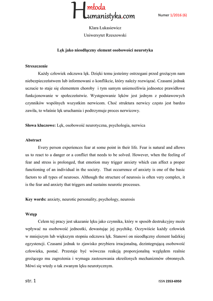Numer 1/2016 (6) Klara Łukasiewicz Uniwersytet Rzeszowski Lęk jako nieodłączny element osobowości neurotyka Streszczenie Każdy człowiek odczuwa lęk. Dzięki temu jesteśmy ostrzegani przed grożącym nam niebezpieczeństwem lub informowani o konflikcie, który należy rozwiązać. Czasami jednak uczucie to staje się elementem choroby i tym samym uniemożliwia jednostce prawidłowe funkcjonowanie w społeczeństwie. Występowanie lęków jest jednym z podstawowych czynników wspólnych wszystkim nerwicom. Choć struktura nerwicy często jest bardzo zawiła, to właśnie lęk uruchamia i podtrzymuje proces nerwicowy. Słowa kluczowe: Lęk, osobowość neurotyczna, psychologia, nerwica Abstract Every person experiences fear at some point in their life. Fear is natural and allows us to react to a danger or a conflict that needs to be solved. However, when the feeling of fear and stress is prolonged, that emotion may trigger anxiety which can affect a proper functioning of an individual in the society. That occurrence of anxiety is one of the basic factors to all types of neuroses. Although the structure of neurosis is often very complex, it is the fear and anxiety that triggers and sustains neurotic processes. Key words: anxiety, neurotic personality, psychology, neurosis Wstęp Celem tej pracy jest ukazanie lęku jako czynnika, który w sposób destrukcyjny może wpływać na osobowość jednostki, dewastując jej psychikę. Oczywiście każdy człowiek w mniejszym lub większym stopniu odczuwa lęk. Stanowi on nieodłączny element ludzkiej egzystencji. Czasami jednak to zjawisko przybiera irracjonalną, dezintegrującą osobowość człowieka, postać. Przestaje być wówczas reakcją proporcjonalną względem realnie grożącego mu zagrożenia i wymaga zastosowania określonych mechanizmów obronnych. Mówi się wtedy o tak zwanym lęku neurotycznym. str. 1 ISSN 2353-6950 Numer 1/2016 (6) Na potrzeby niniejszej pracy należy wyjaśnić, iż neurotyk, w rozumieniu potocznym, to osoba bardzo wrażliwa, określana mianem ,,czującej mocniej”. W psychologii neurotyczność stanowi przeciwieństwo równowagi emocjonalnej i oznacza cechę osobowości polegającą na silnym zachwianiu emocjonalnym o charakterze nerwicowym, niskiej odporności na stres oraz skłonności do popadania w stany lękowe. Charakteryzuje ją lęk, niska samoocena, napięcie, poczucie winy oraz przygnębienie1. Zjawisko lęku jako podstawa nerwic Lęk jest emocją, która może być wyznacznikiem zagrożenia lub też objawem prowadzącym do kompromisowego rozwiązania zewnętrznego konfliktu. Uczucie lęku jest więc powszechnie doświadczane przez ludzi i nie zawsze musi świadczyć o chorobie. Na co dzień jesteśmy bowiem zmuszeni radzić sobie z lękiem przed śmiercią, okaleczeniem, utratą atrakcyjności, przed utratą poczucia własnej wartości, lękiem separacyjnym, lękiem przed nieznajomymi, przed utratą kontroli, przed zależnością, bliskością czy też karą2. Gdy jednak lęk staje się elementem choroby, prowadzi do silnych zahamowań, uniemożliwiając tym samym prawidłowe funkcjonowanie jednostki. Występowanie lęków jest jednym z podstawowych czynników wspólnych wszystkim nerwicom. Choć struktura nerwicy często jest bardzo zawiła, to właśnie lęk uruchamia i podtrzymuje proces nerwicowy. Stanowi on ośrodek dynamiczny nerwic3. Niemal każdy człowiek wytworzył sobie określoną formę obrony przed lękiem. Jest to normalne, gdyż lęk oraz wytworzone sposoby obrony przed nim, jest zjawiskiem występującym powszechnie na całym świecie. Im bardziej osobowość jest neurotyczna, tym silniej jednostka jest określana przez mechanizmy obronne i tym więcej jest rzeczy, których nie może robić, czy też o robieniu których nawet nie myśli, mimo iż można by się tego po niej spodziewać zważając na jej żywotność, wykształcenie czy zdolności umysłowe4. Nie wszystkie lęki będą jednak oznaką neurotycznej osobowości jednostki. Jak zostało wcześniej wspomniane, uczucie lęku nie musi wcale świadczyć o chorobie. Różnica opiera się tu na dwóch następujących czynnikach. Po pierwsze neurotyk odczuwa nie tylko 1 Co to jest neurotyzm? Czym charakteryzuje się osoba neurotyczna?, http://www.centrumdobrejterapii.pl/materialy/co-to-jest-neurotyzm-czym-charakteryzuje-sie-osoba-neurotyczna/ [dostęp z dnia 20.12.2015 r.]. 2 T. Pawłowski i inni, Panic Disorder. Zaburzenie lękowe z napadami lęku, http://www.advances.am.wroc.pl/pdf/2006/15/1/163.pdf [dostęp z dnia 23.12.2015 r.]. 3 K. Horney, Neurotyczna osobowość naszych czasów, przeł. H. Grzegołowska, Dom Wydawniczy Rebis, Poznań 1993, s. 33. 4 Ibid., s. 48. str. 2 ISSN 2353-6950 Numer 1/2016 (6) lęki wspólne wszystkim członkom danej kultury5, lecz również lęki różniące się od nich pod względem jakościowym lub ilościowym6. Drugim czynnikiem, odróżniającym lęki neurotyków od innych jest fakt, iż osoba normalna, choć podlega lękom, jest w stanie realizować swoje możliwości i czerpać radość z życia. Potrafi maksymalnie wykorzystać potencjał własnej kultury, nie cierpi więc bardziej niż jest to konieczne i mimo towarzyszącego jej lęku funkcjonuje prawidłowo. Natomiast neurotyk cierpi zawsze bardziej niż przeciętna osoba. Jak zauważa Karen Horney ,,neurotyk właściwie zawsze jest człowiekiem cierpiącym”7. Za swoje środki obrony przed lękiem musi odpłacić się zahamowaniem zdolności do osiągnięć oraz szczęścia, co w konsekwencji prowadzi do rozbieżności pomiędzy jego możliwościami a osiągnięciami8. Rozdźwięk ten potęguje także cechujące neurotyków silne poczucie niższości, wzmagające ich faktyczne niepowodzenia. Ich samoocena zawiera się między skrajnościami: poczuciem wyjątkowości a zupełnej bezwartościowości, gdzie w każdej chwili mogą popaść z jednej skrajności w drugą. Wyróżnia się kilka form uświadamiania sobie lęku przez j