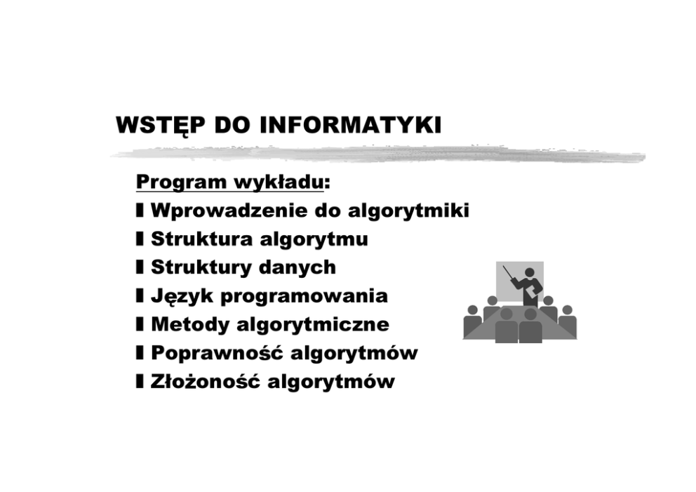 :67 3'2,1)250$7<., 3URJUDPZ\NãDGX z:SURZDG]HQLHGRDOJRU\WPLNL z6WUXNWXUDDOJRU\WPX z6WUXNWXU\GDQ\FK z- ]\NSURJUDPRZDQLD z0HWRG\DOJRU\WPLF]QH z3RSUDZQR þDOJRU\WPyZ z=ãR RQR þDOJRU\WPyZ /LWHUDWXUD z '+DUHO5]HF]RLVWRFLHLQIRUPDW\NL$OJRU\WPLND:17 z $-$KR-(+RSFURIW-'8OOPDQ6WUXNWXU\GDQ\FKLDOJRU\WP\3:1 z $-$KR-(+RSFURIW-'8OOPDQ3URMHNWRZDQLHLDQDOL]DDOJRU\WPyZ NRPSXWHURZ\FK3:1 z 1:LUWK$OJRU\WP\VWUXNWXU\GDQ\FK SURJUDP\:17Z\G z 7&RUPHQ&/HLVHUVRQ55LYHVW:SURZDG]HQLHGRDOJRU\WPyZ:17 z (:'LMNVWUD8PLHM WQR üSURJUDPRZDQLD:17Z\G z 3:UyEOHZVNL$OJRU\WP\6WUXNWXU\GDQ\FKLWHFKQLNLSURJUDPRZDQLD +HOLRQZ\G 05DZVNL :VW SGR,QIRUPDW\NL 2F]\PE G]LHPRZD" z 7HPDWHPZ\NáDGXMHVWDOJRU\WPLND z 3RM FLDSRGVWDZRZH y ]DGDQLHDOJRU\WPLF]QHLDOJRU\WP y VWUXNWXUDDOJRU\WPyZLVWUXNWXU\GDQ\FK y SRSUDZQR üLVSUDZQR üDOJRU\WPyZ 05DZVNL :VW SGR,QIRUPDW\NL " :SURZDG]HQLH z .RPSXWHU]MHGQHMVWURQ\WR y MHGQRVWNDFHQWUDOQD y PRQLWRU y NODZLDWXUD z .RPSXWHU]LQQHMVWURQ\WR y ]ELyUSU]Há F]QLNyZELWyZ y QLHZLHONDOLF]EDRSHUDFML ELW 05DZVNL :VW SGR,QIRUPDW\NL 2SHUDFMHQDELWDFK z 3U]HU]XFHQLH z :\]HURZDQLH z 6SUDZG]HQLH MH OLWHQMHVW SU]HU]XüWHQ 05DZVNL :VW SGR,QIRUPDW\NL -DNELW\WRUREL " 35267(23(5$&-(=à2 21($3/,.$&-( z 3URFHV z $OJRU\WP $/*25<70 'DQH ZHM FLRZH 05DZVNL :VW SGR,QIRUPDW\NL 352&(6 :\QLN 3U]\NãDG]NXFKQLZ]L W\ z 3LHF]HQLHFLDVWDSURFHVZ\NRQ\ZDQ\]HVNáDGQLNyZSU]H] SLHNDU]D]DSRPRF SLHFDLZHGáXJSU]HSLVX y VNáDGQLNLGDQHZHM FLRZH y FLDVWRZ\QLN y SU]HSLVDOJRU\WP z $OJRU\WP]DGDMHF]\QQR FLNWyUHVNáDGDM VL QD SURFHVLV Z\NRQ\ZDQHSU]H]VSU] W 05DZVNL :VW SGR,QIRUPDW\NL 3U]\NãDG]NXFKQLZ]L W\FG y F]\QQR FLSURFHV y DOJRU\WPSURFHV\RSURJUDPRZDQLH y SU]\ERU\SLHFVSU] W SLHNDU]WDN HPRU]HE\ü]DOLF]RQ\GRVSU] WX 35=(3,6 RSURJUDPRZDQLH 6.à$'1,., 05DZVNL 3,(&3,(.$5= 35=<%25< VSU] W 2352*5$02:$1,( .2'<$/*25<70Ï: &,$672 :VW SGR,QIRUPDW\NL '$1( :(- &,2:( .20387(5 :<1,., $OJRU\WPLNDDLQIRUPDW\ND z $OJRU\WPLNDREV]DUOXG]NLFKGRFLHND ZLHG]\LGR ZLDGF]HQLDGRW\F] FHJRDOJRU\WPyZ DOJRU\WPLND LQIRUPDW\ND z ,QIRUPDW\NDQDXNDRNRPSXWHUDFK 05DZVNL :VW SGR,QIRUPDW\NL 2GURELQ KLVWRULL z z z z z z z z (XNOLGHVURNSQHPDWHPDW\NDXWRUDOJRU\WPXZ\]QDF]DQLD 1:'GZyFKOLF]E 0XKDPPHG$OFKZDUL]PL,;ZPDWHPDW\NDXWRUUHJXáSRGVWDZRZ\FK RSHUDFMLDU\WPHW\F]Q\FKGODOLF]EG]LHVL WQ\FKáDF$OJRULVPXV -RVHSK-DFTXDUGZ\QDOD]FDNURVQDWNDFNLHJRVWHURZDQHJR G]LXUNRZDQ\PLNDUWDPL &KDUOHV%DEEDJHPDWHPDW\NZ\QDOD]FDPDV]\Q\Uy QLFRZHML DXWRUSURMHNWXPDV]\Q\DQDOLW\F]QHMVWHURZDQHMDOJRU\WPDPLNRGRZDQ\PL QDG]LXUNRZDQ\FKNDUWDFK $XJXVWD$GD.LQJPDWHPDW\F]NDSURJUDPLVWNDPDV]\Q\%DEEDJH +HUPDQ+ROOHULWKZ\QDOD]FDPDV]\Q\ZVSRPDJDM FHMVSLV SRZV]HFKQ\Z86$ 3LHUZV]HNRPSXWHU\HOHNWURQLF]QHODWD;;Z$ODQ7XULQJ+RZDUG $LNHQ-RKQ0DXFKO\-RKQYRQ1HXPDQQ ,QIRUPDW\NDVWDMHVL G\VF\SOLQ DNDGHPLFN ZSRáRZLHODW$VVRFLDWLRQ IRU&RPSXWLQJ0DFKLQHU\$&0SXEOLNXMH]DOHFHQLDSURJUDPRZHGOD SURZDG]HQLDZ\NáDGyZ 05DZVNL :VW SGR,QIRUPDW\NL 0DPNRPSXWHUMHVWHPLQIRUPDW\NLHP z =MHGQHMVWURQ\VSRURRVyEQLHZLHQLFRLQIRUPDW\FH]GUXJLHM VWURQ\V]\ENRURVQ FDJUXSDQDSR]yUZLHRQLHMZV]\VWNR z 7DNQDSUDZG REV]HUQHLZD QHIUDJPHQW\LQIRUPDW\NLQLHV ]QDQHDQLMHGQ\PDQLGUXJLP =DQLPZ\UXV]\P\Z ZLDWNRPSXWHUyZ 05DZVNL :VW SGR,QIRUPDW\NL 0R OLZR FLNRPSXWHUyZ z .RPSXWHU\V ]GROQHGR z .RPSXWHU\QLHV ZVWDQLH y DQDOL]\QLH]PLHUQHMLOR FL GDQ\FK y RNUH OLüFKRüE\Z SU]\EOL HQLXZLHNXRVRE\QD SRGVWDZLH]GM FLD y VWHURZDQLD Z\UDILQRZDQ\PLURERWDPL y ]HVWHUW\JDá ]HNXáR \ü SWDVLHJQLD]GR y PRJ JUDüZV]DFK\QD SR]LRPLHPLVWU]yZ y Z\JUDü]GZXQDVWROHWQLP DPDWRUHPSU]\PDáHM]PLDQLH UHJXáQDZHWVXSHUNRPSXWHU\ 05DZVNL :VW SGR,QIRUPDW\NL 3R]LRP\V]F]HJyãRZR FL z 3U]HSLVQDS\V]Q\NUHPF]HNRODGRZ\ y Ä:áy F]HNRODG ]GZLHPDá\ NDPLVWRáRZ\PLZRG\GRJDUQND .LHG\F]HNRODGDVL UR]SX FLGRPLHV]DMFXNLHUSXGHUGRGDMSR WURFKXPDVáR2GVWDZ8ELMDM yáWNDRNRáRPLQXWD ´ y 'ODF]HJRÄGRPLHV]DMFXNLHUSXGHU´DQLHÄZH JUDPFXNUXSXGUXZV\SJRGRF]HNRODG\FKZ\ü á\ N ´DOERMHV]F]HGRNáDGQLHMÄSRGQLH OHZ U N Z\SURVWXMSDOFH´ 05DZVNL :VW SGR,QIRUPDW\NL 3R]LRP\V]F]HJyãRZR FLFG z =HVWDZDNFMLSRGVWDZRZ\FKNWyUHDOJRU\WPPR H]OHFDü z z z %H]WHJR]HVWDZXQLHPDVHQVXV]XNDüDOJRU\WPyZ ,QVWUXNFMHSRGVWDZRZHPXV] E\üMDVQHLGRNáDGQHQLFWDNLHJRMDN ÄPLHV]DMD ]J VWQLHMH´ 2JyOQDMDNR üDOJRU\WPyZ]DOH \ZLVWRWQ\VSRVyERGZ\ERU\DNFML SRGVWDZRZ\FKLLFKVWRVRZDQLXZGDQ\PSU]\SDGNX SR]LRPV]F]HJyáRZR FL HOHPHQWDUQ\FKLQVWUXNFMLDOJRU\WPX X]JRGQLHQLH]HVWDZXRSHUDFMLSRGVWDZRZ\FK RGSRZLHGQLHJRGODUR]ZL ]\ZDQHJRSUREOHPX 7XMHVWPRZDRDOJRU\WPDFK DMHV]F]HSU]HGFKZLO E\á\RSHUDFMHQDELWDFK M ]\NLSURJUDPRZDQLD 05DZVNL :VW SGR,QIRUPDW\NL .UyWNLHDOJRU\WP\ GãXJRWUZDãHSURFHV\ z OLVWDDQNLHWRVRERZ\FK z DQNLHWD QD]ZLVNRLQQHGDQHRVRERZH]DURENL z ]DGDQLHVXPD]DURENyZZV]\VWNLFKSUDFRZQLNyZ z $/*25<70 ]DQRWXMQDERNXOLF]E SU]HJO GDMNROHMQRNZHVWLRQDULXV]HSUDFRZQLNyZGRGDM F ]DURENLND GHJR]QLFKGROLF]E\QDERNX NLHG\RVL JQLHV]NRQLHFOLVW\SRGDMZDUWR üOLF]E\QDERNX´ MDNRZ\QLN 05DZVNL :VW SGR,QIRUPDW\NL .UyWNLHDOJRU\WP\ GãXJRWUZDãHSURFHV\FG ZDUWR üOLF]E\ÄQDERNX´ 1D]ZLVNR 3áDFD $GDP%HVNL %RJGDQ'HFNL 'DQXWD+DFND 7DGHXV]:XVNL SRF] WHN æ æ æ æ æ NRQLHF 05DZVNL :VW SGR,QIRUPDW\NL .UyWNLHDOJRU\WP\ GãXJRWUZDãHSURFHV\FG z $OJRU\WPRSLVXMHZLHOHSURFHVyZ z 7HNVWDOJRU\WPXMHVWNUyWNLDOHSURFHVNWyU\RSLVXMHLNWyU\P VWHUXMH]PLHQLDVL Z]DOH QR FLRGGáXJR FLOLVW\ z 'RZ\NRQDQLDWHJR]DGDQLDEH]Z]JO G\QDGáXJR üOLVW\ Z\PDJDQDMHVWW\ONRMHGQDOLF]EDÄQDERNX z ,VWQLHMHZLHOHPR OLZ\FKGDQ\FK z $OJRU\WPSRZLQLHQ]DFKRZ\ZDüVL ]DGRZDODM FRGOD QLHVNR F]RQHMOLF]E\]HVWDZyZGDQ\FK z 'DQHPXV] E\üGRSXV]F]DOQHOLVWDSáDFDQLHOLVWD]DNXSyZ z 1DGRSXV]F]DOQH]HVWDZ\GDQ\FKZHM FLRZ\FKQDNáDGD VL SHZQ VSHF\ILNDFM F]\]áF]\PR HW\V]á 05DZVNL :VW SGR,QIRUPDW\NL =DGDQLHDOJRU\WPLF]QHLMHJR UR]ZL ]DQLH z =DGDQLHDOJRU\WPLF]QH VFKDUDNWHU\]RZDQLHZV]\VWNLFK SRSUDZQ\FKGDQ\FKZHM FLRZ\FK VSHF\ILNDFMDGRSXV]F]DOQR FL ND GHSRSUDZQHGDQH $/*25<70 6FKDUDNWHU\]RZDQLH RF]HNLZDQ\FKZ\QLNyZ MDNRIXQNFMLGDQ\FK ZHM FLRZ\FK 05DZVNL z 5R]ZL ]DQLHDOJRU\WPLF]QH :VW SGR,QIRUPDW\NL RF]HNLZDQ\Z\QLN =DGDQLHDOJRU\WPLF]QHLMHJR UR]ZL ]DQLHFG z 5R]ZL ]DQLH]DGDQLDDOJRU\WPLF]QHJR DOJRU\WP NWyU\GODND G\FKGRSXV]F]DOQ\FKGDQ\FKSRGD RGSRZLHGQLZ\QLNZ\NRQXM FSURFHVRSLVDQ\L ]DU] G]DQ\SU]H]VLHELH z àDWZR]QDOH üDOJRU\WPG]LDáDM F\GREU]HW\ONR GO