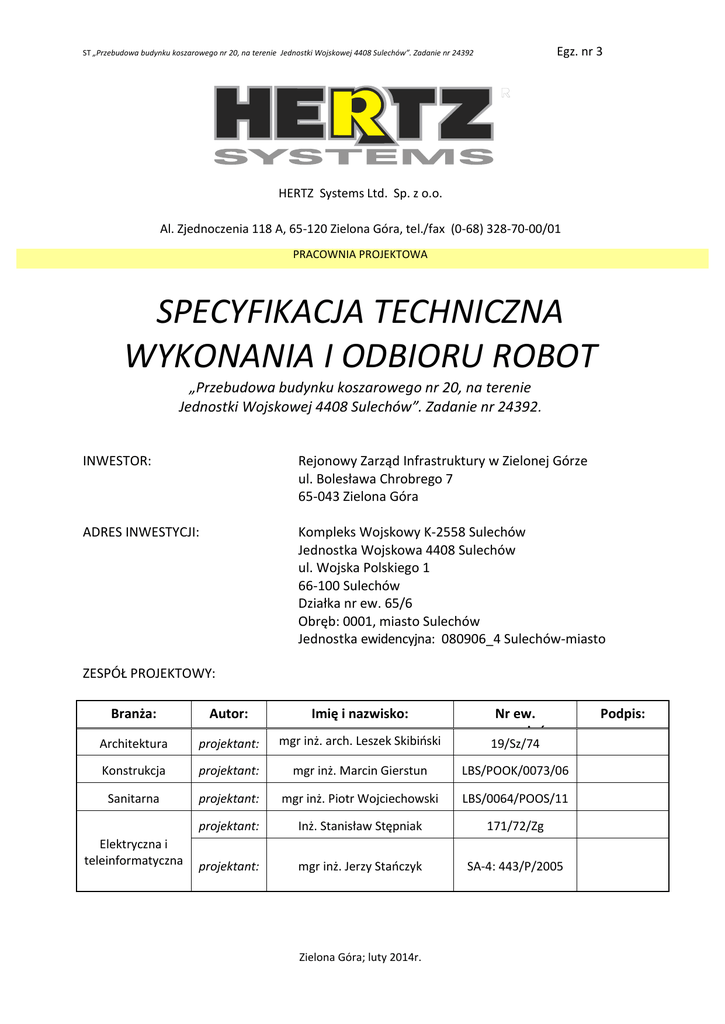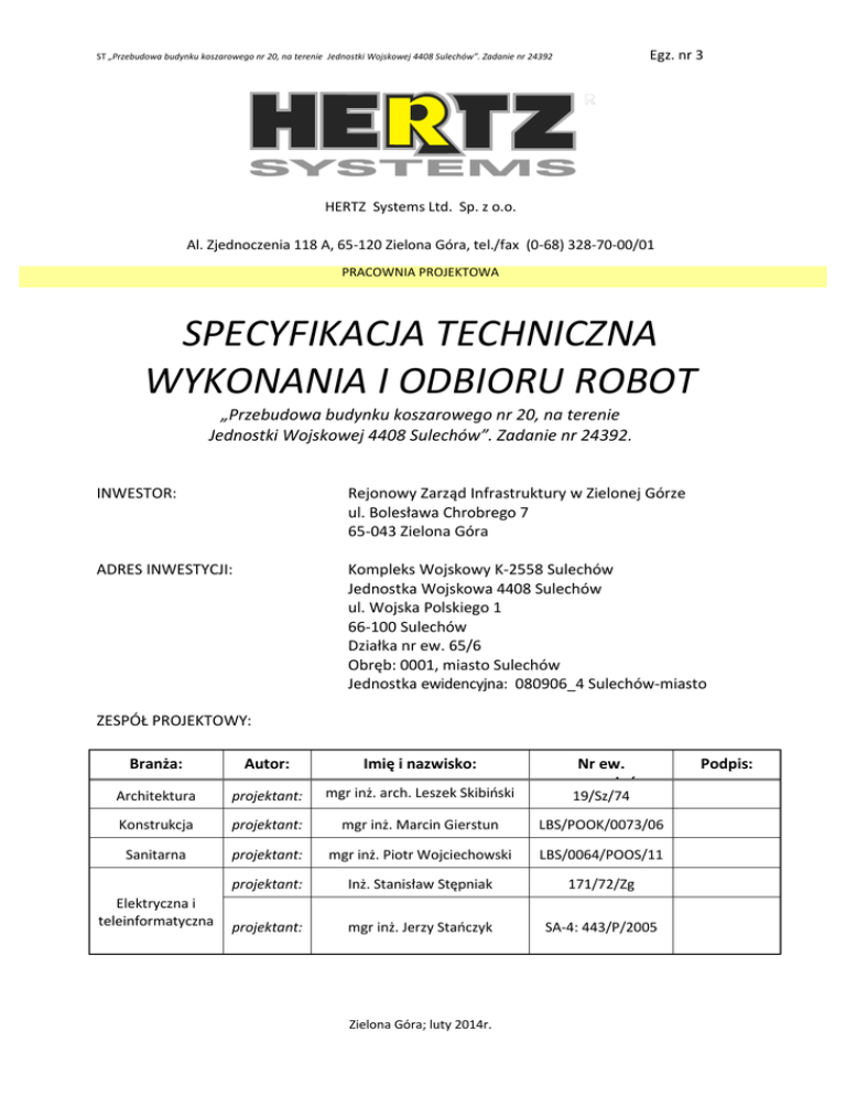 ST „Przebudowa budynku koszarowego nr 20, na terenie Jednostki Wojskowej 4408 Sulechów”. Zadanie nr 24392
