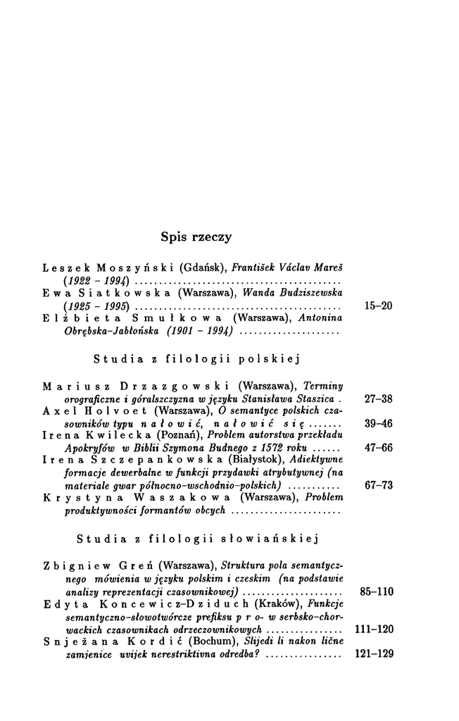 Spis rzeczy L e s z e k M o s z y ñ s k i (Gdañsk), Frantisek Vaclav Mares E waS (1922-1994) i a t k o w s k a (Warszawa), Wanda Budziszewska E l ¿b i e t a (1925-1995) Sm u ³ k o w a (Warszawa), Antonina 15-20 Obrêbska-Jabloñska (1901-1994) Studia z filologii polskiej M a r i li S z D r z a z g o w s k i (Warszawa), Terminy orograficznei góralszczyznaw jêzyku Stanis³awaStaszica A x e l H o l v o e t (Warszawa), O semantycepolskich czaI r e n a K w i l e c k a (Poznañ), Problem autorstwa przek³adu o sowników typu n a l o w i Æ, n a l o w i Æ s i ê Apokryfów w Biblii SzymonaBudnegoz 1572 roku I r e n a S z c z e p a n k o w s k a (Bia³ystok), Adiektywne formacje dewerbalnew funkcji przydawki atrybutywnej (na Kry s t y n a Was z a k o w a (Warszawa), Problem o gwarpólnocno-wschodnio-polskich) materiale o o o o o o produktywnoœci formantów Studia z filologii Z b i g fi i e w G reñ obcych. 27-38 39-46 47-66 67-73 . . . . . . . . . ooooo. o. oo. . o s³owiañskiej (Warszawa),Struktura pola semantycz- nego mówienia w jêzyku polskim i czeskim (na podstawie analizy reprezentacji czasownikowej)o o o . o o o o o o o o . o . . . . o . . 85-110 E d Y t a K a fi c e w i c z-D z i d o c h (Kraków), Funkcje semantyczno-s³owotwórczeprefiksu p r 0- w serbsko-chorwackich czasownikachodrzeczownikowych. 111-120 S fi j e Z a fi a Kar d i æ (Bachom), Slijedi li nakon licne zamienice uviiek nerestriktivna odredba? 121-129 ..00 000. 000 0'...0.00000 00 00 00 00 6 Spis rzeczy M a ³ g o r z a t a Kor y t k o w s k a (Warszawa), Imperceptywnoœæw jêzyku bu³garskim i polskim a struktura M atekstu p H.fI A. O C H n o B a (Moskwa), O CA08006pa308ameAbHbtX pa3Au'tUKX M,e:JIC(Jy cAa8KHC~UM,U K3bt~aM,u: 165-179 j y t i v -o .. jów rosyjskich formacji przymiotnikowych zakoñczonych na J a n u s z R i e g e r (Warszawa), O polskich wp³ywach leksy- pa38umuK 147-164 amanw Przyczynek do dzie- (Jpe8Heilwue B o g u m i ³ O s t r o w s k i (Kraków), 131-145 kalnych na gwary ukraiñskie (na przyk³adzie gwar bojkow- 181-192 niki motywowane w dawnej ukraiñskiej gwarze nadsañskiej I r e n a S e rak o w a (Budziszyn), Werbalny substantiw wot rejleksiwneho werba w zapadnos³owjanskich retach (z 193-212 J a d w i g a 213-224 W a n i a k o w a (Kraków), serbsæiny) wobkedŸbowanjom wosebitym skich) E l ¿ b i e t a R u d o l f-Z i ó ³ k o w s k a (Warszawa), Rzeczow- Derywaty z ps. rdzeniem t u c h- i t r; c h- w jêzyku polskim i innych jêzykach s³owia7iskich na tle indoeuropejskim.. .......... 225-243 B jor n W i e m e r (Hamburg/Warszawa), KAaccutjJu~a1³UK HYAe8btX c~a3ye.AlbtX 8 Pycc~OM, K3bt~e no UX Ae~cu'tec~uM, u petjJepeH1³UaAbHbt.J.1xapa~mepucmu~a.A1 . . .. .. .. . . . . . .. kobiece imiona E w a W o l n i c z-P a w ³ o w s k a (Warszawa), £emkowskie A n n a Z i e l i ñ s k a (Warszawa), Jêzyk rosyjski, polski i niemiecki w mowie staroobrzêdowców polskich 245-273 275-295 297-305 Polemiki K w i r y fi a H a fi d k e (Warszawa), O Praktycznym s³owniku wspó³czesnejpolszczyzny. . . . . . . . . . . . . . . . . . . . . . 307-314 M a r i a fi Jur k o w s k i (Warszawa); O praktycznoœci "Praktycznego s³ownika wspó³czesnej polszczyzny" . . 315-320 J 11d w i g a P u z y fi i fi a, Kry s t y fi a Was z a k o w a (Warsza\va), I(rytycznie o nowym s³owniku jêzyka polskiego. . . . . . . . . . . . . . . . . . . . . . . . . . . . . . . . . . . . . . . . . . . . . . . . . . . 321-346 Jer z y T r e d e r (Gdañsk), Ocena drugiej czêœci"S³ownika" Stefana Ramu³la w opracowaniuHaliny Horodyskiej 347-367 7 Spis rzeczy Recenzje zof i a K a l e t a (Kraków), rec.: Pe'³HUJI:Ha npe3U.MUHjama Jl:ail MaJl:eiJoH'l³Ume,red. TpajKo CTaMaTocKH, T. I, A-JIj, I1HcTHTYT 3a MaKe)1.0HCKH ja3HK "KpcTe MHCHpKOB", J a c e k P e r l i n (Warszawa), rec.: La slavistica in Italia. CKonje 1994, ss. 768 369-374 487 ss. 1994, Roma Ambientali, e Culturali Cinquant'anni di studŸ(1940-1990), Ministero per i Beni K a z i m i e r z P o l a ñ s k i (Kraków), rec.: Reinhold 375-378 Olesch, GesammelteAufsiitze, Herausgegebenvon Angelika Lauhus. Tom I, Dravaenopolabica,Tom II, Cetera slavica, Bahlau Verlag, KaIn Weimar Wien 1989,ss. 475, 1992,ss. D a n u t a R y t e I-K u c (Warszawa), rec.: Barbel 379-383 537 139 ss. 1993, Mein am Lang, Peter lag skrótów Spis Ksi¹¿ki nades³ane Frankfurt Miemietz, Motivation zur Motion. Zur Bezeichnung von Frauen durch Feminina und Maskulina im Polnischen,Ver385-391 393-400 401