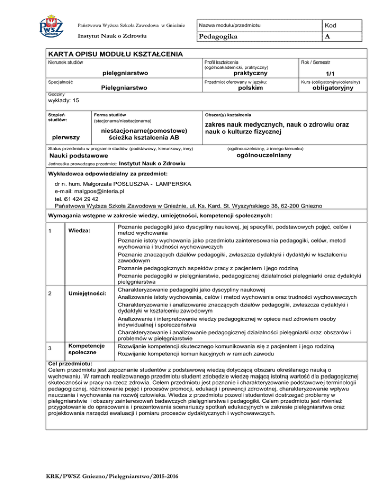 Państwowa Wyższa Szkoła Zawodowa w Gnieźnie Nazwa modułu/przedmiotu Kod Instytut Nauk o Zdrowiu Pedagogika A KARTA OPISU MODUŁU KSZTAŁCENIA Kierunek studiów Profil kształcenia (ogólnoakademicki, praktyczny) pielęgniarstwo Specjalność praktyczny Przedmiot oferowany w języku: Pielęgniarstwo Rok / Semestr 1/1 Kurs (obligatoryjny/obieralny) polskim obligatoryjny Godziny wykłady: 15 Stopień studiów: Forma studiów (stacjonarna/niestacjonarna) pierwszy niestacjonarne(pomostowe) ścieżka kształcenia AB Status przedmiotu w programie studiów (podstawowy, kierunkowy, inny) zakres nauk medycznych, nauk o zdrowiu oraz nauk o kulturze fizycznej (ogólnouczelniany, z innego kierunku) ogólnouczelniany Nauki podstawowe Jednostka prowadząca przedmiot: Obszar(y) kształcenia Instytut Nauk o Zdrowiu Wykładowca odpowiedzialny za przedmiot: dr n. hum. Małgorzata POSŁUSZNA - LAMPERSKA e-mail: [email protected] tel. 61 424 29 42 Państwowa Wyższa Szkoła Zawodowa w Gnieźnie, ul. Ks. Kard. St. Wyszyńskiego 38, 62-200 Gniezno Wymagania wstępne w zakresie wiedzy, umiejętności, kompetencji społecznych: 1 Wiedza: 2 Umiejętności: 3 Kompetencje społeczne Poznanie pedagogiki jako dyscypliny naukowej, jej specyfiki, podstawowych pojęć, celów i metod wychowania Poznanie istoty wychowania jako przedmiotu zainteresowania pedagogiki, celów, metod wychowania i trudności wychowawczych Poznanie znaczących działów pedagogiki, zwłaszcza dydaktyki i dydaktyki w kształceniu zawodowym Poznanie pedagogicznych aspektów pracy z pacjentem i jego rodziną Poznanie pedagogiki w pielęgniarstwie, pedagogicznej działalności pielęgniarki oraz dydaktyki pielęgniarstwa Charakteryzowanie pedagogiki jako dyscypliny naukowej Analizowanie istoty wychowania, celów i metod wychowania oraz trudności wychowawczych Charakteryzowanie i analizowanie znaczących działów pedagogiki, zwłaszcza dydaktyki i dydaktyki w kształceniu zawodowym Analizowanie i interpretowanie wiedzy pedagogicznej w opiece nad zdrowiem osoby indywidualnej i społeczeństwa Charakteryzowanie i analizowanie pedagogicznej działalności pielęgniarki oraz obszarów i problemów w pielęgniarstwie Rozwijanie kompetencji skutecznego komunikowania się z pacjentem i jego rodziną Rozwijanie kompetencji komunikacyjnych w ramach zawodu Cel przedmiotu: Celem przedmiotu jest zapoznanie studentów z podstawową wiedzą dotyczącą obszaru określanego nauką o wychowaniu. W ramach realizowanego przedmiotu student zdobędzie wiedzę mającą istotną wartość dla pedagogicznej skuteczności w pracy na rzecz zdrowia. Celem przedmiotu jest poznanie i charakteryzowanie podstawowej terminologii pedagogicznej, różnicowanie pojęć i procesów promocji, edukacji i prewencji zdrowotnej, charakteryzowanie wpływu nauczania i wychowania na rozwój człowieka. Wiedza z przedmiotu pozwoli studentowi dostrzegać problemy w pielęgniarstwie i obszary zainteresowań badawczych pielęgniarstwa i pedagogiki. Celem przedmiotu jest również przygotowanie do opracowania i prezentowania scenariuszy spotkań edukacyjnych w zakresie pielęgniarstwa oraz projektowania narzędzi ewaluacji i pomiaru procesów dydaktycznych i wychowawczych. KRK/PWSZ Gniezno/Pielęgniarstwo/2015-2016 Państwowa Wyższa Szkoła Zawodowa w Gnieźnie Nazwa modułu/przedmiotu Kod Instytut Nauk o Zdrowiu Pedagogika A Efekty kształcenia Wiedza W wyniku przeprowadzonych zajęć student: Odniesienie do Kierunkowych Efektów Kształcenia 1 Zna problematykę relacji człowiek – środowisko społeczne; B.W2. 2 Charakteryzuje istotę i strukturę zjawisk zachodzących w procesie przekazywania i wymiany informacji; B.W6. 3 Definiuje modele i style komunikacji interpersonalnej; B.W7. 4 5 6 7 8 9 10 Rozumie procesy poznawcze i różnicuje zachowania prawidłowe, zaburzone i patologiczne; Definiuje i interpretuje zjawisko nierówności klasowej, etnicznej, płci i dyskryminacji; Objaśnia podstawowe pojęcia i zagadnienia z zakresu pedagogiki jako nauki stosowanej i procesu wychowania w aspekcie zjawiska społecznego (chorowania, zdrowienia, hospitalizacji, umierania); Wykazuje znajomość procesu kształcenia w ujęciu edukacji zdrowotnej; Zna problematykę metodyki edukacji zdrowotnej w odniesieniu do dzieci, młodzieży i dorosłych; Klasyfikuje czynniki warunkujące zdrowie w ujęciu jednostkowym i globalnym; Wyjaśnia założenia modeli edukacji zdrowotnej, w tym model medycyny rodzinnej, rolę i zadania pielęgniarki podstawowej opieki zdrowotnej; Umiejętności W wyniku przeprowadzonych zajęć student: B.W14. B.W15. B.W16. B.W17. B.W18. B.W27. B.W31. Odniesienie do Kierunkowych Efektów Kształcenia 1 Ocenia wpływ choroby, hospitalizacji i innych sytuacji trudnych na stan fizyczny, psychiczny i funkcjonowanie społeczne człowieka; B.U2. 2 Analizuje postawy, proces ich kształtowania i zmiany; B.U5. 3 Zna psychospołeczne aspekty wychowania seksualnego i prorodzinnego; B.U8. 4 Kontroluje błędy i bariery w procesie komunikowania; B.U9. 5 Wykazuje umiejętność aktywnego słuchania; B.U10. 6 Tworzy warunki prawidłowej komunikacji pielęgniarka – pacjent oraz pielęgniarka – personel medyczny; B.U12. 7 Analizuje i krytycznie ocenia zjawisko dyskryminacji i rasizmu; B.U15. 8 9 10 Kontroluje i koordynuje działania zapobiegające dewiacjom i patologiom wśród dzieci i młodzieży; Opracowuje projekty pielęgniarskich działań prozdrowotnych w środowisku zamieszkania, edukacji i pracy; Szanuje godność osoby ludzkiej w relacji z podopiecznym i jego rodziną; KRK/PWSZ Gniezno/Pielęgniarstwo/2015-2016 B.U16. B.U19. B.U28. Państwowa Wyższa Szkoła Zawodowa w Gnieźnie Nazwa modułu/przedmiotu Kod Instytut Nauk o Zdrowiu Pedagogika A Kompetencje W wyniku przeprowadzonych zajęć student: Szanuje godność i autonomię osób powierzonych opiece; 1 ABCD.K1. Systematycznie wzbogaca wiedzę zawodową i kształtuje umiejętności, dążąc do profesjonalizmu; Wykazuje odpowiedzi