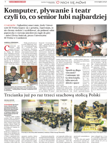 4 Czarnków Trzcianka NaGłos O Czarnków Trzcianka NaGłos 6 marca 2013 www.naglos.com.pl Komputer, pływanie i teatr czyli to, co senior lubi najbardziej GABRIELA CIŻMOWSKA – Matką pomysłu jest pani poseł Małgorzata Janyska – przyznają zgodnie prezes i wiceprezes UTW w Czarnkowie. – Rzuciła hasło i trzeba było w krótkim czasie napisać wniosek. Udało się, chociaż startowaliśmy w ciemno. Inauguracja roku akademickiego odbyła się w październiku, a w listopadzie dostaliśmy dopiero pieniądze. Duża zasługa w początkach organizacji pierwszej pani prezes Małgorzaty [email protected] C FOT. GABRIELA CIŻMOWSKA zarnkowski uniwersytet, jeden z grona 400 UTW w Polsce, ma historię krótką, ale dokonań sporo. Zakładając stowarzyszenie organizatorzy liczyli, że w pierwszym semestrze na zajęcia uczęszczało będzie 40 osób, tymczasem już zapisało się 75 słuchaczy, a kolejni pytają o przyszły semestr i rezerwują miejsca. Emerytura kojarzy się z końcem świata. Tymczasem my rozpoczęłyśmy nowy etap w życiu: nic nie musimy, ale dużo możemy... – mówią prezes (z prawej) i wiceprezes UTW w Czarnkowie Kasprzak i ówczesnego zarządu – opowiada Grażyna Jęśko-Sołtysiak, obecna wiceprezes UTW. W ciągu krótkiego czasu słuchacze czarnkowskiego uniwersytetu zdążyli już uczestniczyć w warsztatach fotograficznych, budowania relacji z otoczeniem; komunikacji interpersonalnej. Byli także w teatrze w Poznaniu; odwiedzili Muzeum Narodowe w Poznaniu, byli na wycieczce w Gnieźnie, w kinie w Pile i przede wszystkim wiele razy w aquaparku. Zajęcia odbywają się według ustalonego porządku. Studenci pracują w następujących sekcjach: język angielski, niemiecki; grupa informatyczna, plastyczna, wiedzy o regionie połączonej z turystyką; pływanie i gimnastyka. Wielką popularnością cieszy się sekcja pływacka. Słuchacze, a głównie słuchaczki, chętnie uczą się pływać zarówno od podstaw, jak i doskonalą swoje umiejętności. Zajęcia rozpisane są na cały tydzień. W ponie- FOT. ARCHIWUM UTW W CZARNKOWIE CZARNKÓW | Najbardziej smuci mnie, kiedy Uniwersytet III Wieku kojarzy się z geriatrią. Zapewniam, że nie chcemy siedzieć i szydełkować, ale podnosić sobie poprzeczkę w rozwoju umysłowym ciągle do góry – mówi Elwira Stańczak, prezes Uniwersytetu III Wieku w Czarnkowie Słuchaczy UTW w Czarnkowie jest w pierwszym semestrze dużo więcej, niż na starcie zakładano wynika z ankiety, jaką przeprowadzono po pierwszym semestrze – Pracy jest dużo – mówią pa nie prezes i wiceprezes, k t ó r e na pierwszy rzut oka już widać, zasypane są pap i e r a mi. – Prowadzenie stowarzysze nia, to jak prowadze nie przed się bior stwa. Trzeba pilnować księgowości, sprawozdawczości; rozliczeń – opowiada Grażyna działki odbywają się wykłady audytoryjne, które cieszą się du żym po wo dze niem. W marcu na przykład, z okazji Dnia Kobiet, studenci wysłuchają interesującej prelekcji: „Wieczna Ewa, Afrodyta, Kobieta”. Najwięcej seniorów, jak się okazało, zainteresowanych jest zajęciami kom pu te ro wymi, aerobikiem i pływaniem. Z zajęć dodatkowych, studenci najchętniej wybierać by chcieli teatr, balet i koncerty – tak ” Sposób na długowieczność? Codziennie: kilka stron książki, kilka nowych słówek i spacer Jęśko-Sołtysiak, wiceprezes stowarzyszenia, w przeszłości, na szczęście – jak dodaje – wiceprezes dużej spółki. – Jesteśmy zadowolone, ale i zmęczone – kończy. – Filozof, którego szanuję Tadeusz Kotarbiński, powiedział: O długowieczności można myśleć, jeśli codziennie przeczyta się kilka stron książki, nauczy się kilku nowych słówek i pospaceruje pół godziny, patrząc na świat. Podoba mi się ta myśl i staram się tak żyć – mówi refleksyjnie prezes Elwira Stańczak, dodając, że w Uniwersytecie złapała wiatr w żagle i bardzo jej się ta aktywność podoba. Trzcianka już po raz trzeci szachową stolicą Polski MICHAŁ NICPOŃ FOT MICHAŁ NICPOŃ WYDARZENIE Igor Kovalenko z Ukrainy został zwycięzcą trzeciego już Memoriału Szachowego Ferdynanda Dziedzica w Trzciance. Udział w imprezie wzięło ponad 150 zawodników. Czołówkę tabeli wyników turnieju, który w niedzielę trwał w trzcianeckiej hali widowiskowej wysoko obsadzili Polacy. Kolejne miejsca zajęli bowiem: Marcin Tazbir (2), Radosław Wojtaszek (3), Marcin Szelag (4) i Łukaszy Cyborowski (5). Turniej w Trzciance to królewska gra w najlepszym wydaniu, to też największy jednodniowy turniej szachowy w Polsce o najwyższej światowej randze nadanej przez Międzynarodową Federację. Jednak Trzcianka to przede wszystkim wielka frajda dla FOT. MICHAŁ NICPOŃ [email protected] W turnieju co roku biorą udział zawodowcy i amatorzy z Polski i Europy Wschodniej Zwycięzca turnieju otrzymał 6 tysięcy złotych. Pula nagród: 25 tys. amatorów szachów, którzy dzięki otwartej formule zawodów mają możliwość zagrać i porozmawiać z najlepszymi szachistami w Polsce. sportowych i pomysłodawca turnieju. W tym roku pula nagród pieniężnych wyniosła ponad 25 tysięcy złotych. Zwy- – To już trzecia edycja Memoriału Ferdynanda Dziedzica i z dumą mogę powiedzieć, że przez te dwa poprzednie lata udało nam się wypraco- wać naprawdę solidną markę, która jest ważnym wydarzeniem na turniejowej mapie szachowej – mówi Maciej Cybulski, organizator ds. cięzca wzbogacił się o 6 tys. zł, a zawodnicy uplasowani na kolejnych, niższych, miejscach o kwoty od 4 do 1,5 tysiąca złotych.