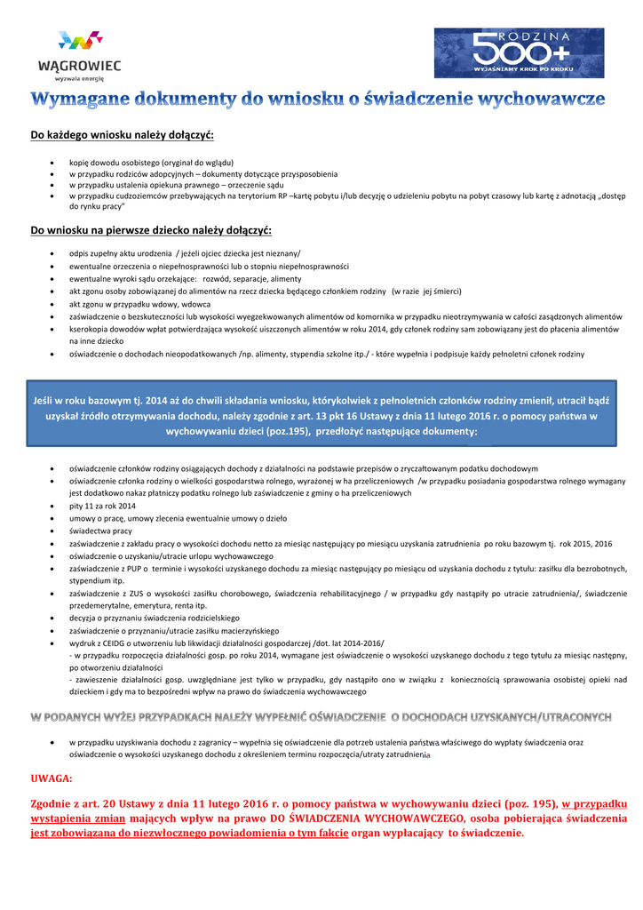 Do każdego wniosku należy dołączyć: kopię dowodu osobistego (oryginał do wglądu) w przypadku rodziców adopcyjnych – dokumenty dotyczące przysposobienia w przypadku ustalenia opiekuna prawnego – orzeczenie sądu w przypadku cudzoziemców przebywających na terytorium RP –kartę pobytu i/lub decyzję o udzieleniu pobytu na pobyt czasowy lub kartę z adnotacją „dostęp do rynku pracy” Do wniosku na pierwsze dziecko należy dołączyć: odpis zupełny aktu urodzenia / jeżeli ojciec dziecka jest nieznany/ ewentualne orzeczenia o niepełnosprawności lub o stopniu niepełnosprawności ewentualne wyroki sądu orzekające: rozwód, separacje, alimenty akt zgonu osoby zobowiązanej do alimentów na rzecz dziecka będącego członkiem rodziny (w razie jej śmierci) akt zgonu w przypadku wdowy, wdowca zaświadczenie o bezskuteczności lub wysokości wyegzekwowanych alimentów od komornika w przypadku nieotrzymywania w całości zasądzonych alimentów kserokopia dowodów wpłat potwierdzająca wysokość uiszczonych alimentów w roku 2014, gdy członek rodziny sam zobowiązany jest do płacenia alimentów na inne dziecko oświadczenie o dochodach nieopodatkowanych /np. alimenty, stypendia szkolne itp./ ‐ które wypełnia i podpisuje każdy pełnoletni członek rodziny Jeśli w roku bazowym tj. 2014 aż do chwili składania wniosku, którykolwiek z pełnoletnich członków rodziny zmienił, utracił bądź uzyskał źródło otrzymywania dochodu, należy zgodnie z art. 13 pkt 16 Ustawy z dnia 11 lutego 2016 r. o pomocy państwa w wychowywaniu dzieci (poz.195), przedłożyć następujące dokumenty: oświadczenie członków rodziny osiągających dochody z działalności na podstawie przepisów o zryczałtowanym podatku dochodowym oświadczenie członka rodziny o wielkości gospodarstwa rolnego, wyrażonej w ha przeliczeniowych /w przypadku posiadania gospodarstwa rolnego wymagany jest dodatkowo nakaz płatniczy podatku rolnego lub zaświadczenie z gminy o ha przeliczeniowych pity 11 za rok 2014 umowy o pracę, umowy zlecenia ewentualnie umowy o dzieło świadectwa pracy zaświadczenie z zakładu pracy o wysokości dochodu netto za miesiąc następujący po miesiącu uzyskania zatrudnienia po roku bazowym tj. rok 2015, 2016 oświadczenie o uzyskaniu/utracie urlopu wychowawczego zaświadczenie z PUP o terminie i wysokości uzyskanego dochodu za miesiąc następujący po miesiącu od uzyskania dochodu z tytułu: zasiłku dla bezrobotnych, stypendium itp. zaświadczenie z ZUS o wysokości zasiłku chorobowego, świadczenia rehabilitacyjnego / w przypadku gdy nastąpiły po utracie zatrudnienia/, świadczenie przedemerytalne, emerytura, renta itp. decyzja o przyznaniu świadczenia rodzicielskiego zaświadczenie o przyznaniu/utracie zasiłku macierzyńskiego wydruk z CEIDG o utworzeniu lub likwidacji działalności gospodarczej /dot. lat 2014‐2016/ ‐ w przypadku rozpoczęcia działalności gosp. po roku 2014, wymagane jest oświadczenie o wysokości uzyskanego dochodu z tego tytułu za miesiąc następny, po otworzeniu działalności ‐ zawieszenie działalności gosp. uwzględniane jest tylko w przypadku, gdy nastąpiło ono w związku z koniecznością sprawowania osobistej opieki nad dzieckiem i gdy ma to bezpośredni wpływ na prawo do świadczenia wychowawczego w przypadku uzyskiwania dochodu z zagranicy – wypełnia się oświadczenie dla potrzeb ustalenia państwa właściwego do wypłaty świadczenia oraz oświadczenie o wysokości uzyskanego dochodu z określeniem terminu rozpoczęcia/utraty zatrudnienia UWAGA: Zgodniezart.20Ustawyzdnia11lutego2016r.opomocypaństwawwychowywaniudzieci(poz.195),wprzypadku wystąpienia zmian mających wpływ na prawo DO ŚWIADCZENIA WYCHOWAWCZEGO, osoba pobierająca świadczenia jestzobowiązanadoniezwłocznegopowiadomieniaotymfakcieorganwypłacającytoświadczenie.