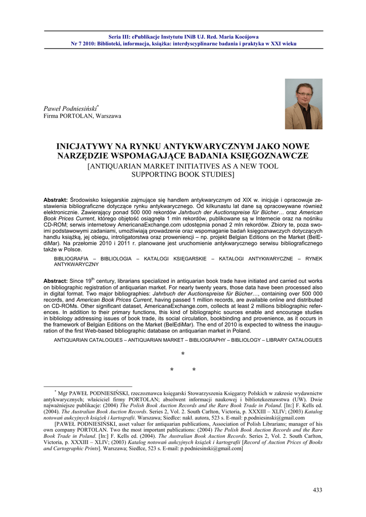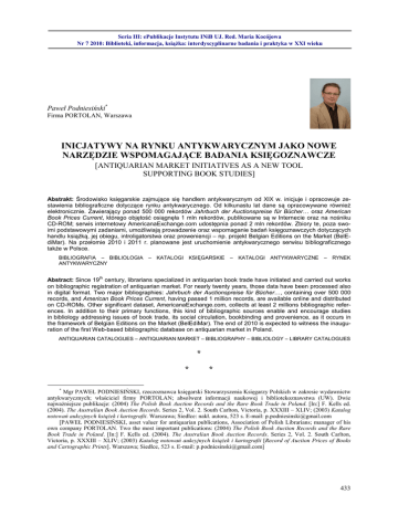 Seria III: ePublikacje Instytutu INiB UJ. Red. Maria Kocójowa Nr 7 2010: Biblioteki, informacja, książka: interdyscyplinarne badania i praktyka w XXI wieku Paweł Podniesiński* Firma PORTOLAN, Warszawa INICJATYWY NA RYNKU ANTYKWARYCZNYM JAKO NOWE NARZĘDZIE WSPOMAGAJĄCE BADANIA KSIĘGOZNAWCZE [ANTIQUARIAN MARKET INITIATIVES AS A NEW TOOL SUPPORTING BOOK STUDIES] Abstrakt: Środowisko księgarskie zajmujące się handlem antykwarycznym od XIX w. inicjuje i opracowuje zestawienia bibliograficzne dotyczące rynku antykwarycznego. Od kilkunastu lat dane są opracowywane również elektronicznie. Zawierający ponad 500 000 rekordów Jahrbuch der Auctionspreise für Bücher… oraz American Book Prices Current, którego objętość osiągnęła 1 mln rekordów, publikowane są w Internecie oraz na nośniku CD-ROM; serwis internetowy AmericanaExchange.com udostępnia ponad 2 mln rekordów. Zbiory te, poza swoimi podstawowymi zadaniami, umożliwiają prowadzenie oraz wspomaganie badań księgoznawczych dotyczących handlu książką, jej obiegu, introligatorstwa oraz proweniencji – np. projekt Belgian Editions on the Market (BelEdiMar). Na przełomie 2010 i 2011 r. planowane jest uruchomienie antykwarycznego serwisu bibliograficznego także w Polsce. BIBLIOGRAFIA – BIBLIOLOGIA – KATALOGI KSIĘGARSKIE – KATALOGI ANTYKWARYCZNE – RYNEK ANTYKWARYCZNY th Abstract: Since 19 century, librarians specialized in antiquarian book trade have initiated and carried out works on bibliographic registration of antiquarian market. For nearly twenty years, those data have been processed also in digital format. Two major bibliographies: Jahrbuch der Auctionspreise für Bücher…, containing over 500 000 records, and American Book Prices Current, having passed 1 million records, are available online and distributed on CD-ROMs. Other significant dataset, AmericanaExchange.com, collects at least 2 millions bibliographic references. In addition to their primary functions, this kind of bibliographic sources enable and encourage studies in bibliology addressing issues of book trade, its social circulation, bookbinding and provenience, as it occurs in the framework of Belgian Editions on the Market (BelEdiMar). The end of 2010 is expected to witness the inauguration of the first Web-based bibliographic database on antiquarian market in Poland. ANTIQUARIAN CATALOGUES – ANTIQUARIAN MARKET – BIBLIOGRAPHY – BIBLIOLOGY – LIBRARY CATALOGUES * * * * Mgr PAWEŁ PODNIESIŃSKI, rzeczoznawca księgarski Stowarzyszenia Księgarzy Polskich w zakresie wydawnictw antykwarycznych; właściciel firmy PORTOLAN; absolwent informacji naukowej i bibliotekoznawstwa (UW). Dwie najważniejsze publikacje: (2004) The Polish Book Auction Records and the Rare Book Trade in Poland. [In:] F. Kells ed. (2004). The Australian Book Auction Records. Series 2, Vol. 2. South Carlton, Victoria, p. XXXIII – XLIV; (2003) Katalog notowań aukcyjnych książek i kartografii. Warszawa; Siedlce: nakł. autora, 523 s. E-mail: [email protected] [PAWEŁ PODNIESIŃSKI, asset valuer for antiquarian publications, Association of Polish Librarians; manager of his own company PORTOLAN. Two the most important publications: (2004) The Polish Book Auction Records and the Rare Book Trade in Poland. [In:] F. Kells ed. (2004). The Australian Book Auction Records. Series 2, Vol. 2. South Carlton, Victoria, p. XXXIII – XLIV; (2003) Katalog notowań aukcyjnych książek i kartografii [Record of Auction Prices of Books and Cartographic Prints]. Warszawa; Siedlce, 523 s. E-mail: [email protected]] 433 Seria III: ePublikacje Instytutu INiB UJ. Red. Maria Kocójowa Nr 7 2010: Biblioteki, informacja, książka: interdyscyplinarne badania i praktyka w XXI wieku GENEZA CENNIKÓW ANTYKWARYCZNYCH Katalogi księgarskie są źródłem w badaniach księgoznawczych odkąd zaczęto uprawiać tę dyscyplinę nauki. Informacje w nich zawarte nierzadko były ważnym materiałem przy przygotowaniu różnego rodzaju bibliografii, prac związanych z historią drukarstwa, obiegu i recepcji książki. Szczególne miejsce wśród katalogów księgarskich zajmują katalogi antykwaryczne – aukcyjne (przygotowywane na potrzeby licytacji) oraz ofertowe (sporządzane na potrzeby normalnej sprzedaży). Ich zawartość, poza podstawowymi informacjami bibliograficznymi, zawiera także różnie wiadomości ciekawe z punktu widzenia bibliologa. Aukcje książek, a co za tym idzie i wydawanie katalogów aukcyjnych, sięgają swoją genezą targów frankfurckich, gdzie w 1564 r. Georg Willer z Augsburga miał jakoby zorganizować pierwszą aukcję. Informacje dotyczące tego faktu są niekompletne i do dziś budzą pewne wątpliwości, np. sugestie, iż wydany przez Willera katalog nie był katalogiem aukcyjnym, tylko katalogiem targowym [Encyklopedia wiedzy o książce 1971, szp. 2321: Targi księgarskie]. Od początku XVIII w. aukcyjna forma sprzedaży książek spopularyzowała się w Holandii, Anglii, Francji i Niemczech. Pruski Królewiec jest miejscem licytacji księgarskich już od 1663 r., a do końca XVIII wieku, jak podaje Janusz Tondel, w Królewcu „było co najmniej 109, a w rzeczywistości przecież znacznie więcej” aukcji książek [Tondel 2001, s. 133]. Pierwsza udokumentowana aukcja na terenie dzisiejszej Polski odbyła się w 1672 r. w Gdańsku. Iwona Imańska precyzuje liczbę aukcji przeprowadzonych w XVIII w. w Gdańsku do 290 licytacji, w Toruniu prawie 50, zaś w Elblągu niewiele ponad 20 aukcji [Imańska 1993, s. 108]. W dalszych badaniach, tym razem dotyczących wyłącznie XVIII-wiecznych aukcji toruńskich, autorka doliczyła się 75 licytacji, z których aż 66 było stricte książkowych [Imańska 2001, s. 22-27]. W Warszawie tę formę sprzedaży książek wprowadził w 1762 r. Michał Gröll – „uprzywilejowany aukcjonator JKMci” [Zawadzki 1998, s. 7]. Obecnie wartość informacji bibliograficznej zawartej w katalogach antykwarycznych wydaje się