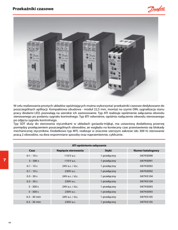 Przekaźniki czasowe W celu realizowania prostych układów opóźniających można wykorzystać przekaźniki czasowe dedykowane do poszczególnych aplikacji. Kompaktowa obudowa - moduł 22,5 mm, montaż na szynie DIN, sygnalizacja stanu pracy diodami LED, pozwalają na szerokie ich zastosowanie. Typ ATI realizuje opóźnienie załączania obwodu sterowanego po podaniu sygnału kontrolnego. Typ BTI odwrotnie, opóźnia rozłączenie obwodu sterowanego po zdjęciu sygnału kontrolnego. Typ SDT służy do sterowania stycznikami w układach gwiazda-trójkąt, ma ustawioną dodatkową przerwę pomiędzy przełączeniem poszczególnych obwodów, ze względu na konieczny czas przestawienia się blokady mechanicznej styczników. Dodatkowo typ MTI, realizuje w znacznie szerszym zakresie (do 300 h) sterowanie pracą 2 obwodów, na dwa wspomniane sposoby oraz naprzemiennie, cyklicznie. ATI opóźnienie załączania Czas Napięcie sterowania Styki Numer katalogowy 0.1 - 10 s 110 V a.c. 1 przełączny 047H3090 110 V a.c. 1 przełączny 047H3091 0.1 - 10 s 24V a.c. / d.c. 1 przełączny 047H3092 0.1 - 10 s 230V a.c. 1 przełączny 047H3092 0.3 - 30 s 24V a.c. / d.c. 1 przełączny 047H3104 0.3 - 30 s 230V a.c. 1 przełączny 047H3104 3 - 300 s 24V a.c. / d.c. 1 przełączny 047H3093 3 - 300 s 230V a.c. 1 przełączny 047H3093 0.3 - 30 min 24V a.c. / d.c. 1 przełączny 047H3105 0.3 - 30 min 230V a.c. 1 przełączny 047H3105 3 - 300 s 44 Przekaźniki czasowe Czas 0.1 - 10 s 0.3 - 30 s 3 - 300 s 0.1 - 10 s 3 - 300 s 0.1 - 10 s 0.3 - 30 s 3 - 300 s BTI opóźnienie rozłączania Napięcie sterowania Styki 24V a.c. / d.c. 1 przełączny 24V a.c. / d.c. 1 przełączny 24V a.c. / d.c. 1 przełączny 110 V a.c. 1 przełączny 110 V a.c. 1 przełączny 230V a.c. 1 przełączny 230V a.c. 1 przełączny 230V a.c. 1 przełączny Numer katalogowy 047H3094 047H3106 047H3095 047H3096 047H3097 047H3098 047H3107 047H3099 Czas 0.3 - 30 s 0.3 - 30 s 0.3 - 30 s SDT sterowanie gwiazda-trójkąt Napięcie sterowania Styki 24V a.c. / d.c., 230V a.c. 1 przełączny 110 V a.c. 1 przełączny 400V a.c. 1 przełączny Numer katalogowy 047H3111 047H3110 047H3112 Czas 0.05s - 300 h 0.05s - 300 h 0.05s - 300 h 0.05s - 300 h MTI sterowanie wielofunkcyjne Napięcie sterowania Styki 24 - 240V a.c. 2 przełączne 24 - 240V d.c. 2 przełączne 24 - 240V a.c. 1 przełączny 24 - 240V d.c. 1 przełączny Numer katalogowy 047H3075 047H3075 047H3076 047H3076 Charakterystyki działania ATI Opóźnienie załączania Po podłączeniu napięcia do zacisków A1 i A2, rozpoczyna się odliczanie opóźnienia. Po upłynięciu nastawionego czasu przekażnik wyjściowy załącza się i pozostaje załączony aż do momentu odcięcia napięcia zasilającego. W przypadku zasilania 24 V należy użyć zacisków A1 i B1. A2 A1 B1 -18 15 -16 t t - nastawa czasowa BTI Opóźnienie rozłączania A1-A2 A1-Y2 -18 15 -16 t t - nastawa czasowa Zasilanie musi być podłączone do zacisków A1 i A2 i pozostać aktywne. Start odliczania opóźnienia sterowany jest stykiem podłączonym do zacisku Y1. Gdy styk jest zwarty, aktywuje się przekaźnik wyjścia, a gdy styk jest rozwarty rozpoczyna się okres opóźnienia (czas trwania impulsu sterującego wynosi min. 20 ms). Po upłynięciu nastawionego okresu przekaźnik wyjścia powraca do stanu spoczynku. Jeżeli styk połączony z zaciskiem Y1 zostanie zwarty podczas okresu opóźnienia, odliczanie zostaje wstrzymane, a po ponownym rozwarciu styku funkcja startuje ponownie. Uwaga! Obciążenia zewnętrzne nie mogą być podłączone tak, aby były zasilane poprzez styk sterujący Y1. 45 Przekaźniki czasowe Charakterystyki działania cd. SDT Sterowanie gwiazda-trójkąt A1-A2 15- Po podłączeniu napięcia do zacisków A1 i A2, rozpoczyna się okres opóźnienia. Po upłynięciu okresu odliczania załacza się przekaźnik wyjściowy. Stycznik „gwiazdy” wyłącza się i po upłynięciu okresu spoczynku, tzn. po 30-35 ms stycznik „trójkąt” się załącza. -18 -16 Y D LED t1 t2 t - nastawa czasowa; t2 - czas ustalony 0,3s MTI Sterowanie gwiazda-trójkąt YDAV A1-A2 -18 15--16 -28 25--26 LED R1 R2 t1 t2 Po podłączeniu napięcia do zacisków A1 i A2, rozpoczyna się okres opóźnienia. Po upłynięciu okresu odliczania rozłącza się przekaźnik wyjściowy R1. Przekaźnik wyjściowy R2 załącza się po upłynięciu okresu spoczynku, tzn. po 50 ms. Dioda świecąca błyska przez okres odliczania nastawy czasowej. t - nastawa czasowa; t2 - czas ustalony 0,5s MTI Sterowanie gwiazda-trójkąt YDEW A1-A2 15--18 -16 25--28 -26 LED R1 R2 t1 t2 MTI Opóźnione załączanie AV A1-A2 A2-B1 A2-B2 Y1-Z2 15--18 -16 LED X1-Z2 t t1 t2 t3 Dwie pary styków A1-A2 Y1-Z2 15--18 -16 25--28 -26 21--24 -22 LED X1-Z2 R1 R2 R2 t 46 Po podłączeniu napięcia do zacisków A1 i A2, przekaźnik R1 przełącza się i rozpoczyna się okres opóźnienia. Po upłynięciu okresu odliczania rozłącza się przekaźnik wyjściowy R1. Przekaźnik wyjściowy R2 załącza się po upłynięciu okresu spoczynku, tzn. po 50 ms. Dioda świecąca błyska przez okres odliczania nastawy czasowej. t1 t3 t2 Po podłączeniu napięcia zasilającego do zacisków A1 i A2*), przekaźnik wyjścia natychmiast się załącza i pozostaje załaczony, aż do upłynięcia okresu opóźnienia. Przez cały okres opóźnienia błyska zielona dioda świetlna. Po upłynięciu okresu odliczania przekaźnik wyjściowy wraca do pozycji spoczynku, a zielona dioda świeci światłem stałym. Przy stałym napięciu zasilania startowanie i zatrzymywanie funkcji opóźnienia może także być sterowane zwieraniem i rozwieraniem styków sterujących Y1/Z2. Funkcja odliczania może być zatrzymana zwarciem styków X1/Z2. Czas, który upłynął do tego momentu jest zarejestrowany, a funkcja opóźnienia wstrzymana. Funkcja ta startuje ponownie po rozwarciu styku X1/Z2. Operacja ta może być powtarzana dowolną ilość razy. Uwaga! Styki sterujące Y1-Z2 i X1-Z2 muszą być 