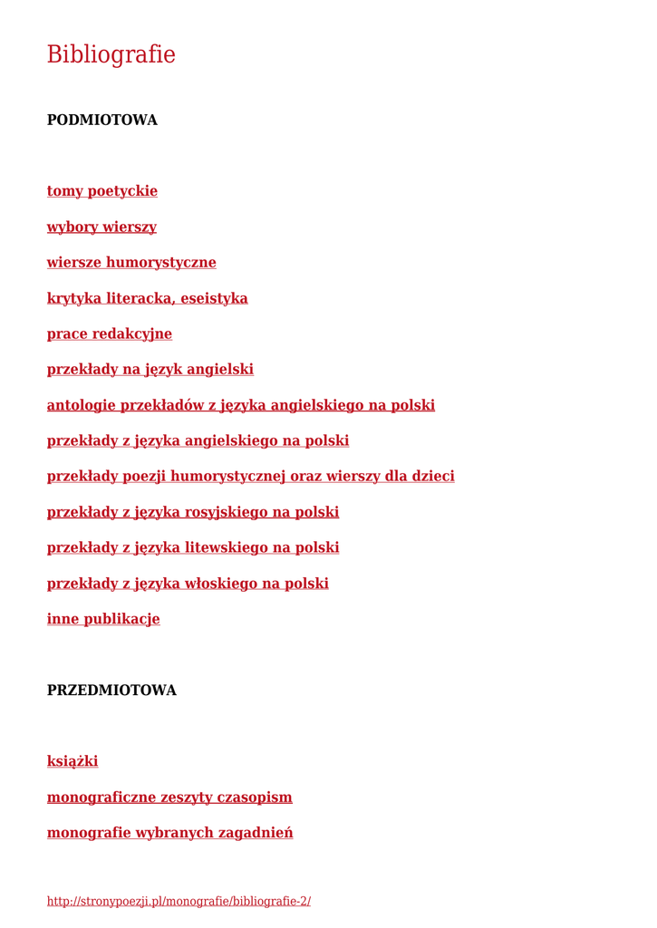 Bibliografie PODMIOTOWA tomy poetyckie wybory wierszy wiersze humorystyczne krytyka literacka, eseistyka prace redakcyjne przekłady na język angielski antologie przekładów z języka angielskiego na polski przekłady z języka angielskiego na polski przekłady poezji humorystycznej oraz wierszy dla dzieci przekłady z języka rosyjskiego na polski przekłady z języka litewskiego na polski przekłady z języka włoskiego na polski inne publikacje PRZEDMIOTOWA książki monograficzne zeszyty czasopism monografie wybranych zagadnień http://stronypoezji.pl/monografie/bibliografie-2/ studia i szkice recenzje varia BIBLIOGRAFIA PODMIOTOWA | wybór tomy poetyckie Korekta twarzy, Poznań 1968 (Wydawnictwo Poznańskie). Jednym tchem, Warszawa 1970 (Orientacja). Dziennik poranny, Poznań 1972 (Wydawnictwo Poznańskie). Sztuczne oddychanie, Poznań 1974 (samizdat). Sztuczne oddychanie, Londyn 1978 (Aneks). Ja wiem, że to niesłuszne. Wiersze z lat 1975-1976, Paryż 1977 (Instytut Literacki). Ja wiem, że to niesłuszne, Warszawa 1978 (Niezależna Oficyna Wydawnicza). Tryptyk z betonu, zmęczenia i śniegu, Kraków 1980 (Krakowska Oficyna Studentów). Atlantyda i inne wiersz z lat 1981-1985, Londyn 1986 (Puls). Widokówka z tego świata i inne rymy z lat 1986-1988, Paryż 1988 (Zeszyty Literackie). Podróż zimowa. Wiersze do muzyki Franza Schuberta, Poznań 1994 (Wydawnictwo a5). http://stronypoezji.pl/monografie/bibliografie-2/ Chirurgiczna precyzja. Elegie i piosenki z lat 1995-1997, Kraków 1998 (Wydawnictwo a5). wybory wierszy Wiersze prawie zebrane, Warszawa 1981 (Niezależna Oficyna Wydawnicza). 159 wierszy, Kraków 1990 (Znak). Poezje wybrane, Warszawa 1990 (Ludowa Spółdzielnia Wydawnicza). Wybór wierszy i przekładów, Warszawa 1997 (Państwowy Instytut Wydawniczy). Zimy i podróże. Lekcja literatury z Antonim Liberą, Kraków 1997 (Wydawnictwo Literackie). wiersze humorystyczne Zwierzęca zajadłość. Z zapisków zniechęconego zoologa, Poznań 1991 (Wydawnictwo a5). Biografioły. Poczet 56 jednostek sławnych, sławetnych i osławionych oraz Appendix, umożliwiający człowiekowi kulturalnemu zrozumienie i zapamiętanie, o co chodzi w 7 podstawowych utworach W. Szekspira, Poznań 1991 (Wydawnictwo a5). Zupełne zezwierzęcenie. Zeszyt znacznie zgryźliwszych, zakasujących złośliwością znany zbiorek „Zwierzęca zajadłość”, zapisków zniechęconego zoologa, Poznań 1993 (Wydawnictwo a5). Bóg, Trąba i Ojczyzna. Słoń a sprawa polska oczami poetów od Reja do Rymkiewicza, Kraków 1995 (Znak). Żegnam cię, Nosorożcze. Kompletne bestiarium zniechęconego zoologa, Warszawa 1995 (Świat Książki). Geografioły. Notatki globtrottera-domatora, Warszawa 1998 (Prószyński i S-ka). http://stronypoezji.pl/monografie/bibliografie-2/ krytyka literacka, eseistyka Nieufni i zadufani. Romantyzm i klasycyzm w młodej poezji lat sześćdziesiątych, Wrocław 1971 (Ossolineum). Ironia i harmonia. Szkice o najnowszej literaturze polskiej, Warszawa 1973 (Czytelnik). Język poetycki Mirona Białoszewskiego, Wrocław 1974 (Ossolineum). Etyka i poetyka, Paryż 1979 (Instytut Literacki). Książki najgorsze (1975-1980) Kraków 1981 (Krakowska Oficyna Studentów) Czytelnik ubezwłasnowolniony. Perswazja w masowej kulturze literackiej PRL, Paryż 1983 (Libella). Uciekinier z Utopii. O poezji Zbigniewa Herberta, Londyn 1984 (Polonia). Przed i po. szkice o poezji krajowej przełomu lat siedemdziesiątych i osiemdziesiątych, Londyn 1988 (Aneks). Tablica z Macondo. Osiemnaście prób wytłumaczenia po co i dlaczego się pisze, Londyn 1990 (Aneks). Książki najgorsze i parę innych ekscesów krytycznoliterackich, Poznań 1990 (Wydawnictwo a5). Breathing Under Water, and Other East European Essays, Cambridge, Mass. – London 1990 (Harvard University Press). Ocalone w tłumaczeniu. Szkice o warsztacie tłumacza poezji z dołączeniem Małej Antologii Przekładów-Problemów, Poznań 1992 (Wydawnictwo a5). Zaufać nieufności. Osiem rozmów o sensie poezji 1990-1992, pod red. K. Biedrzyckiego, Kraków 1993 (NaGłos). Pomyślane przepaście. Osiem interpretacji, w układzie i oprac. J. Tambor i R. Cudaka, posł. I. Opacki, Katowice 1995 (Wydawnictwo Uniwersytetu Śląskiego). Pegaz zdębiał. Poezja nonsensu a życie codzienne: Wprowadzenie w prywatną http://stronypoezji.pl/monografie/bibliografie-2/ teorię gatunków, Londyn 1995 (Puls). Poezja i duch Uogólnienia. Wybór esejów 1970-1995, Kraków 1996 (Znak). prace redakcyjne Poeta pamięta. Antologia poezji świadectwa i sprzeciwu 1944-1984, wybór S. Barańczak, Londyn 1984. W. Weintraub, O współczesnych i o sobie. Wspomnienia, sylwetki, szkice literackie, oprac. i wstęp S. Barańczak, Kraków 1994. J. Brodski, Pochwała nudy. Eseje, wybór i oprac., S. Barańczak, Kraków 1996. S. Heaney, Zawierzyć poezji. Eseje, wybór i oprac. S. Barańczak, Kraków 1996. B. Leśmian, Wybór poezji, wybór i posłowie S. Barańczak, Warszawa 1997. przekłady na język angielski R. Krynicki, Citizen R. K. Does Not Live. Poems of Ryszard Krynicki, Forest Grove, Ore. 1985 (wybór i tłumaczenie większości utworów, z C. Cavanagh). „Spoiling Cannibals' Fun”. Polish Poetry of the Last Two Decades of Communist Rule, Evanston, Illi. 1991 (we współpracy z Clare Cavanagh). W. Szymborska, View with a Grain of Sand. Selected poems, San Diego 1995 (wybór i przekład, z C. Cavanagh). 77 translations by Stanisław Barańczak and Clare Cavanagh from modern Polish poetry, Katowice 1995. W. Szymborska, View with a Grain of Sand. Selected poems, London 1996 (wybór i przekład, z C. Cavanagh). W. Szymborska, Nic dwa razy / Nothing Twice, Kraków 1997 (wybór i przekład, we współpracy z C. Cavanagh. http://stronypoezji.pl/monografie/bibliografie-2/ W. Szymborska, Poems. New and Selected (1957-1997), San Diego 1998 (wybór i przekład, we wspólpracy z C. Cavanagh). J. Kochanowski, Laments, London 1995 (we współpracy z S. Heaneyem). antologie przekładó