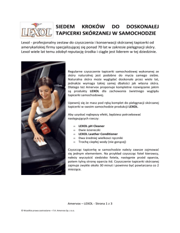 SIEDEM KROKÓW DO DOSKONAŁEJ TAPICERKI SKÓRZANEJ W SAMOCHODZIE Lexol - profesjonalny zestaw do czyszczenia i konserwacji skórzanej tapicerki od amerykańskiej firmy specjalizującej się ponad 70 lat w zakresie pielęgnacji skóry. Lexol wiele lat temu zdobył reputację środka i ciągle jest liderem w tej dziedzinie. Regularne czyszczenie tapicerki samochodowej wykonanej ze skóry naturalnej jest podobne do mycia samego siebie. Naturalna skóra może wyglądać doskonale przez wiele lat, jednakże wymaga takiej samej dbałości jak własna skóra. Dlatego też Amervox proponuje kompletne rozwiązanie jakim są produkty LEXOL dla zachowania świetnego wyglądu tapicerki samochodowej. Upewnij się że masz pod ręką komplet do pielęgnacji skórzanej tapicerki w swoim samochodzie produkcji LEXOL. Aby uzyskać najlepszy efekt, będziesz potrzebować następujących rzeczy: • • • • • LEXOL pH Cleaner Dwie ściereczki LEXOL Leather Conditioner Dwa średniej wielkosci ręczniki Trochę ciepłej wody (nie gorącej) Czyszcząc tapicerkę w samochodzie należy zawsze zajmować się jednym elementem. Na przykład czyszcząc fotel kierowcy, należy wyczyścić siedzisko fotela, następnie przód oparcia, potem tylną stronę oparcia itd. Czyszczenie tapicerki skórzanej zajmuje zwykle około 30 minut i powinno być powtarzana co 2 miesiące. Amervox – LEXOL - Strona 1 z 3 © Wszelkie prawa zastrzeżone – F.H. Amervox Sp. z o.o. Czyszczenie tapicerki samochodowej. W pierwszej kolejności należy usunąć pozostałości tłuszczu, do którego przykleja się kurz i bród. Nie należy używać mydła – jest wysoce alkaliczne (posiada odczyn zasadowy) i może pozostawić trwałe ślady na skórze. LEXOL Cleaner pH ze swą unikalną neutralną formułą jest do tego celu idealny. Przed czyszczeniem należy odkurzyć szczeliny aby usunąć piach i inne luźne zanieczyszczenia. Należy zawsze czyścić tapicerkę małymi sekcjami – np. zaczynając od siedziska fotela, potem przód oparcia i na końcu jego tylna część. Po wyczyszczeniu foteli można zająć się boczkami drzwi a później w podobny sposób tylna część samochodu. Należy nanieść niewielką ilość na wilgotną (ale nie mokrą) ściereczkę, ścisnąć kilkukrotnie do uzyskania piany, następnie energicznie pocierać skórę okrężnymi ruchami. Trudno dostępne miejsca można wyczyścić szczotką z miękkim włosiem. Przejedź szczotką po dłoni – jeśli rysuje twoją skórę – jest zbyt twarda dla tapicerki. Po czyszczeniu LEXOL Cleaner pH, przetrzyj tapicerkę wilgotnym ręcznikiem, następnie suchym ręcznikiem. Pamiętaj by nie ominąć żadnych szczelin. Kurz zalegający w trudnodostępnych miejscach może sprzyjać drobnoustrojom niszczącym skórę a także powodować alergię. Pielęgnacja wyczyszczonej tapicerki. Przed użyciem LEXOL Conditioner, należy zawsze wyczyścić skórę z pomocą LEXOL Cleaner pH. Użycie obu preparatów w najlepszym stopniu zabezpieczy skórę przed brudem i kurzem. Użycie kompletu środków pozwala na długie jej użytkowanie w doskonałej kondycji. Lekko wilgotna tapicerka samochodowa (po użyciu LEXOL Cleaner pH) jest gotowa do zaaplikowania Conditionera. Wilgotna skóra ułatwia wnikanie składników w jej głąb. Dodatkowo wilgotna skóra wchłonie tylko tyle preparatu ile jest jej potrzebne – nie ma potrzeby zużywać go zbyt dużo. Stara i zużyta skóra będzie wchłaniać dużo preparatu, dlatego zaniedbaną tapicerkę w samochodzie należy w szczególności przygotować do konserwacji z pomocą LEXOL Cleaner pH. Nacierając skórzaną tapicerkę LEXOR Conditioner’em należy zachować kolejność czynności jak przy jej czyszczeniu. Dzięki temu będziesz mieć pewność, że nie pominiesz żadnych elementów. Dla lepszego efektu należy po konserwacji odczekać 20 do 30 minut aż formuła zawarta w preparacie wniknie do skóry, następnie przetrzeć ją czystym i suchym ręcznikiem. Amervox – LEXOL - Strona 2 z 3 © Wszelkie prawa zastrzeżone – F.H. Amervox Sp. z o.o. Czyszczenie i konserwacja skóry preparatami LEXOL 1/ Nanieść preparat na wilgotną ściereczkę lub gąbkę. 2/ Czyścić jeden element na raz, używając piany do usunięcia zabrudzeń. 3/ Użyć wilgotnej ściereczki do usunięcia resztek piany. 4/ Nadmiar wilgoci usunąć czystym i suchym ręcznikiem. 5/ Nanieść niewielką ilość Conditionera na czystą ściereczkę. 6/ Natrzeć Conditionerem czystą powierzchnię. Po wykonaniu siedmiu kroków, można cieszyć się piękną i zadbaną tapicerką w samochodzie. 7/ Po 20 do 30 minutach przetrzeć czystym i suchym ręcznikiem. Amervox – LEXOL - Strona 3 z 3 © Wszelkie prawa zastrzeżone – F.H. Amervox Sp. z o.o.