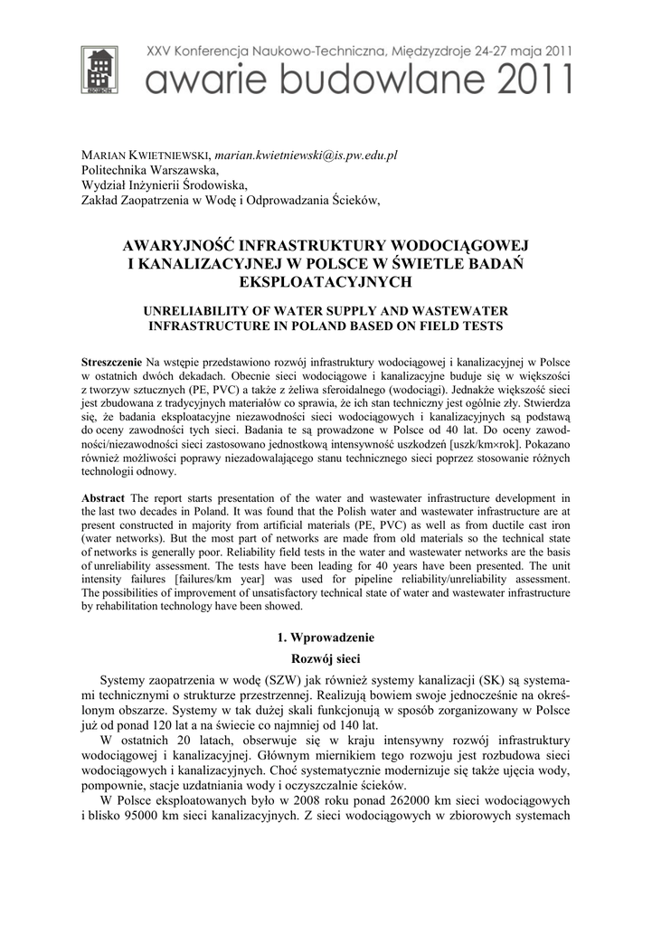 MARIAN KWIETNIEWSKI, [email protected] Politechnika Warszawska, Wydział InŜynierii Środowiska, Zakład Zaopatrzenia w Wodę i Odprowadzania Ścieków, AWARYJNOŚĆ INFRASTRUKTURY WODOCIĄGOWEJ I KANALIZACYJNEJ W POLSCE W ŚWIETLE BADAŃ EKSPLOATACYJNYCH UNRELIABILITY OF WATER SUPPLY AND WASTEWATER INFRASTRUCTURE IN POLAND BASED ON FIELD TESTS Streszczenie Na wstępie przedstawiono rozwój infrastruktury wodociągowej i kanalizacyjnej w Polsce w ostatnich dwóch dekadach. Obecnie sieci wodociągowe i kanalizacyjne buduje się w większości z tworzyw sztucznych (PE, PVC) a takŜe z Ŝeliwa sferoidalnego (wodociągi). JednakŜe większość sieci jest zbudowana z tradycyjnych materiałów co sprawia, Ŝe ich stan techniczny jest ogólnie zły. Stwierdza się, Ŝe badania eksploatacyjne niezawodności sieci wodociągowych i kanalizacyjnych są podstawą do oceny zawodności tych sieci. Badania te są prowadzone w Polsce od 40 lat. Do oceny zawodności/niezawodności sieci zastosowano jednostkową intensywność uszkodzeń [uszk/km×rok]. Pokazano równieŜ moŜliwości poprawy niezadowalającego stanu technicznego sieci poprzez stosowanie róŜnych technologii odnowy. Abstract The report starts presentation of the water and wastewater infrastructure development in the last two decades in Poland. It was found that the Polish water and wastewater infrastructure are at present constructed in majority from artificial materials (PE, PVC) as well as from ductile cast iron (water networks). But the most part of networks are made from old materials so the technical state of networks is generally poor. Reliability field tests in the water and wastewater networks are the basis of unreliability assessment. The tests have been leading for 40 years have been presented. The unit intensity failures [failures/km year] was used for pipeline reliability/unreliability assessment. The possibilities of improvement of unsatisfactory technical state of water and wastewater infrastructure by rehabilitation technology have been showed. 1. Wprowadzenie Rozwój sieci Systemy zaopatrzenia w wodę (SZW) jak równieŜ systemy kanalizacji (SK) są systemami technicznymi o strukturze przestrzennej. Realizują bowiem swoje jednocześnie na określonym obszarze. Systemy w tak duŜej skali funkcjonują w sposób zorganizowany w Polsce juŜ od ponad 120 lat a na świecie co najmniej od 140 lat. W ostatnich 20 latach, obserwuje się w kraju intensywny rozwój infrastruktury wodociągowej i kanalizacyjnej. Głównym miernikiem tego rozwoju jest rozbudowa sieci wodociągowych i kanalizacyjnych. Choć systematycznie modernizuje się takŜe ujęcia wody, pompownie, stacje uzdatniania wody i oczyszczalnie ścieków. W Polsce eksploatowanych było w 2008 roku ponad 262000 km sieci wodociągowych i blisko 95000 km sieci kanalizacyjnych. Z sieci wodociągowych w zbiorowych systemach 128 Kwietniewski M.: Awaryjność infrastruktury wodociągowej i kanalizacyjnej w Polsce... zaopatrzenia w wodę korzystało ok. 84% mieszkańców zaś z sieci kanalizacyjnych tylko ok. 53% mieszkańców kraju. Z analizy rozwoju sieci w latach 1990÷2008 wynika, Ŝe w Polsce przybywa średnio rocznie ok. 8900 km sieci wodociągowych i ok. 3600 km sieci kanalizacyjnych. Rozwój infrastruktury kanalizacyjnej w ostatnich latach jest odzwierciedleniem priorytetów w zakresie potrzeb inwestycyjnych, a aktualne tempo rozwoju tej infrastruktury będzie podtrzymywane co najmniej do 2015 roku tj. do ukończenia Krajowego Programu Oczyszczania Ścieków Komunalnych (KPOŚK), który ma kosztować ok. 73 mld zł. RóŜnica między wyposaŜeniem jednostek osadniczych w sieci wodociągowe i kanalizacyjne jest ogromna na korzyść infrastruktury wodociągowej, której jest prawie 3 razy więcej niŜ sieci kanalizacyjnych. Przy tym stopień wyposaŜenia w infrastrukturę wodociągową i kanalizacyjną jest bardzo róŜny w miastach i ośrodkach wiejskich. W przypadku kanalizacji, udział mieszkańców korzystających ze zbiorowych systemów kanalizacyjnych w ośrodkach wiejskich jest ponad 4-krotnie mniejszy, niŜ w miastach. Natomiast w zakresie zbiorowego zaopatrzenia w wodę róŜnica juŜ nie jest tak duŜa i wynosi ok. 21 punktów procentowych. Struktura materiałowa sieci Poza oceną ilościową infrastruktury wodociągowej i kanalizacyjnej warto zwrócić uwagę na strukturę materiałową obu rodzajów sieci, bo ta cecha jest mocno związana z ich stanem technicznym. Struktura materiałowa sieci wodociągowych i kanalizacyjnych w Polsce zmienia się systematycznie od 1990 roku. Kierunek tych zmian wskazuje na szerokie wykorzystanie w ostatnich latach do budowy sieci głównie rur i kształtek z polietylenu (PE) w wodociągach oraz polichlorku winylu (PVC) – w wodociągach i kanalizacji. Obserwuje się równieŜ ciągły, choć w mniejszym zakresie, przyrost sieci wodociągowych budowanych z Ŝeliwa nowej generacji, a mianowicie Ŝeliwa sferoidalnego. Podobne tendencje obserwuje się w zakresie odnowy (renowacji, wymiany bezwykopowej i wymiany wykopowej) przewodów wodociągowych, gdzie stare przewody stalowe, z Ŝeliwa szarego i azbestowo-cementowe wymienia się głównie na rurociągi z PE i Ŝeliwa sferoidalnego. RównieŜ w przypadku sieci kanalizacyjnych, stare kanały wymienia się najczęściej na rurociągi z PVC. W rezultacie, równocześnie z rozwojem sieci budowanych z nowych materiałów widać systematyczne zmniejszanie uŜycia materiałów tradycyjnych takich jak stal i Ŝeliwo szare do budowy sieci wodociągowych (tabl. 1) oraz kamionki, betonu i Ŝelbetu do budowy kanalizacji (tabl. 2) [23]. Ostatnie badania [26] pokazują, Ŝe mimo intensywnej rozbudowy i wymiany starych przewodów na przewody z nowych materiałów, w strukturze materiałowej badanych sieci wodociągowych nadal pozostają w duŜej ilości tradycyjne Ŝeliwo szare (36,9%) i stal (12,7%). Istotny udział, ze względu na eksploatację sieci, mają jeszcze rurociągi z azbestoceme
