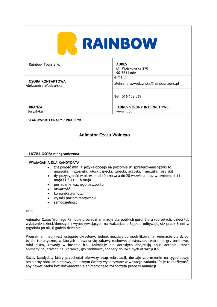 ADRES ul. Piotrkowska 270 90-361 Łódź e-mail: Rainbow Tours S.A. OSOBA KONTAKTOWA Aleksandra Wodzyńska [email protected] Tel: 516 158 569 BRANŻA turystyka ADRES STRONY INTERNETOWEJ www.r.pl STANOWISKO PRACY / PRAKTYK: Animator Czasu Wolnego LICZBA OSÓB: nieograniczona WYMAGANIA DLA KANDYDATA znajomość min. 1 języka obcego na poziomie B1 (preferowane języki to angielski, hiszpański, włoski, grecki, turecki, arabski, francuski, rosyjski), dyspozycyjność w okresie od 10 czerwca do 20 września oraz w terminie 4-11 maja LUB 11 – 18 maja posiadanie ważnego paszportu otwartość komunikatywność wysoki poziom motywacji samodzielność OPIS Animator Czasu Wolnego Rainbow prowadzi animacje dla polskich gości Biura (dorosłych, dzieci lub wyłącznie dzieci/dorosłych) wypoczywających na wakacjach. Zajęcia odbywają się przez 6 dni w tygodniu po ok. 6 godzin dziennie. Program animacji jest wstępnie określony, jednak możliwy do modyfikowania. Animacje dla dzieci to dni tematyczne, w których mieszczą się zabawy ruchowe, plastyczne, teatralne, gry terenowe, mini disco, zawody w basenie itp. Animacje dla dorosłych obejmują aqua aerobic, tańce animacyjne, stretching, karaoke, gry stolikowe, spacery do lokalnych atrakcji itp. Każdy kandydat, który przechodzi pierwszy etap rekrutacji, dostaje zaproszenie na tygodniowy, bezpłatny obóz szkoleniowy, na którym ćwiczy wykonywane w wakacje zadania. Daje to możliwość, aby nawet osoba bez doświadczenia animacyjnego rozpoczęła pracę w animacji. ZAPEWNIAMY zatrudnienie na podstawie umowy cywilno – prawnej na ok. 3 miesiące, co miesiąc wypłacane w złotówkach na konto, możliwość dalszego rozwoju kariery w zawodach pilot wycieczek/rezydent, MIEJSCE ZATRUDNIENIA Hiszpania, Grecja, Włochy, Czarnogóra, Chorwacja, Portugalia, Egipt, Turcja, Cypr w Figloklubach (opis miejsc pracy na stronie Figlokluby.pl) Rekruterzy podejmują decyzję o miejscu zatrudnienia kandydata biorąc pod uwagę jego preferencje oraz znajomość języków obcych TRYB REKRUTACJI: etap I: Przesłanie aplikacji poprzez stronę internetową https://www.hrsys.pl/praca/rainbowtours. Jest to jedyny sposób, aby wziąć udział w castingu rekrutacyjnym. etap II: Do osób, które prześlą do nas swoją aplikację, wyślemy zaproszenie na spotkanie rekrutacyjne, które odbędzie się 9 kwietnia w Warszawie. Zaproszenie zawierać będzie wszelkie informacje organizacyjne i opis właściwego sposobu przygotowania się do rekrutacji. etap III: Wybranym osobom, które przejdą etap II, zaproponujemy wyjazd na szkolenie zagraniczne. Oferta ważna do: 5.04.2016