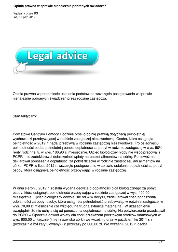 Opinia prawna w sprawie nienależnie pobranych świadczeń Wpisany przez BS Wt, 09 paź 2012 Opinia prawna w przedmiocie ustalenia podstaw do wszczęcia postępowania w sprawie nienależnie pobranych świadczeń przez rodzinę zastępczą. Stan faktyczny: Powiatowe Centrum Pomocy Rodzinie prosi o opinię prawną dotyczącą pełnoletniej wychowanki przebywającej w rodzinie zastępczej niezawodowej. Osoba, która osiągnęła pełnoletność w 2012 r. nadal przebywa w rodzinie zastępczej niezawodowej. Po osiągnięciu pełnoletności osoba pełnoletnią ponosi odpłatność za pobyt w rodzinie zastępczej w wys. 50% renty rodzinnej tj. w wys. 186,96 zł miesięcznie. Ojciec biologiczny nigdy nie współpracował z PCPR i nie zadeklarował dobrowolnej wpłaty na poczet alimentów na córkę. Ponieważ nie deklarował ponoszenia odpłatności za pobyt dziecka w rodzinie zastępczej, ani alimentów na córkę, PCPR w lipcu 2012 r. wszczęło postępowanie w sprawie ustalenia odpłatności za pobyt osoby, która osiągnęła pełnoletność przebywając w rodzinie zastępczej. W dniu sierpniu 2012 r. została wydana decyzja o odpłatności ojca biologicznego za pobyt osoby, która osiągnęła pełnoletność przebywając w rodzinie zastępczej w wys. 400,00 miesięcznie. Ojciec biologiczny odwołał się od w/w decyzji, zadeklarował chęć ponoszenia odpłatności za pobyt osoby, która osiągnęła pełnoletność przebywając w rodzinie zastępczej w wys. 70,00 zł miesięcznie (ze względu na trudną sytuację materialną). W uzasadnieniu uwzględnił, że nie uchyla się od ponoszenia odpłatności na córkę. Na potwierdzenie przedstawił do PCPR w Opocznie dowód wpłaty dla córki przekazem pocztowym środków finansowych w wys. 600,00 zł. łącznie (imię i nazwisko córki) we wrześniu oraz w październiku 2011 r. r. (przekaz nie był zatytułowany) - 2 przekazy po 300,00 zł. We wrześniu 2012 r. osoba 1/4 Opinia prawna w sprawie nienależnie pobranych świadczeń Wpisany przez BS Wt, 09 paź 2012 pełnoletnia przebywająca w rodzinie zastępczej złożyła wyjaśnienia, że środki finansowe potraktowała jako prezent i przeznaczyła je na korepetycje z języka angielskiego oraz na wizytę u stomatologa. PCPR prosi o zajęcie stanowiska w sprawie, czy w/w pomoc należy traktować jako alimenty na osobę, która osiągnęła pełnoletniość przebywając w rodzinie zastępczej i żądać z odsetkami od listopada 2011 r. zwrot nienależnie pobranego świadczenia i potrącić z odsetkami od bieżących wypłat dla rodziny zastępczej? Odpowiedź: Punktem wyjścia dla udzielenia odpowiedzi na podstawione pytanie jest ustalenie czy świadczenie pieniężne przekazane przez ojca biologicznego osobie przebywającej w pieczy zastępczej należy zakwalifikować jako alimenty. Art. 128 Kodeku rodzinnego i opiekuńczego definiuje obowiązek alimentacyjny jako obowiązek dostarczania środków utrzymania, w miarę potrzeby także środków wychowania . W przypadku osoby przebywającej w pieczy zastępczej obowiązek alimentacyjny może być realizowany jedynie przez dostarczenie środków utrzymania. „Dostarczanie środków utrzymania” - to w powszechnym rozumieniu tego wyrażenia zaspokajanie normalnych, bieżących potrzeb uprawnionego w postaci: pożywienia, ubrania, mieszkania, opału, niezbędnych przedmiotów umożliwiających przebywanie w środowisku i w rodzinie, leków itp. (…)Obowiązek dostarczania, w ramach obowiązku alimentacyjnego, środków utrzymania i wychowania nie obejmuje świadczeń wprawdzie zwyczajowo przyjętych i życiowo celowych, ale niesłużących zaspokajaniu bieżących, usprawiedliwionych potrzeb uprawnionego, np. przysporzenia z okazji pełnoletności, ślubu (posag, wiano), wyposażenia zakładu rzemieślniczego w związku z ukończeniem nauki zawodu. (Tadeusz Domińczyk, Komentarz do kodeksu rodzinnego i opiekuńczego, LexPolonica Online). Z opisanego stanu faktycznego nie wynika żeby w stosunku do osoby przebywającej w pieczy zastępczej wystąpiły okoliczności uzasadniające zakwalifikowanie przekazanego przez rodzica biologicznego świadczenia do świadczenia o charakterze zwyczajowym, innym niż alimenty. W tytule przekazu pocztowego wpłacający nie określił celu wpłaty, wskazał jednak imię i nazwisko osoby uposażonej stąd w mojej ocenie należy przyjąć, że świadczenie miało charakter świadczenia alimentacyjnego. O takim zakwalifikowaniu świadczenia pieniężnego może również świadczyć przeznaczenie środków przez małoletnią. W wyjaśnieniach złożonych w Powiatowym Centrum Pomocy Rodzinie osoba ta co prawda oświadczyła, że potraktowała te środki jako prezent, niemniej jednak przeznaczyła na zaspokojenie normalnych, bieżących potrzeb (korepetycje z języka angielskiego oraz na wizyta u stomatologa). Alimenty mogą mieć postać zarówno świadczeń dobrowolnych jak i ponoszonych przymusowo, na podstawie orzeczenia sądu. W tym miejscu należy przytoczyć art. 6 pkt 2 ustawy o pomocy społecznej, zgodnie z którym przez dochód dziecka - dochód, do którego zalicza się m.in. otrzymywane alimenty. Zatem dla ustawodawcy znaczenie miał fakt rzeczywistego realizowania obowiązku 2/4 Opinia prawna w sprawie nienależnie pobranych świadczeń Wpisany przez BS Wt, 09 paź 2012 alimentacyjnego a nie fakt zasądzenia alimentów na rzecz osoby uprawnionej. Odpowiadając zatem na pytanie w/w pomoc należy traktować jako alimenty na osobę małoletnią przebywającą w pieczy zastępczej. Zgodnie z art. 78 ust. 1 ustawy o pomocy społecznej, w brzmieniu obowiązującym na dzień przekazania środków pieniężnych małoletniemu przez ojca biologicznego rodzinie zastępczej udziela się pomocy pieniężnej na częściowe pokrycie kosztów utrzymania każdego umieszczonego w niej dziecka. Następnie w ust. 10 wskazano, że rodzina zastępcza obowiązana jest do współdziałania z powiatowym centrum pomocy rodzinie. W