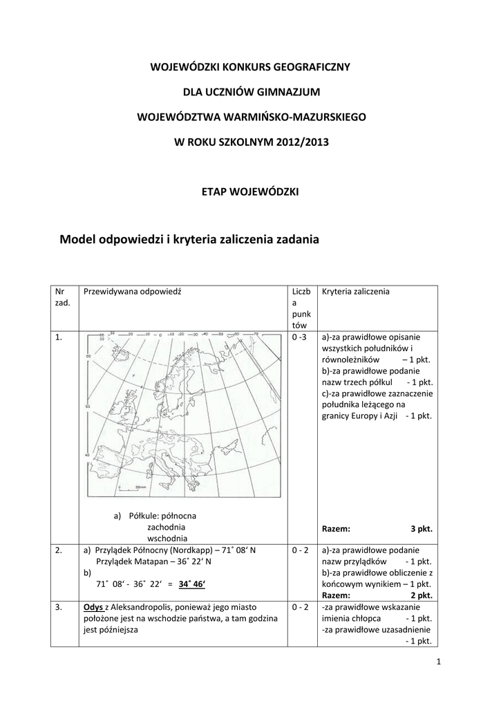 WOJEWÓDZKI KONKURS GEOGRAFICZNY DLA UCZNIÓW GIMNAZJUM WOJEWÓDZTWA WARMIŃSKO-MAZURSKIEGO W ROKU SZKOLNYM 2012/2013 ETAP WOJEWÓDZKI Model odpowiedzi i kryteria zaliczenia zadania Nr zad. Przewidywana odpowiedź 1. 2. 3. a) Półkule: północna zachodnia wschodnia a) Przylądek Północny (Nordkapp) – 71˚ 08‘ N Przylądek Matapan – 36˚ 22‘ N b) 71˚ 08‘ - 36˚ 22‘ = 34˚ 46‘ Odys z Aleksandropolis, ponieważ jego miasto położone jest na wschodzie państwa, a tam godzina jest późniejsza Liczb a punk tów 0 -3 Kryteria zaliczenia a)-za prawidłowe opisanie wszystkich południków i równoleżników – 1 pkt. b)-za prawidłowe podanie nazw trzech półkul - 1 pkt. c)-za prawidłowe zaznaczenie południka leżącego na granicy Europy i Azji - 1 pkt. Razem: 0-2 0-2 3 pkt. a)-za prawidłowe podanie nazw przylądków - 1 pkt. b)-za prawidłowe obliczenie z końcowym wynikiem – 1 pkt. Razem: 2 pkt. -za prawidłowe wskazanie imienia chłopca - 1 pkt. -za prawidłowe uzasadnienie - 1 pkt. 1 4. 0-3 5. B P P B 0-2 6. A. 0-4 B. Moskwa: 37˚ E Warszawa: 21˚ E 37˚ - 21˚ = 16˚ - różnica kątowa 16˚ x 4 minuty = 64 minut - różnica czasowa Brat wita wschód Słońca - wcześniej 7. 0-6 Razem: 2 pkt. -za prawidłowe wpisanie na rysunku horyzontu -1 pkt. -za prawidłowe wpisanie na rysunku kierunków świata: N iS - 1 pkt. -za prawidłowe wpisanie na rysunku miejsca górowania Słońca - 1 pkt. Razem: 3 pkt. -za prawidłowe 2 - 3 oznaczenia - 1 pkt. -za prawidłowe 4 oznaczenia - 2 pkt. Razem: 2 pkt. A a)-za prawidłowe wpisanie wartości południków - 1 pkt. b)-za prawidłowe wpisanie nazw stref czasowych - 1 pkt. B. -za prawidłowe wrysowanie południka 21˚E i obliczenie różnicy czasowej - 1 pkt. -za podanie prawidłowej odpowiedzi „wcześniej” - 1 pkt. Razem: 4 pkt. -za prawidłowe zaznaczenie 2 nizin - 1 pkt. -za prawidłowe zaznaczenie 3 nizin - 2 pkt. -za prawidłowe zaznaczenie 2 wyżyn - 1 pkt. -za prawidłowe zaznaczenie 2 pasm górskich - 1 pkt. -za prawidłowe zaznaczenie 3-4 pasm górskich - 2 pkt. -za prawidłowe zaznaczenie 5 pasm górskich - 3 pkt. Razem: 8. a) Temperatury w styczniu stopniowo maleją, bo ciepłe powietrze znad oceanu nie dociera w głąb lądu, a w lipcu ląd nagrzewa się szybciej, więc są wyższe temperatury w głębi lądu, a niższe bliżej oceanu. Jest to związane z odległością od zbiornika wodnego i różnym stopniem nagrzewania lądu i 0-6 6 pkt. -za każdą prawidłową, ale niepełną odpowiedź - 1pkt. -za każdą wyczerpującą prawidłową odpowiedź -2pkt. 2 wody. b) Jest to związane z różnym kątem padania promieni słonecznych (z różną szerokością geograficzną), czyli im bardziej na północ tym mniejszy kąt padania promieni słonecznych, a więc zimniej. c) Zachodnie wybrzeże Norwegii opływa ciepły prąd Norweski, dlatego w miejscowości 9 jest w styczniu cieplej, natomiast do miejscowości 8 prąd ten nie dociera z powodu bariery Gór Skandynawskich. 9. a) - strefa klimatyczna: podzwrotnikowa - typ klimatu: morski lub (śródziemnomorski) b) cechy klimatu, np.: -temperatura: najwyższa >20˚ C od VI – IX, najniższa < 10˚C od XII – II, - opady: największe sumy opadów > 100 mm od X – XII, najmniejsze sumy opadów < 50mm od VI – IX. -zależność: im cieplej tym mniej opadów atmosferycznych; im zimniej tym opadów więcej. c) Razem: 0-7 6 pkt. a) -za prawidłowe podanie nazwy strefy klimatycznej i typu klimatu - 1 pkt. b) -za prawidłowe odczytanie wartości temperatury najwyższej i najniższej bez uwzględnienia miesięcy w jakich te wartości występują - 1 pkt. -za prawidłowe odczytanie wartości temperatury najwyższej i najniższej z uwzględnieniem miesięcy w jakich te wartości występują - 2 pkt. -za prawidłowe odczytanie wartości opadów największych i najmniejszych bez uwzględnienia miesięcy w jakich te wartości występują - 1 pkt. 10. a) C b) D 0-3 -za prawidłowe odczytanie wartości opadów największych i najmniejszych z uwzględnieniem miesięcy w jakich te wartości występują - 2 pkt. -za wykazanie zależności – 1 pkt. c) za prawidłowe zaznaczenie obszaru - 1 pkt. Razem: - 7 pkt. -za każdą prawidłową odpowiedź po - 1 pkt. 3 11. c) B A. a) 0 -10 b) Formy utworzone przez lodowiec Morena czołowa Morena denna 12. 13. Formy utworzone przez wody lodowcowe sandry pradolina rynna lodowcowa B. a) – fiordy powstają w wyniku żłobienia (egzaracji lub inaczej erozji lodowcowej) przez jęzory lodowcowe, - tworzą doliny U-kształtne, - występują np. w Norwegii ( płw. Skandynawski) - spływają z gór w kierunku morza, - powstały w czasie zlodowacenia (ponad 10 tys. lat temu) - np. przed wieloma tysiącami lat. b) – największy w Norwegii, najgłębszy - jego nagie ściany zanurzają się ponad 1200m pod wodę i wznoszą się ponad 600m tworzą płaską równinę - odgałęzienie ma 180 km długości - Fiord biegnie przez nieurodzajną krainę ku najwyższym górom Norwegii C. Zbudowany jest ze skał: krystalicznych (twardych/granitowych/magmowych). Ukształtowały go lodowce w czasie epoki lodowcowej ok. 2 mln lat temu. Wznosi się 4 480 (4 478) m n.p.m. Leży na granicy Szwajcarii i Włoch . A. - d B. - a C. - b D. - b E. - a F. - d G. - d H. - c I. - c a) Wołga: deltowe Loara: lejkowate (estuarium) b) Razem: - 3 pkt. A. a)-za prawidłowe wskazanie 4 form -1 pkt. -za prawidłowe wskazanie 56 form - 2 pkt. b)-za wypełnienie tabeli: 3 -4 formy prawidłowo wpisane - 1 pkt. -za wypełnienie tabeli: pięć form prawidłowo wpisanych - 2 pkt. B. a)-za prawidłowy opis uwzględniający 3 – 4 elementów 1pkt. -za prawidłowy opis uwzględniający 5 elementów - 2pkt. b)-za 2 prawidłowe informacje nt. Sognafjorden - 1 pkt. -za 3 prawidłowe informacje nt. Sognafjorden - 2 pkt. C. -za 3 - 5 prawidłowo uzupełnionych informacje – 1 pkt. -za 6 prawidłowo uzupełnionych informacje – 2 pkt. Razem: - 10 pkt. 0-9 0-4 -za każdą prawidłową odpowiedź - 