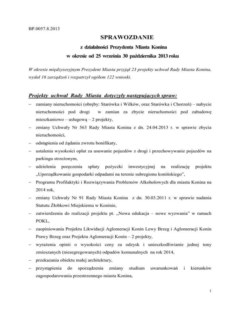 BP.0057.8.2013 SPRAWOZDANIE z działalności Prezydenta Miasta Konina w okresie od 25 września 30 października 2013 roku W okresie międzysesyjnym Prezydent Miasta przyjął 23 projekty uchwał Rady Miasta Konina, wydał 16 zarządzeń i rozpatrzył ogółem 122 wnioski. Projekty uchwał Rady Miasta dotyczyły następujących spraw: − zamiany nieruchomości (obręby: Starówka i Wilków, oraz Starówka i Chorzeń) – nabycie nieruchomości pod drogi w zamian za zbycie nieruchomości pod zabudowę mieszkaniowo – usługową – 2 projekty, − zmiany Uchwały Nr 563 Rady Miasta Konina z dn. 24.04.2013 r. w sprawie zbycia nieruchomości, − odstąpienia od żądania zwrotu bonifikaty, − ustalenia wysokości opłat za usuwanie pojazdów z drogi i przechowywanie pojazdów na parkingu strzeżonym, − udzielenia poręczenia spłaty pożyczki inwestycyjnej na realizację projektu „Uporządkowanie gospodarki odpadami na terenie subregionu konińskiego”, − Programu Profilaktyki i Rozwiązywania Problemów Alkoholowych dla miasta Konina na 2014 rok, − zmiany Uchwały Nr 91 Rady Miasta Konina z dn. 30.03.2011 r. w sprawie nadania Statutu Żłobkowi Miejskiemu w Koninie, − zatwierdzenia do realizacji projektu pt. „Nowa edukacja – nowe wyzwania” w ramach POKL, − zaopiniowania Projektu Likwidacji Aglomeracji Konin Lewy Brzeg i Aglomeracji Konin Prawy Brzeg oraz Projektu Aglomeracji Konin – 2 projekty, − wyrażenia opinii o wysokości ceny za odzysk i unieszkodliwianie jednej tony zmieszanych (niesegregowanych) odpadów komunalnych na rok 2014, − przekazania obiektu małej architektury, − przystąpienia do sporządzenia zmiany studium uwarunkowań i kierunków zagospodarowania przestrzennego miasta Konina, 1 − przystąpienia do sporządzenia miejscowego planu zagospodarowania przestrzennego miasta Konina w rejonie ul. Gajowej, Przemysłowej i Marantowskiej, − przystąpienia do sporządzenia miejscowego planu zagospodarowania przestrzennego miasta Konina, rejon ulic: Adama Mickiewicza – Obrońców Westerplatte, − wyrażenia woli przystąpienia do opracowania i wdrażania planu gospodarki niskoemisyjnej, − stawek podatku od: nieruchomości, środków transportowych – 2 projekty, − wprowadzenia opłaty od posiadania psów, − przyjęcia WPI miasta Konina na lata 2014 – 2019, − zmian w Wieloletniej Prognozie Finansowej miasta Konina na lata 2013 – 2017, − zmian w budżecie miasta Konina na 2013 rok; Wydane zarządzenia dotyczyły: − zmian w budżecie miasta Konina na 2013 rok – 4 zarządzenia, − zasad użytkowania systemów informatycznych w Urzędzie Miejskim w Koninie, − określenia szczegółowych zasad i trybu przyznawania nagrody rocznej dyrektorom samorządowych instytucji kultury, dla których organizatorem jest Miasto Konin, − wprowadzenia do stosowania Planu Obrony Cywilnej Miasta Konina, − zmiany Zarządzenia Nr 92/2013 dotyczącym przyjęcia Regulaminu Projektu pn. „Twoja firma – wspomagamy przedsiębiorczych w Koninie” nr POKL.06.02.00-30-046/12 w ramach Programu Operacyjnego Kapitał Ludzki, Priorytet VI Rynek pracy otwarty dla wszystkich, Działanie 6.2 Wsparcie oraz promocja przedsiębiorczości i samozatrudnienia, − ustalenia średniego miesięcznego kosztu utrzymania mieszkańca w Domu Pomocy Społecznej w Koninie, − przeprowadzenia przez właścicieli nieruchomości obowiązkowej deratyzacji na terenie miasta Konina, − przekazania do ZOUM w administrowanie nieruchomości zabudowanej położonej w Koninie przy ul. Kamiennej 57a, − powołania komisji opiniującej oferty na realizację zadania w zakresie prowadzenia od 01.01.2014 r. do 31.03.2015 r. Schroniska Dla Bezdomnych Zwierząt przy ul. Gajowej w Koninie, − zmiany Instrukcji Inwentaryzacyjnej w UM w Koninie, − wprowadzenia rocznego planu inwentaryzacji w UM w Koninie na 2013 rok, 2 − powołania Komisji Inwentaryzacyjnej w celu przeprowadzenia inwentaryzacji środków trwałych w UM w Koninie, − powołania Komisji Oceny Wniosków Uczestników Projektu o otrzymanie wsparcia finansowego w ramach projektu pn. „Twoja firma – wspomagamy przedsiębiorczych w Koninie” nr POKL.06.02.00-30-046/12-00, Prezydent pozytywnie rozpatrzył również wnioski w sprawach: − rozłożenia na raty należności w wysokości 60.189,49 zł z tytułu zaległości czynszowych (7 wniosków), − rozłożenia na raty zaległości czynszowych w wysokości 455,18 zł z tytułu rozliczenia mediów, − zatwierdzenia wykazu osób uprawnionych do przydziału mieszkań komunalnych i lokali socjalnych, − przywrócenia tytułu prawnego i zawarcie umowy najmu na lokal komunalny przy ul. Wyszyńskiego 15/53, − najmu lokalu użytkowego przy ul. 3 Maja 52c, − najmu lokalu użytkowego przy ul. Al. 1 Maja 15, − umorzenia należności głównej w wysokości 24.000,00 zł z tytułu zwrotu kosztów organizacji stanowiska dla osoby niepełnosprawnej, − użyczenia PCK Oddziałowi Rejonowemu w Koninie nieruchomości w obrębie Przedziałki na prowadzenie Noclegowni i Schroniska dla Bezdomnych w Koninie, − przyjęcia projektu aneksu do umowy użyczenia Konińskiemu Stowarzyszeniu Sportowemu „MUSTANG” pomieszczeń w budynku przy ul. 3 Maja 1 i 3 dot. oddania do używania pomieszczeń objętych użyczeniem na rzecz nowo utworzonej spółdzielni socjalnej osób niepełnosprawnych „Sport i Rehabilitacja”, − przyjęcia projektu aneksu do umowy z Biurem Obrotu Nieruchomościami „INVICUS” na administrowanie budynkiem przy Placu Górnika 4 dot. przedłużenia czasu trwania umowy, − przedłużenia umowy dzierżawy terenu zajętego przez targowisko miejskie oraz przyjęcie stawki czynszu dzierżawnego w wysokości 2,30 zł/m2 miesięcznie, − dzierżawy nieruchomości w obrębach: Pawłówek, Wilków, Osada z przeznaczeniem pod zieleń, − dzierżawy części nieruchomości w obrębie Morzysław pod wesołe miasteczko, − dzierżawy części nieruchomości w obręb