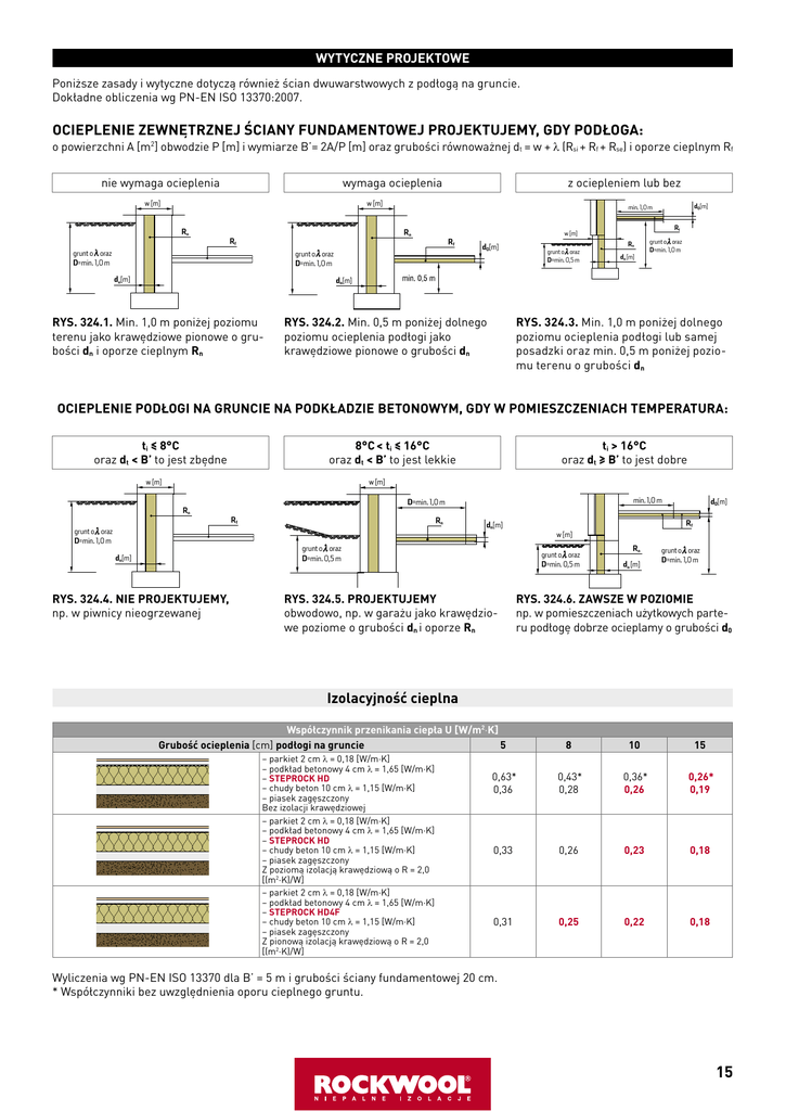WYTYCZNE PROJEKTOWE Poniższe zasady i wytyczne dotyczą również ścian dwuwarstwowych z podłogą na gruncie. Dokładne obliczenia wg PN-EN ISO 13370:2007. OCIEPLENIE ZEWNĘTRZNEJ ŚCIANY FUNDAMENTOWEJ PROJEKTUJEMY, GDY PODŁOGA: o powierzchni A [m2] obwodzie P [m] i wymiarze B’= 2A/P [m] oraz grubości równoważnej dt = w + (Rsi + Rf + Rse) i oporze cieplnym Rf nie wymaga ocieplenia wymaga ocieplenia w [m] z ociepleniem lub bez w [m] Rn Rn Rf grunt o l oraz D=min. 1,0 m dn[m] Rf w [m] Rf grunt o l oraz D=min. 1,0 m d0[m] min. 1,0 m d0[m] grunt o l oraz D=min. 0,5 m Rn dn [m] grunt o l oraz D=min. 1,0 m dn[m] RYS. 324.1. Min. 1,0 m poniżej poziomu terenu jako krawędziowe pionowe o grubości dn i oporze cieplnym Rn RYS. 324.2. Min. 0,5 m poniżej dolnego poziomu ocieplenia podłogi jako krawędziowe pionowe o grubości dn RYS. 324.3. Min. 1,0 m poniżej dolnego poziomu ocieplenia podłogi lub samej posadzki oraz min. 0,5 m poniżej poziomu terenu o grubości dn OCIEPLENIE PODŁOGI NA GRUNCIE NA PODKŁADZIE BETONOWYM, GDY W POMIESZCZENIACH TEMPERATURA: ti ≤ 8°C oraz dt < B’ to jest zbędne 8°C < ti ≤ 16°C oraz dt < B’ to jest lekkie w [m] ti > 16°C oraz dt ≥ B’ to jest dobre w [m] Rf grunt o l oraz D=min. 1,0 m min. 1,0 m D=min. 1,0 m Rn Rn d0[m] Rf dn[m] w [m] grunt o l oraz D=min. 0,5 m dn[m] RYS. 324.4. NIE PROJEKTUJEMY, np. w piwnicy nieogrzewanej grunt o l oraz D=min. 0,5 m RYS. 324.5. PROJEKTUJEMY obwodowo, np. w garażu jako krawędziowe poziome o grubości dn i oporze Rn Rn dn [m] grunt o l oraz D=min. 1,0 m RYS. 324.6. ZAWSZE W POZIOMIE np. w pomieszczeniach użytkowych parteru podłogę dobrze ocieplamy o grubości d0 Izolacyjność cieplna Współczynnik przenikania ciepła U [W/m2·K] Grubość ocieplenia [cm] podłogi na gruncie 5 – parkiet 2 cm = 0,18 [W/m·K] – podkład betonowy 4 cm = 1,65 [W/m·K] – STEPROCK HD – chudy beton 10 cm = 1,15 [W/m·K] – piasek zagęszczony Bez izolacji krawędziowej – parkiet 2 cm = 0,18 [W/m·K] – podkład betonowy 4 cm = 1,65 [W/m·K] – STEPROCK HD – chudy beton 10 cm = 1,15 [W/m·K] – piasek zagęszczony Z poziomą izolacją krawędziową o R = 2,0 [(m2·K)/W] – parkiet 2 cm = 0,18 [W/m·K] – podkład betonowy 4 cm = 1,65 [W/m·K] – STEPROCK HD4F – chudy beton 10 cm = 1,15 [W/m·K] – piasek zagęszczony Z pionową izolacją krawędziową o R = 2,0 [(m2·K)/W] 8 10 15 0,63* 0,36 0,43* 0,28 0,36* 0,26 0,26* 0,19 0,33 0,26 0,23 0,18 0,31 0,25 0,22 0,18 Wyliczenia wg PN-EN ISO 13370 dla B’ = 5 m i grubości ściany fundamentowej 20 cm. * Współczynniki bez uwzględnienia oporu cieplnego gruntu. 15 WYTYCZNE WYKONAWCZE a) W ścianie trójwarstwowej montujemy kotwy 4,5-6 mm ze stali nierdzewnej lub ocynkowanej w ilości 4 kotwy na 1 m2 ściany, o rozstawie w pionie i poziomie co 50 cm, z przesunięciem kolejnych rzędów co 25 cm. b) Dla podłóg na gruncie zawsze wykonujemy zagęszczoną podsypkę z piasku o grubości 10-15 cm. c) Ocieplenie z płyt STEPROCK HD lub STEPROCK HD4F wykonujemy jednowarstwowo lub dwuwarstowo, układając płyty w mijankę. d) Na płytach STEPROCK HD lub STEPROCK HD4F układamy folię budowlaną z wywinięciem na ściany i sklejoną na zakładach oraz wykonujemy minimum 4 cm podkład z betonu lub jastrychu cementowego. e) W przypadku wystąpienia wysokiego poziomu wody gruntowej, zawsze pod ociepleniem wykonujemy wodoszczelną izolację, np. z papy lub folii. f) Izolację krawędziową (obwodową) wykonuje się na szerokość 1 m i grubość min. 8 cm. 1 1 2 2 3 3 4 5 4 5 6 6 7 7 8 9 9 RYS. 324.7. 1. warstwa wykończeniowa, 2. podkład betonowy, 3. pasek RST, 4. przewód ogrzewania płaszczyznowego, 5. szyna montażowa, 6. folia paroizolacyjna ROCKWOOL, 7. płyta z wełny STEPROCK HD lub STEPROCK HD4F, 8. folia budowlana, 9. grunt/strop. 1 2 3 5 4 6 7 8 9 RYS. 324.9. 1. warstwa wykończeniowa, 2. podkład betonowy, 3. pasek RST, 4. rura ogrzewania, 5. mata montażowa, 6. folia paroizolacyjna ROCKWOOL, 7. płyta z wełny STEPROCK HD lub STEPROCK HD4F, 8. folia budowlana, 9. grunt/strop. 16 8 RYS. 324.8. 1. warstwa wykończeniowa, 2. podkład betonowy, 3. pasek RST, 4. rura ogrzewania, 5. siatka montażowa/ zbrojeniowa, 6. folia paroizolacyjna, 7. płyta z wełny STEPROCK HD lub STEPROCK HD4F, 8. folia budowalna, 9. grunt/strop. WIZ. 324.1. Izolacja przeciwwilgociowa, np. folia. WIZ. 324.2. Układanie płyty STEPROCK HD oraz paska RST. WIZ. 324.3. Rozłożenie folii z wywinięciem i sklejeniem na zakładach. WIZ. 324.4. Rozłożenie siatki zbrojącej. WIZ. 324.5. Mocowanie rurek ogrzewania podłogowego. WIZ. 324.6. Ułożenie podkładu betonowego. 17