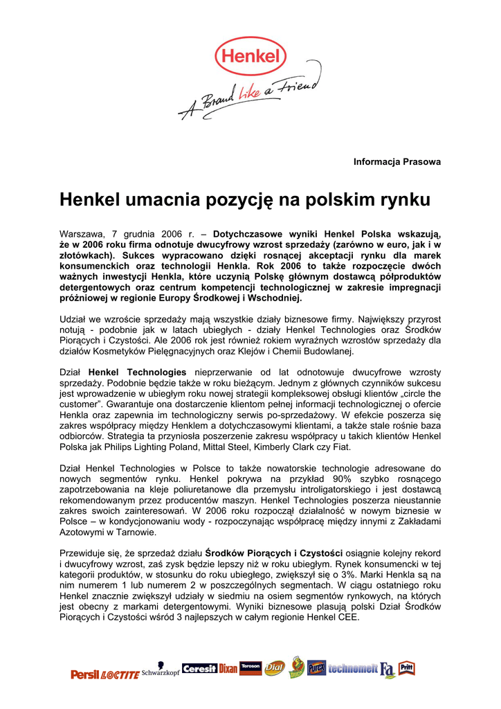 Informacja Prasowa Henkel umacnia pozycję na polskim rynku Warszawa, 7 grudnia 2006 r. – Dotychczasowe wyniki Henkel Polska wskazują, że w 2006 roku firma odnotuje dwucyfrowy wzrost sprzedaży (zarówno w euro, jak i w złotówkach). Sukces wypracowano dzięki rosnącej akceptacji rynku dla marek konsumenckich oraz technologii Henkla. Rok 2006 to także rozpoczęcie dwóch ważnych inwestycji Henkla, które uczynią Polskę głównym dostawcą półproduktów detergentowych oraz centrum kompetencji technologicznej w zakresie impregnacji próżniowej w regionie Europy Środkowej i Wschodniej. Udział we wzroście sprzedaży mają wszystkie działy biznesowe firmy. Największy przyrost notują - podobnie jak w latach ubiegłych - działy Henkel Technologies oraz Środków Piorących i Czystości. Ale 2006 rok jest również rokiem wyraźnych wzrostów sprzedaży dla działów Kosmetyków Pielęgnacyjnych oraz Klejów i Chemii Budowlanej. Dział Henkel Technologies nieprzerwanie od lat odnotowuje dwucyfrowe wzrosty sprzedaży. Podobnie będzie także w roku bieżącym. Jednym z głównych czynników sukcesu jest wprowadzenie w ubiegłym roku nowej strategii kompleksowej obsługi klientów „circle the customer”. Gwarantuje ona dostarczenie klientom pełnej informacji technologicznej o ofercie Henkla oraz zapewnia im technologiczny serwis po-sprzedażowy. W efekcie poszerza się zakres współpracy między Henklem a dotychczasowymi klientami, a także stale rośnie baza odbiorców. Strategia ta przyniosła poszerzenie zakresu współpracy u takich klientów Henkel Polska jak Philips Lighting Poland, Mittal Steel, Kimberly Clark czy Fiat. Dział Henkel Technologies w Polsce to także nowatorskie technologie adresowane do nowych segmentów rynku. Henkel pokrywa na przykład 90% szybko rosnącego zapotrzebowania na kleje poliuretanowe dla przemysłu introligatorskiego i jest dostawcą rekomendowanym przez producentów maszyn. Henkel Technologies poszerza nieustannie zakres swoich zainteresowań. W 2006 roku rozpoczął działalność w nowym biznesie w Polsce – w kondycjonowaniu wody - rozpoczynając współpracę między innymi z Zakładami Azotowymi w Tarnowie. Przewiduje się, że sprzedaż działu Środków Piorących i Czystości osiągnie kolejny rekord i dwucyfrowy wzrost, zaś zysk będzie lepszy niż w roku ubiegłym. Rynek konsumencki w tej kategorii produktów, w stosunku do roku ubiegłego, zwiększył się o 3%. Marki Henkla są na nim numerem 1 lub numerem 2 w poszczególnych segmentach. W ciągu ostatniego roku Henkel znacznie zwiększył udziały w siedmiu na osiem segmentów rynkowych, na których jest obecny z markami detergentowymi. Wyniki biznesowe plasują polski Dział Środków Piorących i Czystości wśród 3 najlepszych w całym regionie Henkel CEE. 1 Znaczny wzrost sprzedaży w stosunku do ubiegłego roku oraz wzrost udziałów rynkowych odnotowano także w dziale Kosmetyków Pielęgnacyjnych. Według ostatniego badania MEMRB Henkel został liderem w połączonej kategorii kosmetyków do pielęgnacji włosów i ciała (z 12,8%1 udziałem rynkowym). W kategorii farb do włosów Henkel od lat zajmuje pozycję lidera. Jest to najważniejsza kategoria kosmetyczna firmy na polskim rynku. Wartościowo, rynek kosmetyków do koloryzacji włosów wzrósł w ciągu roku o 6,1%, przy czym udziały produktów Henkla ogółem w ciągu ostatnich 12 miesięcy zwiększyły się o ponad 1%, do poziomu 34,9%2. Dużym sukcesem ostatniego roku była innowacyjna farba do koloryzacji włosów Natural&Easy, zapewniająca efekt naturalnej koloryzacji. Wzrosła także znacząco sprzedaż w dziale Klejów i Chemii Budowlanej. Polskich wykonawców w coraz większym stopniu interesują produkty specjalistyczne, o lepszych parametrach użytkowych, a zarazem wygodniejsze w użyciu. Stąd największe wzrosty sprzedaży odnotowują produkty bardziej zaawansowane technologicznie, takie jak: elastyczne zaprawy, systemy podłogowe Thomsit czy elastyczne spoiny, zapobiegające powstawaniu pleśni. Inwestycje Henkla W 2006 roku Henkel zainwestuje w Polsce łącznie ponad 18 mln złotych. Rok 2006 to także rozpoczęcie dwóch ważnych inwestycji Henkla w Raciborzu i Bielsku-Białej, które czynią Polskę ważnym centrum produkcji i kompetencji technologicznej w regionie CEE. Największa inwestycja Henkla dotyczy Zakładów Produkcyjnych w Raciborzu. Jej celem jest rozbudowa potencjału produkcyjnego do wytwarzania półproduktów chemicznych. Dzięki tej inwestycji Henkel w Raciborzu znacząco zwiększy produkcję półproduktu chemicznego do produkcji detergentów proszkowych oraz rozpocznie wytwarzanie półproduktu do produkcji detergentów płynnych. W sumie raciborska fabryka podwoi produkcję półproduktów chemicznych i stanie się ich głównym producentem dla całego regionu CEE (oprócz Rosji). Proces inwestycyjny powinien zakończyć się na przełomie III i IV kwartału 2007 roku. Firma szacuje, że całkowita wartość inwestycji wyniesie 17,5 mln złotych. Dzięki montażowi drugiej linii impregnacji próżniowej dwukrotnie zwiększy się także potencjał produkcyjny, działającego od 9 miesięcy, Centrum Impregnacji Próżniowej Henkla w BielskuBiałej. Druga linia ruszy na wiosnę 2007 r. i pozwoli na rozpoczęcie współpracy z kolejnymi klientami, zainteresowanymi korzystaniem z henklowskiej technologii impregnacji próżniowej. Całość inwestycji w Bielsku-Białej osiągnie pod koniec kwietnia 2007 r. pułap 5 mln złotych. Henkel to wiodące marki i technologie, które czynią życie ludzkie łatwiejszym, lepszym i piękniejszym Henkel to firma międzynarodowa, obecna na ponad 125 rynkach całego świata i zatrudniająca ponad 50 tysięcy pracowników, wiodący producent środków piorących i czystości, kosmetyków do pielęgnacji włosów i ciała, klejów konsumenckich, chemii budowlanej oraz technologii przemysłowych. W Polsce Henkel działa od 16 lat. Uruchomił