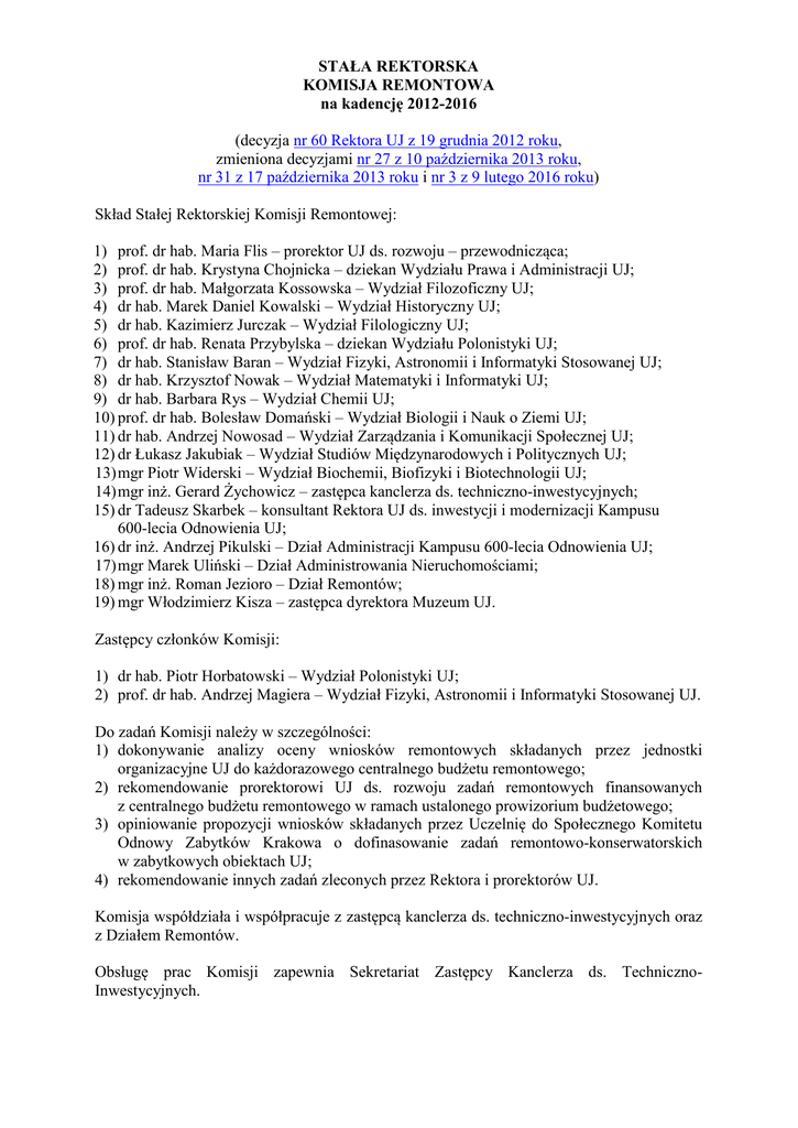 STAŁA REKTORSKA KOMISJA REMONTOWA na kadencję 2012-2016 (decyzja nr 60 Rektora UJ z 19 grudnia 2012 roku, zmieniona decyzjami nr 27 z 10 października 2013 roku, nr 31 z 17 października 2013 roku i nr 3 z 9 lutego 2016 roku) Skład Stałej Rektorskiej Komisji Remontowej: 1) prof. dr hab. Maria Flis – prorektor UJ ds. rozwoju – przewodnicząca; 2) prof. dr hab. Krystyna Chojnicka – dziekan Wydziału Prawa i Administracji UJ; 3) prof. dr hab. Małgorzata Kossowska – Wydział Filozoficzny UJ; 4) dr hab. Marek Daniel Kowalski – Wydział Historyczny UJ; 5) dr hab. Kazimierz Jurczak – Wydział Filologiczny UJ; 6) prof. dr hab. Renata Przybylska – dziekan Wydziału Polonistyki UJ; 7) dr hab. Stanisław Baran – Wydział Fizyki, Astronomii i Informatyki Stosowanej UJ; 8) dr hab. Krzysztof Nowak – Wydział Matematyki i Informatyki UJ; 9) dr hab. Barbara Rys – Wydział Chemii UJ; 10) prof. dr hab. Bolesław Domański – Wydział Biologii i Nauk o Ziemi UJ; 11) dr hab. Andrzej Nowosad – Wydział Zarządzania i Komunikacji Społecznej UJ; 12) dr Łukasz Jakubiak – Wydział Studiów Międzynarodowych i Politycznych UJ; 13) mgr Piotr Widerski – Wydział Biochemii, Biofizyki i Biotechnologii UJ; 14) mgr inż. Gerard Żychowicz – zastępca kanclerza ds. techniczno-inwestycyjnych; 15) dr Tadeusz Skarbek – konsultant Rektora UJ ds. inwestycji i modernizacji Kampusu 600-lecia Odnowienia UJ; 16) dr inż. Andrzej Pikulski – Dział Administracji Kampusu 600-lecia Odnowienia UJ; 17) mgr Marek Uliński – Dział Administrowania Nieruchomościami; 18) mgr inż. Roman Jezioro – Dział Remontów; 19) mgr Włodzimierz Kisza – zastępca dyrektora Muzeum UJ. Zastępcy członków Komisji: 1) dr hab. Piotr Horbatowski – Wydział Polonistyki UJ; 2) prof. dr hab. Andrzej Magiera – Wydział Fizyki, Astronomii i Informatyki Stosowanej UJ. Do zadań Komisji należy w szczególności: 1) dokonywanie analizy oceny wniosków remontowych składanych przez jednostki organizacyjne UJ do każdorazowego centralnego budżetu remontowego; 2) rekomendowanie prorektorowi UJ ds. rozwoju zadań remontowych finansowanych z centralnego budżetu remontowego w ramach ustalonego prowizorium budżetowego; 3) opiniowanie propozycji wniosków składanych przez Uczelnię do Społecznego Komitetu Odnowy Zabytków Krakowa o dofinasowanie zadań remontowo-konserwatorskich w zabytkowych obiektach UJ; 4) rekomendowanie innych zadań zleconych przez Rektora i prorektorów UJ. Komisja współdziała i współpracuje z zastępcą kanclerza ds. techniczno-inwestycyjnych oraz z Działem Remontów. Obsługę prac Komisji zapewnia Sekretariat Zastępcy Kanclerza ds. TechnicznoInwestycyjnych.