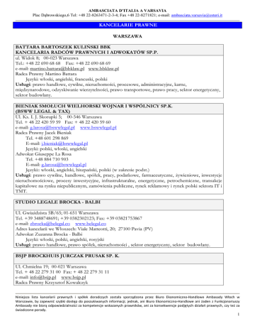 AMBASCIATA D’ITALIA A VARSAVIA Plac Dąbrowskiego,6 Tel: +48 22-8263471-2-3-4; Fax +48 22-8271821; e-mail: [email protected] KANCELARIE PRAWNE WARSZAWA BATTARA BARTOSZEK KULIŃSKI BBK KANCELARIA RADCÓW PRAWNYCH I ADWOKATÓW SP.P. ul. Widok 8; 00-023 Warszawa Tel.: +48 22 690 68 68 Fax: +48 22 690 68 69 e-mail: [email protected] www.bbklaw.pl Radca Prawny Martino Battara Języki: włoski, angielski, francuski, polski Usługi: prawo handlowe, cywilne, nieruchomości, procesowe, administracyjne, karne, międzynarodowe, odzyskiwanie wierzytelności, prawo transportowe, prawo pracy, sektor energetyczny, sektor budowlany. BIENIAK SMOŁUCH WIELHORSKI WOJNAR I WSPÓLNICY SP.K. (BSWW LEGAL & TAX) Ul. Ks. I. J. Skorupki 5; 00-546 Warszawa Tel. + 48 22 420 59 59 Fax: + 48 22 420 59 60 e-mail: [email protected] www.bswwlegal.pl Radca Prawny Jacek Bieniak Tel. +48 601 298 869 E-mail: [email protected] Języki: polski, włoski, angielski Adwokat Giuseppe La Rosa Tel. +48 884 710 903 E-mail: [email protected] Języki:: włoski, angielski, hiszpański, polski (w zakresie podst.) Usługi: prawo cywilne, handlowe, spółek, pracy, podatkowe, farmaceutyczne, żywieniowe, inwestycje nieruchomościowe, procesy inwestycyjne, infrastrukturalne, energetyczne, petrochemiczne, transakcje kapitałowe na rynku niepublicznym, zamówienia publiczne, rynek reklamowy i rynek polski sektora IT i TMT. STUDIO LEGALE BROCKA - BALBI Ul. Gwiaździsta 5B/65; 01-651 Warszawa Tel. +39 3488748691; +39 0382302123; Fax: +39 03821753867 e-mail: [email protected] www.belegal.co Adres kancelarii we Włoszech: Viale Matteotti, 20; 27100 Pavia (PV) Adwokat Zuzanna Brocka - Balbi Języki: włoski, polski, angielski, rosyjski Usługi: prawo handlowe, prawo spółek, nieruchomości , sektor energetyczny, sektor budowlany. BSJP BROCKHUIS JURCZAK PRUSAK SP. K. Ul. Chmielna 19; 00-021 Warszawa Tel. + 48 22 279 31 00 Fax: + 48 22 279 31 11 e-mail: [email protected] www.bsjp.pl Radca Prawny Krzysztof Kowalczyk Niniejsza lista kancelarii prawnych i spółek doradczych została sporządzona przez Biuro Ekonomiczno-Handlowe Ambasady Włoch w Warszawie, by zapewnić szybki dostęp do poszukiwanych informacji; jednak, ani Biuro Ekonomiczno-Handlowe ani żaden z Funkcjonariuszy Ambasady nie biorą odpowiedzialności za kompetencje wskazanych prawników, ani za konsekwencje podjętych działań prawnych, czy też za świadczone porady. 1 AMBASCIATA D’ITALIA A VARSAVIA Plac Dąbrowskiego,6 Tel: +48 22-8263471-2-3-4; Fax +48 22-8271821; e-mail: [email protected] Tel. + 48 22 279 31 14 e-mail: [email protected] Języki: angielski, rosyjski, polski Aplikant Radcowski Jan Maciejewski Tel. + 48 22 279 31 25 e-mail: [email protected] Języki: włoski, angielski, polski Usługi: prawo spółek i korporacji, rozstrzyganie sporów, arbitraż, prawo antymonopolowe konkurencji, nieuczciwej konkurencji, ochrona konsumenta; nieuczciwe praktyki handlowe, klauzule obciążające, umowy handlowe; prawo upadłościowe; zamówienia publiczne. KANCELARIA PRAWNICZA BERNARDO CARTONI I WSPÓLNICY SP.K. Al. Jana Pawła II, 80 int.C-32; 00-175 Warszawa Tel.: +48 22 254 98 40 Fax: +48 22 470 23 01 e-mail: [email protected] www.kancelariacartoni.pl Adwokat Bernardo Cartoni E-mail: [email protected] Języki: włoski, angielski, francuski, polski Pani Agnieszka Więcek Email: [email protected] Języki: włoski, rosyjski, angielski, polski Usługi: prawo handlowe włoskie, polskie i międzynarodowe; prawo podatkowe włoskie, polskie i międzynarodowe; prawo cywilne; prawo karno-skarbowe włoskie i polskie; prawo europejskie; prawo międzynarodowe w zakresie inwestycji; prawo prywatne międzynarodowe. KANCELARIA ADWOKACKA ADW. EMILIA DI SALVO Tarasy Business Center Budynek Lumen Ul. Złota 59; 00-120 Warszawa Tel. +48 885 885 861 Fax: +48 22 222 46 01 e-mail: [email protected] www.ilc-poland.com Adwokat Emilia Di Salvo e-mail: [email protected] Języki: włoski, angielski, polski Attività: Spory sądowe i arbitraż na szczeblu krajowym i międzynarodowym pomiędzy firmami, międzynarodowe kontrakty handlowe, prawo handlowe, prawo spółek, prawo upadłościowe i restrukturyzacja długu, odzyskiwanie wierzytelności, prawo rodzinne i opiekuńcze, karne, prawo pracy, nieruchomości i prawo budowlane. DMP DERRA, MEYER, R. LEWANDOWSKI Sp.k. ul. Żurawia 43 lok. 12; 00-680 Warszawa Tel.: +48 22 10 10 740 Fax: +48 22 10 10 741 E-mail: [email protected]; www.derra.eu Radca Prawny Anna Adamczak E-mail: [email protected] Języki: włoski, angielski, polski Radca Prawny Robert Lewandowski E-mail: [email protected] Niniejsza lista kancelarii prawnych i spółek doradczych została sporządzona przez Biuro Ekonomiczno-Handlowe Ambasady Włoch w Warszawie, by zapewnić szybki dostęp do poszukiwanych informacji; jednak, ani Biuro Ekonomiczno-Handlowe ani żaden z Funkcjonariuszy Ambasady nie biorą odpowiedzialności za kompetencje wskazanych prawników, ani za konsekwencje podjętych działań prawnych, czy też za świadczone porady. 2 AMBASCIATA D’ITALIA A VARSAVIA Plac Dąbrowskiego,6 Tel: +48 22-8263471-2-3-4; Fax +48 22-8271821; e-mail: [email protected] Języki: angielski, niemiecki, polski Adwokat Silvio Di Dea E-mail: [email protected] Języki: włoski,, polski, angielski Usługi: prawo handlowe, europejskie, spółek, cywilne, upadłościowe, prawa autorskie, karne gospodarcze, pracy, procesowe cywilne, IT i telekomunikacyjne, energia i źródła odnawialne. DOMAŃSKI ZAKRZEWSKI PALINKA SP. K. Ul. Rondo ONZ 1; 00-124 Warszawa Tel.+48 22 557 76 00 Fax: +48 22 557 76 01 e-mail: [email protected] www.dzp.pl Adwokat Alfio Mancani (członek Izby Adwokackiej w Katanii i Izby Adwokackiej w Warszawie) Tel. +48 22 557 86 16 e-mail: [email protected] Języki: włoski, angielski, polski. Usługi: infrastruktura i energetyka, nieruchomości, prawo pracy, IP & TMT, podatki, prawo spółek M&A, Life sciences, sprawy sądowe i arbitrażowe, rynki kapitałowe i instytucje finansowe. KANCELAR