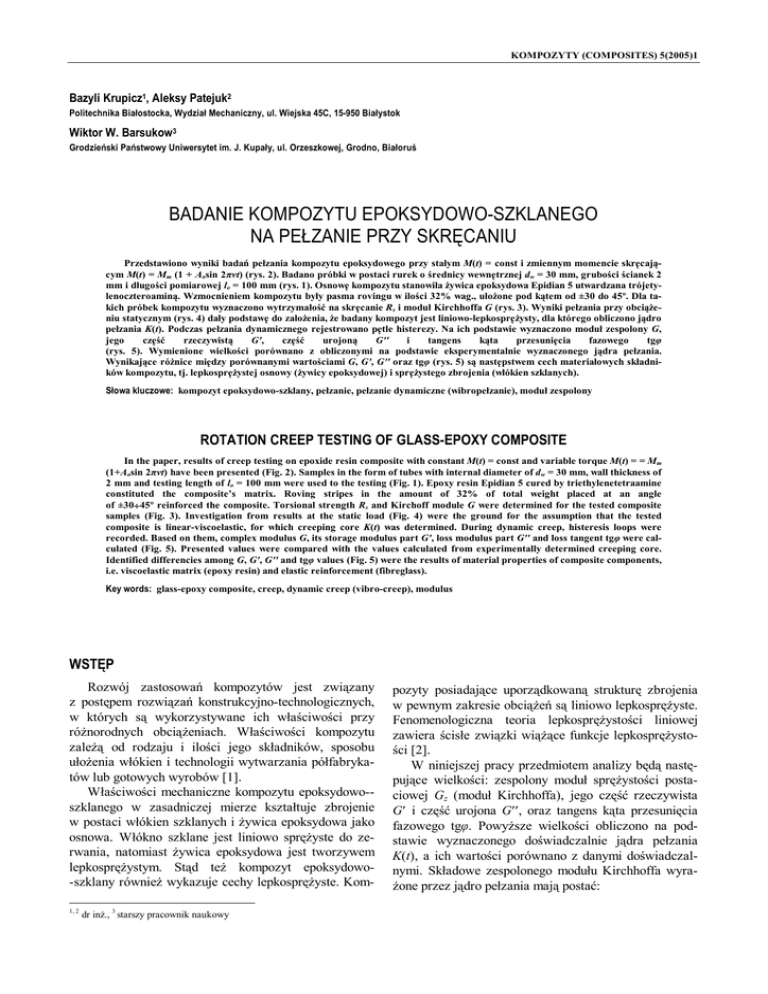 KOMPOZYTY (COMPOSITES) 5(2005)1 Bazyli Krupicz1, Aleksy Patejuk2 Politechnika Białostocka, Wydział Mechaniczny, ul. Wiejska 45C, 15-950 Białystok Wiktor W. Barsukow3 Grodzieński Państwowy Uniwersytet im. J. Kupały, ul. Orzeszkowej, Grodno, Białoruś BADANIE KOMPOZYTU EPOKSYDOWO-SZKLANEGO NA PEŁZANIE PRZY SKRĘCANIU Przedstawiono wyniki badań pełzania kompozytu epoksydowego przy stałym M(t) = const i zmiennym momencie skręcającym M(t) = Mm (1 + Aσsin 2πνt) (rys. 2). Badano próbki w postaci rurek o średnicy wewnętrznej dw = 30 mm, grubości ścianek 2 mm i długości pomiarowej lo = 100 mm (rys. 1). Osnowę kompozytu stanowiła żywica epoksydowa Epidian 5 utwardzana trójetylenoczteroaminą. Wzmocnieniem kompozytu były pasma rovingu w ilości 32% wag., ułożone pod kątem od ±30 do 45º. Dla takich próbek kompozytu wyznaczono wytrzymałość na skręcanie Rs i moduł Kirchhoffa G (rys. 3). Wyniki pełzania przy obciążeniu statycznym (rys. 4) dały podstawę do założenia, że badany kompozyt jest liniowo-lepkosprężysty, dla którego obliczono jądro pełzania K(t). Podczas pełzania dynamicznego rejestrowano pętle histerezy. Na ich podstawie wyznaczono moduł zespolony G, jego część rzeczywistą G', część urojoną G'' i tangens kąta przesunięcia fazowego tgφ (rys. 5). Wymienione wielkości porównano z obliczonymi na podstawie eksperymentalnie wyznaczonego jądra pełzania. Wynikające różnice między porównanymi wartościami G, G', G'' oraz tgφ (rys. 5) są następstwem cech materiałowych składników kompozytu, tj. lepkosprężystej osnowy (żywicy epoksydowej) i sprężystego zbrojenia (włókien szklanych). Słowa kluczowe: kompozyt epoksydowo-szklany, pełzanie, pełzanie dynamiczne (wibropełzanie), moduł zespolony ROTATION CREEP TESTING OF GLASS-EPOXY COMPOSITE In the paper, results of creep testing on epoxide resin composite with constant M(t) = const and variable torque M(t) = = Mm (1+Aσsin 2πνt) have been presented (Fig. 2). Samples in the form of tubes with internal diameter of dw = 30 mm, wall thickness of 2 mm and testing length of lo = 100 mm were used to the testing (Fig. 1). Epoxy resin Epidian 5 cured by triethylenetetraamine constituted the composite’s matrix. Roving stripes in the amount of 32% of total weight placed at an angle of ±30÷45º reinforced the composite. Torsional strength Rs and Kirchoff module G were determined for the tested composite samples (Fig. 3). Investigation from results at the static load (Fig. 4) were the ground for the assumption that the tested composite is linear-viscoelastic, for which creeping core K(t) was determined. During dynamic creep, histeresis loops were recorded. Based on them, complex modulus G, its storage modulus part G', loss modulus part G'' and loss tangent tgφ were calculated (Fig. 5). Presented values were compared with the values calculated from experimentally determined creeping core. Identified differencies among G, G', G'' and tgφ values (Fig. 5) were the results of material properties of composite components, i.e. viscoelastic matrix (epoxy resin) and elastic reinforcement (fibreglass). Key words: glass-epoxy composite, creep, dynamic creep (vibro-creep), modulus WSTĘP Rozwój zastosowań kompozytów jest związany z postępem rozwiązań konstrukcyjno-technologicznych, w których są wykorzystywane ich właściwości przy różnorodnych obciążeniach. Właściwości kompozytu zależą od rodzaju i ilości jego składników, sposobu ułożenia włókien i technologii wytwarzania półfabrykatów lub gotowych wyrobów [1]. Właściwości mechaniczne kompozytu epoksydowo-szklanego w zasadniczej mierze kształtuje zbrojenie w postaci włókien szklanych i żywica epoksydowa jako osnowa. Włókno szklane jest liniowo sprężyste do zerwania, natomiast żywica epoksydowa jest tworzywem lepkosprężystym. Stąd też kompozyt epoksydowo-szklany również wykazuje cechy lepkosprężyste. Kom1, 2 dr inż., 3 starszy pracownik naukowy pozyty posiadające uporządkowaną strukturę zbrojenia w pewnym zakresie obciążeń są liniowo lepkosprężyste. Fenomenologiczna teoria lepkosprężystości liniowej zawiera ścisłe związki wiążące funkcje lepkosprężystości [2]. W niniejszej pracy przedmiotem analizy będą następujące wielkości: zespolony moduł sprężystości postaciowej Gz (moduł Kirchhoffa), jego część rzeczywista G′ i część urojona G′′, oraz tangens kąta przesunięcia fazowego tgφ. Powyższe wielkości obliczono na podstawie wyznaczonego doświadczalnie jądra pełzania K(t), a ich wartości porównano z danymi doświadczalnymi. Składowe zespolonego modułu Kirchhoffa wyrażone przez jądro pełzania mają postać: 86 B. Krupicz, A. Patejuk, V.V. Barsukov G′ = G ′′ = 1 + Kc (1 + K c ) 2 (1) + K s2 Ks (2) (1 + K c )2 + K s2 gdzie: Kc i Ks odpowiednio cosinus i sinus przekształcenia Fouriera jądra pełzania K(t). Moduł zespolony i tgφ obliczono jako Gz = (G ′)2 + (G ′′)2 , tgϕ = G ′′ G′ (3) WARUNKI DOŚWIADCZENIA Kompozyt wykonany z żywicy epoksydowej wzmocnionej rovingiem szklanym należy do tworzyw o dużej sztywności. Jego lepkosprężyste właściwości najpełniej uwidaczniają się przy ścinaniu i dlatego ten rodzaj obciążenia wybrano do badań. Stan ścinania zrealizowano, obciążając momentem skręcającym Ms cienkościenne próbki cylindryczne. Schemat próbek pokazano na rysunku 1. Natomiast próbki obciążano zgodnie ze schematem przedstawionym na rysunku 2. Przy próbach statycznych wibrator (4) był unieruchomiony. Próbki do badań wykonano z żywicy epoksydowej wzmocnionej włóknem szklanym wielopasmowym typu E (włókno elementarne 9 μm, pasmo tex 40, żywica epoksydowa Epidian 5, utwardzacz - TECZA). Włókna szklane nie były preparowane. Pasma rovingu ułożono w sześciu warstwach. Warstwę stanowił roving nawinięty w różnych próbkach odpowiednio pod kątem α = = ±30; 35; 40; 45o w s