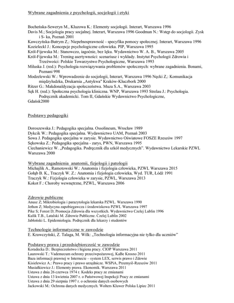 Wybrane zagadnienia z psychologii, socjologii i etyki Bocheńska-Seweryn M., Kluzowa K.: Elementy socjologii. Interart, Warszawa 1996 Davis M.; Socjologia pracy socjalnej. Interart, Warszawa 1996 Goodman N.: Wstęp do socjologii. Zysk i S- ka, Poznań 2001 Kawczyńska-Butrym Z,: Niepełnosprawność - specyfika pomocy społecznej. Interart, Warszawa 1996 Kozieleckl J.: Koncepcje psychologiczne człowieka. PIP, Warszawa 1995 Król-Fijewska M.: Stanowczo, iagoćnie, bez lęku. Wydawnictwo W. A. B., Warszawa 2005 Król-Fijewska M.: Trening asertywności: scenariusz i wykłady. Instytut Psychologii Zdrowia i Trzeźwości: Polskie Towarzystwo Psychologiczne, Warszawa 1993 Miluska J. (red.): Psychologia rozwiązywania problemów społecznych: wybrane zagadnienia. Bonami, Poznani 998 Modzelewski W.: Wprowadzenie do socjologii, Interart, Warszawa 1996 Nęcki Z,: Komunikacja międzyludzka, Drukarnia „Antykwa" Kraków-Kluczbork 2000 Ritzer G.: Makdonaldyzacja społeczeństwa. Muza S.A., Warszawa 2003 Sęk H. (red.): Społeczna psychologia kliniczna. WNP, Warszawa 1993 Strelau J.: Psychologia. Podręcznik akademicki. Tom II, Gdańskie Wydawnictwo Psychologiczne, Gdańsk2000 Podstawy pedagogiki Doroszewska J.: Pedagogika specjalna. Ossolineum, Wrocław 1989 Dykcik W.: Pedagogika specjalna. Wydawnictwo UAM, Poznań 2003 Sowa J. Pedagogika specjalna w zarysie. Wydawnictwo Oświatowe FOSZE Rzeszów 1997 Sękowska Z.: Pedagogika specjalna - zarys, PWN, Warszawa 1995 Ciechaniewicz W. „Pedagogika. Podręcznik dla szkół medycznych”. Wydawnictwo Lekarskie PZWL Warszawa 2000 Wybrane zagadnienia anatomii, fizjologii i patologii Michajlik A., Ramotowski W.: Anatomia i fizjologia człowieka, PZWL Warszawa 2015 Gołąb B. K., Traczyk W. Z.: Anatomia i fizjologia człowieka, Wyd. TUR, Łódź 1991 Traczyk W.: Fizjologia człowieka w zarysie, PZWL, Warszawa 2013 Kokot F.: Choroby wewnętrzne, PZWL, Warszawa 2006 Zdrowie publiczne Anusz Z; Mikrobiologia i parazytologia lekarska PZWL. Warszawa 1990 Jethon Z; Medycyna zapobiegawcza i środowiskowa PZWL Warszawa 1997 Pike S; Forest D; Promocja Zdrowia dla wszystkich. Wydawnictwo Czelej Lublin 1996 Kulik T.B., Latalski M. Zdrowie Publiczne. Czelej Lublin 2002 Jabłoński L. Epidemiologia. Podręcznik dla lekarzy i studentów Technologie informatyczne w zawodzie E. Krawczyński, Z. Talaga, M. Wilk: „Technologia informacyjna nie tylko dla uczniów” Podstawy prawa i przedsiębiorczość w zawodzie Koradecka D.: Bezpieczeństwo i higiena pracy. CIOP Warszawa 2011 Laurowski T.: Vademecum ochrony przeciwpożarowej, KaBe Krosno 2011 Baza informacji prawnej w Internecie – system LEX, serwis prawo i Zdowie Kisielewicz A.: Prawo pracy i prawo urzędnicze. WSPiA, Przemyśl-Rzeszów 2011 Musiałkiewicz J.: Elementy prawa. Ekonomik. Warszawa 2011 Ustawa z dnia 26 czerwca 1974 r. Kodeks pracy ze zmianami Ustawa z dnia 13 kwietnia 2007 r. o Państwowej Inspekcji Pracy ze zmianami Ustawa z dnia 29 sierpnia 1997 r. o ochronie danych osobowych Jackowski M.: Ochrona danych medycznych. Wolters Kluwer Polska Lipiec 2011 Ustawa z dnia 29 sierpnia 1997 r. Ordynacja podatkowa ze zmianami Ustawa z dnia 26 lipca 1991 r. o podatku dochodowym od osób fizycznych ze zmianami Ustawa z dnia 15 lutego 1992 r. o podatku dochodowym od osób prawnych ze zmianami Ustawa z dnia 11 marca 2004 r. o podatku od towarów i usług ze zmianami Ustawa z dnia 4 lutego 1994 r. o prawie autorskim i prawach pokrewnych ze zmianami Makieła Z., Rachwał T.: Krok w przedsiębiorczość. Nowa era Warszawa 2012 Musiałkiewicz J.: Podstawy przedsiębiorczości. Ekonomik. Warszawa 2011 Musiałkiewicz J.: Zarys przedsiębiorczości. Ekonomik. Warszawa 2012 Ustawa z dnia 19 listopada 1999 r. Prawo działalności gospodarczej ze zmianami Ustawa z dnia 2 lipca 2004 r. o swobodzie działalności gospodarczej ze zmianami Ustawa z dnia 20 sierpnia 1997 r. o Krajowym Rejestrze Sądowym ze zmianami Ustawa z dnia 15 września 2000 r. Kodeks spółek handlowych ze zmianami Ustawa z dnia 13 października 1998 r. o systemie ubezpieczeń społecznych ze zmianami Leowski J.: Polityka zdrowotna a zdrowie publiczne. Ochrona zdrowia w gospodarce rynkowej”. CeDeWu 2010 Świderska G.K.:Rachunek kosztów z Zakładzie Opieki Zdrowotnej. Warszawa 2011 Ustawa z dnia 27 sierpnia 2004 r. o świadczeniach opieki zdrowotnej finansowanych ze środków publicznych. Ustawa z dnia 15 kwietnia 2011 roku o działalności leczniczej. Język migowy Leksykon języka migowego – O. Kosiba, P. Grenda Bogatynia 2011 Język migowy w terapii – B. Szczepankowski, D. Koncewicz Wyższa Szkoła Pedagogiczna w Łodzi/Edukacyjna Grupa Projektowa Łódź 2008 Komunikowanie się z osobami z uszkodzonym słuchem – B. Szczepankowski Warszawa-Krapkowice 2005 Słownik polskiego języka miganego – J. K .Hendzel Olsztyn 2000 – B. Szczepankowski Niesłyszący – Głusi- Głuchoniemi. Wyrównywanie szans – B. Szczepankowski Warszawa 1999 Język migowy Pierwsza pomoc medyczna – B. Szczepankowski Warszawa 1996 Język migany w szkole cz. I – B. Szczepankowski Warszawa 1988 Język migany w szkole cz. II - W. Pietrzak Warszawa 1992 Język migany w szkole cz. III – I. Prałat-Pyrzewicz, J. Bajewska Warszawa 1994 Język obcy zawodowy English for nurses – David Austin, Tim Crosfield, PZWL, 2007 English in medical practice – J.P. Murray, J. Radomski, W.Szyszkowski, PZWL, 2006 Angielski w medycynie: Słownictwo I gramatyka – Piotr Flieger, CZELEJ, 2005 Ratownictwo przedmedyczne Buchfelder M., Buchwelder A. – Podręcznik pierwszej pomocy. Wydawnictwo Lekarskie PZWL, Warszawa 1999, wyd. III. Kamiński B., Dziak A. – Postępowanie z stanach zagrożenia życia. Podręcznik dla szkół medycznych. Wydawnictwo Lekarskie PZWL, Warszawa 1997. Krzywda P. – Pierwsza pomoc w nagłych wypadkach. Wydawnictwo KaBe Krosno, 2007. Madej A. – Podręcznik pierwszej pomocy. Coroby i nagłe wypadki. Wydawnictwo Amber Sp. z. o.o. 1997 Plantz S. ,Adler J. – Medycy