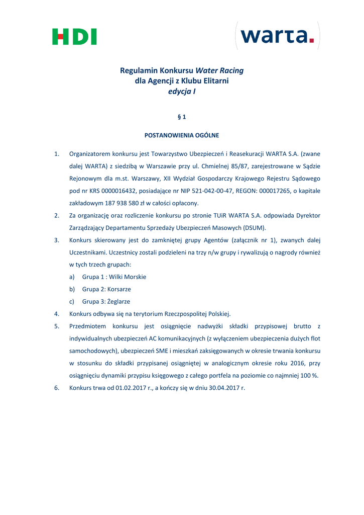 Regulamin Konkursu Water Racing dla Agencji z Klubu Elitarni edycja I §1 POSTANOWIENIA OGÓLNE 1. Organizatorem konkursu jest Towarzystwo Ubezpieczeń i Reasekuracji WARTA S.A. (zwane dalej WARTA) z siedzibą w Warszawie przy ul. Chmielnej 85/87, zarejestrowane w Sądzie Rejonowym dla m.st. Warszawy, XII Wydział Gospodarczy Krajowego Rejestru Sądowego pod nr KRS 0000016432, posiadające nr NIP 521-042-00-47, REGON: 000017265, o kapitale zakładowym 187 938 580 zł w całości opłacony. 2. Za organizację oraz rozliczenie konkursu po stronie TUiR WARTA S.A. odpowiada Dyrektor Zarządzający Departamentu Sprzedaży Ubezpieczeń Masowych (DSUM). 3. Konkurs skierowany jest do zamkniętej grupy Agentów (załącznik nr 1), zwanych dalej Uczestnikami. Uczestnicy zostali podzieleni na trzy n/w grupy i rywalizują o nagrody również w tych trzech grupach: a) Grupa 1 : Wilki Morskie b) Grupa 2: Korsarze c) Grupa 3: Żeglarze 4. Konkurs odbywa się na terytorium Rzeczpospolitej Polskiej. 5. Przedmiotem konkursu jest osiągnięcie nadwyżki składki przypisowej brutto z indywidualnych ubezpieczeń AC komunikacyjnych (z wyłączeniem ubezpieczenia dużych flot samochodowych), ubezpieczeń SME i mieszkań zaksięgowanych w okresie trwania konkursu w stosunku do składki przypisanej osiągniętej w analogicznym okresie roku 2016, przy osiągnięciu dynamiki przypisu księgowego z całego portfela na poziomie co najmniej 100 %. 6. Konkurs trwa od 01.02.2017 r., a kończy się w dniu 30.04.2017 r. §2 CEL KONKURSU 1. Celem konkursu jest aktywizacja sprzedaży indywidualnych ubezpieczeń AC komunikacyjnych, ubezpieczeń SME i mieszkań oraz zwiększenie liczby klientów ubezpieczonych w WARCIE. 2. Laureatami konkursu zostaną Uczestnicy wyłonieni i osiągający wyniki zgodnie z zasadami przewidzianymi w niniejszym Regulaminie. §3 ZASADY KONKURSU 1. Warunkiem przystąpienia Uczestnika do konkursu jest czynna umowa agencyjna zawarta z TUiR WARTA S.A., na podstawie której Uczestnik, zgodnie z potwierdzonymi zapisami oraz ze zgłoszeniem do KNF co najmniej na miesiąc przed datą rozpoczęcia konkursu, wykonuje czynności agencyjne na rzecz TUiR WARTA S.A.. Uczestnik musi być zarejestrowany w Rejestrze Agentów Ubezpieczeniowych prowadzonym przez Urząd Nadzoru Finansowego na mocy wniosku złożonego przez TUiR WARTA S.A. 2. Konkurs polega na osiągnięciu przez Agenta nadwyżki składki przypisanej brutto z indywidualnych ubezpieczeń AC komunikacyjnych (z wyłączeniem ubezpieczenia dużych flot samochodowych), ubezpieczeń SME i mieszkań zaksięgowanych w okresie trwania konkursu w stosunku do przypisu składki osiągniętej w analogicznym okresie roku 2016, przy osiągnięciu dynamiki przypisu księgowego z całego portfela na poziomie co najmniej 100 %. 3. 4. Osiągnięta nadwyżka składki będzie przeliczana na punkty zgodnie z poniższym wzorem: a) Ubezpieczenia SME – za każde 100 zł nadwyżki → 1 punkty b) Indywidualne ubezpieczenia AC komunikacyjne – za każde 100 zł nadwyżki → 1 punkt c) Ubezpieczenie mieszkań – za każde 50 zł nadwyżki → 1 punkt Dodatkowo Organizator konkursu przyzna 2 Uczestnikom „Piracką Kartę”. Aby otrzymać „Piracką Kartę” Uczestnik musi wziąć udział we wszystkich akcjach edukacyjnych odbywających się w okresie trwania konkursu i prawidłowo odpowiedzieć na pytania. Liczy się również kolejność odpowiedzi. 5. Laureatami konkursu zostanie 7 Agentów z największą łączną liczbą punktów osiągniętych z nadwyżki przypisu z indywidualnych ubezpieczeń AC komunikacyjnych (z wyłączeniem ubezpieczenia dużych flot samochodowych), ubezpieczeń SME i mieszkań oraz 2 Agentów, którzy otrzymają „Piracką Kartę” w ramach akcji edukacyjnej. Laureaci zostaną wyłonieni na podstawie rankingu ogłoszonego przez Organizatora. 6. Liczba wyłonionych laureatów z największą łączną liczbą punktów osiągniętych z nadwyżki przypisu z indywidualnych ubezpieczeń AC komunikacyjnych (z wyłączeniem ubezpieczenia dużych flot samochodowych), ubezpieczeń SME i mieszkań w poszczególnych grupach jest następująca: 7. a) Grupa 1: Wilki Morskie – 3 laureatów b) Grupa 2: Korsarze – 2 laureat c) Grupa 3: Żeglarze – 2 laureat W przypadku osiągnięcia tej samej sumy liczby punktów z indywidualnych ubezpieczeń AC komunikacyjnych (z wyłączeniem ubezpieczenia dużych flot samochodowych), ubezpieczeń SME i mieszkań o przyznaniu nagrody zgodnie z § 4 ust. 1 decyduje dodatkowy parametr jakim jest najwyższa dynamika przypisu księgowego z całego portfela w okresie trwania konkursu. 8. Za najwyższą łączną liczbę punktów osiągniętą z nadwyżki przypisu z indywidualnych ubezpieczeń AC komunikacyjnych (z wyłączeniem ubezpieczenia dużych flot samochodowych), ubezpieczeń SME i mieszkań oraz za zdobycie „Pirackiej Karty” Uczestnikom konkursu zostanie przyznana nagroda zgodnie z § 4 ust. 1. 9. Rozwiązanie umowy agencyjnej z TUiR WARTA S.A., w trakcie trwania konkursu, wiąże się z automatycznym wykluczeniem z udziału w konkursie. 10. Co tydzień podczas trwania konkursu, będzie przygotowywany Ranking Uczestników na podstawie największej łącznej liczby punktów osiągniętych z nadwyżki przypisu z indywidualnych ubezpieczeń AC komunikacyjnych (z wyłączeniem ubezpieczenia dużych flot samochodowych), ubezpieczeń SME i mieszkań. 11. Agent ma prawo do rezygnacji z nagrody, o której mowa w § 4 ust 1, brak zgody na odebranie nagrody wymaga potwierdzenia w formie pisemnej dostarczonej do TUiR WARTA S.A. na każdym etapie trwania konkursu. W tym przypadku uprawniony do odebrania nagrody jest kolejny Agent z rankingu. 12. W przypadku transferu obsługi umów ubezpieczenia pomiędzy Agentami / dealerami / doradcami ubezpieczeniowymi (np. łączenie / przejęcie obsługi portfela, zmiana formy prawnej, zatrudnianie nowych pracowników / zleceniobiorców) Komisja Konkursowa zastrzega sobie prawo indy