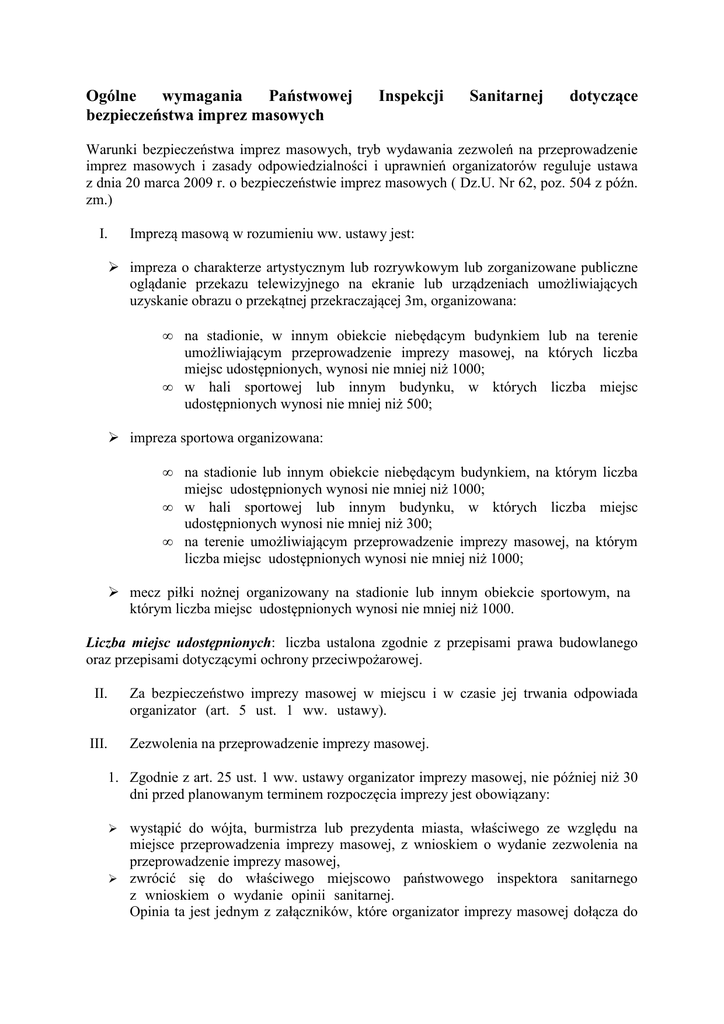 Ogólne wymagania Państwowej bezpieczeństwa imprez masowych Inspekcji Sanitarnej dotyczące Warunki bezpieczeństwa imprez masowych, tryb wydawania zezwoleń na przeprowadzenie imprez masowych i zasady odpowiedzialności i uprawnień organizatorów reguluje ustawa z dnia 20 marca 2009 r. o bezpieczeństwie imprez masowych ( Dz.U. Nr 62, poz. 504 z późn. zm.) I. Imprezą masową w rozumieniu ww. ustawy jest: impreza o charakterze artystycznym lub rozrywkowym lub zorganizowane publiczne oglądanie przekazu telewizyjnego na ekranie lub urządzeniach umożliwiających uzyskanie obrazu o przekątnej przekraczającej 3m, organizowana: • • na stadionie, w innym obiekcie niebędącym budynkiem lub na terenie umożliwiającym przeprowadzenie imprezy masowej, na których liczba miejsc udostępnionych, wynosi nie mniej niż 1000; w hali sportowej lub innym budynku, w których liczba miejsc udostępnionych wynosi nie mniej niż 500; impreza sportowa organizowana: • • • na stadionie lub innym obiekcie niebędącym budynkiem, na którym liczba miejsc udostępnionych wynosi nie mniej niż 1000; w hali sportowej lub innym budynku, w których liczba miejsc udostępnionych wynosi nie mniej niż 300; na terenie umożliwiającym przeprowadzenie imprezy masowej, na którym liczba miejsc udostępnionych wynosi nie mniej niż 1000; mecz piłki nożnej organizowany na stadionie lub innym obiekcie sportowym, na którym liczba miejsc udostępnionych wynosi nie mniej niż 1000. Liczba miejsc udostępnionych: liczba ustalona zgodnie z przepisami prawa budowlanego oraz przepisami dotyczącymi ochrony przeciwpożarowej. II. III. Za bezpieczeństwo imprezy masowej w miejscu i w czasie jej trwania odpowiada organizator (art. 5 ust. 1 ww. ustawy). . . Zezwolenia na przeprowadzenie imprezy masowej. 1. Zgodnie z art. 25 ust. 1 ww. ustawy organizator imprezy masowej, nie później niż 30 dni przed planowanym terminem rozpoczęcia imprezy jest obowiązany: wystąpić do wójta, burmistrza lub prezydenta miasta, właściwego ze względu na miejsce przeprowadzenia imprezy masowej, z wnioskiem o wydanie zezwolenia na przeprowadzenie imprezy masowej, zwrócić się do właściwego miejscowo państwowego inspektora sanitarnego z wnioskiem o wydanie opinii sanitarnej. . Opinia ta jest jednym z załączników, które organizator imprezy masowej dołącza do wniosku o wydanie zezwolenia na przeprowadzenie imprezy masowej (art. 26. ust.2 ww. ustawy) 2. Do wniosku o wydanie opinii sanitarnej organizator powinien podać m.in. następujące informacje o planowanej imprezie masowej: nazwę organizatora; rodzaj i nazwę imprezy masowej; miejsce przeprowadzenia imprezy; czas rozpoczęcia i zakończenia imprezy; wskazanie osoby reprezentującej organizatora w zakresie zapewnienia bezpieczeństwa osób uczestniczących w imprezie masowej; informacje o liczbie miejsc w obiekcie lub na terenie, gdzie będzie zorganizowana impreza i przewidywanej maksymalnej liczbie uczestników; wynik badania wody przeznaczonej do spożycia przez ludzi jeżeli było wykonane nowe przyłącze; informację o ilości zapewnionych podczas imprezy kabin WC (stacjonarnych i/lub tymczasowych, nieskanalizowanych, np. typu TOI-TOI); kserokopię umowy z podmiotem świadczącym usługi w zakresie dostaw i utrzymania bieżącej czystości tymczasowych toalet w trakcie trwania imprezy; kserokopie decyzji zatwierdzająco-rejestrującej lub wpisu do rejestru zakładów prowadzących produkcję i obrót żywnością wydanych przez właściwego terenowo Państwowego Powiatowego Inspektora Sanitarnego; kserokopię umowy z podmiotem świadczącym usługi w zakresie gospodarowania odpadami, tj. zapewnienia pojemników na odpady komunalne oraz odbioru odpadów komunalnych; informację o typie i ilości rozstawionych pojemników na odpady komunalne podczas imprezy oraz danych o jednostce odpowiedzialnej za uporządkowanie terenu po zakończeniu imprezy; wskazanie osoby reprezentującej organizatora imprezy masowej przed organem PIS wraz z numerem telefonu, faxu lub/ adresem e-mail; graficzny plan obiektu (terenu), na którym ma być przeprowadzona impreza masowa, wraz z jego opisem zawierającym: • • • • • • • oznaczenie dróg dojścia i rozchodzenia się osób uczestniczących w imprezie masowej; oznaczenie punktów pomocy medycznej; oznaczenie punktów czerpalnych wody do picia; liczbę i rozmieszczenie ustępów publicznych dla uczestników imprezy; rozmieszczenie punktów gastronomicznych; liczbę i rozmieszczenie punktów sprzedaży piwa; oznaczenie lokalizacji pojemników do gromadzenia odpadów komunalnych i ich liczbę. Wniosek o wydanie opinii sanitarnej na przeprowadzenie imprezy masowej znajduje się w zakładce „Dla Klienta”. Dodatkowe wymagania niezbędne do uzyskania pozytywnej opinii sanitarnej może każdorazowo określić właściwy ze względu na miejsce organizowania imprezy państwowy inspektor sanitarny. 3. Państwowy inspektor sanitarny wydaje opinię w terminie 14 dni od dnia otrzymania wniosku o jej wydanie. Opinia zachowuje ważność przez 6 miesięcy od dnia jej wydania. ( art.25 ust.3 i 4ww. ustawy). 4. Opinię do wniosku o wydanie zezwolenia organizator dołącza niezwłocznie, jednak nie później niż na 14 dni przed rozpoczęciem imprezy masowej (art.26 ust.2. ww. ustawy). 5. Jeżeli imprezy masowe są przeprowadzane przez tego samego organizatora w tych samych obiektach (terenach) umożliwiających przeprowadzenie imprezy masowej, co najmniej 2 razy w roku lub są to imprezy masowe, dla których opracowano terminarz imprez masowych organizowanych cyklicznie, organ wydaje zezwolenie na przeprowadzenie wskazanej przez organizatora liczby imprez masowych lub ich przeprowadzenie w okresie jednego roku. (art. 30.ust.1 ww. ustawy). 6. Jeżeli imprezy masowe są przeprowadzane przez tego samego organizatora w tych samych obiektach (terenach) umożliwiających przeprowadzenie imprezy masowej, co najmniej 2 razy w roku lub s