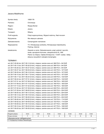 Jezera Mobilhome Symbol oferty: 1859/178 Państwo: Chorwacja Region: Wyspa Murter Miasto: Jezera Transport: Własny Profil wyjazdu: Pobyt wypoczynkowy, Wyjazd rodzinny, Nad morzem Wyżywienie: We własnym zakresie Zakwaterowanie: Camping/pole namiotowe Wyposażenie: TV, Klimatyzacja centralna, Klimatyzacja indywidualna, świadczenia: Zawarte w cenie: Zakwaterowanie, prąd, pościel i ręczniki, Parking, Internet woda, sprzątanie końcowe, ubezpieczenie KL, NW. Płatne na miejscu: Opłata klimatyczna: 1 EUR / osobę / dobę. dotyczy wszystkich rodzajów kempingów. TERMINY: od: 2017-05-06 do: 2017-05-13 (8 dni), miejsca: zamów cena od: 389 PLN = 94 EUR od: 2017-05-13 do: 2017-05-20 (8 dni), miejsca: zamów cena od: 389 PLN = 94 EUR od: 2017-05-20 do: 2017-05-27 (8 dni), miejsca: zamów cena od: 389 PLN = 94 EUR od: 2017-05-27 do: 2017-06-03 (8 dni), miejsca: zamów cena od: 442 PLN = 107 EUR od: 2017-06-03 do: 2017-06-10 (8 dni), miejsca: zamów cena od: 442 PLN = 107 EUR od: 2017-06-10 do: 2017-06-17 (8 dni), miejsca: zamów cena od: 442 PLN = 107 EUR od: 2017-06-17 do: 2017-06-24 (8 dni), miejsca: zamów cena od: 548 PLN = 132 EUR od: 2017-06-24 do: 2017-07-01 (8 dni), miejsca: zamów cena od: 548 PLN = 132 EUR od: 2017-07-01 do: 2017-07-08 (8 dni), miejsca: zamów cena od: 766 PLN = 185 EUR od: 2017-07-08 do: 2017-07-15 (8 dni), miejsca: zamów cena od: 766 PLN = 185 EUR od: 2017-07-15 do: 2017-07-22 (8 dni), miejsca: zamów cena od: 766 PLN = 185 EUR od: 2017-07-22 do: 2017-07-29 (8 dni), miejsca: zamów cena od: 930 PLN = 224 EUR od: 2017-07-29 do: 2017-08-05 (8 dni), miejsca: zamów cena od: 930 PLN = 224 EUR od: 2017-08-05 do: 2017-08-12 (8 dni), miejsca: zamów cena od: 930 PLN = 224 EUR od: 2017-08-12 do: 2017-08-19 (8 dni), miejsca: zamów cena od: 930 PLN = 224 EUR od: 2017-08-19 do: 2017-08-26 (8 dni), miejsca: zamów cena od: 930 PLN = 224 EUR od: 2017-08-26 do: 2017-09-02 (8 dni), miejsca: zamów cena od: 723 PLN = 174 EUR od: 2017-09-02 do: 2017-09-09 (8 dni), miejsca: zamów cena od: 723 PLN = 174 EUR od: 2017-09-09 do: 2017-09-16 (8 dni), miejsca: zamów cena od: 447 PLN = 108 EUR od: 2017-09-16 do: 2017-09-23 (8 dni), miejsca: zamów cena od: 447 PLN = 108 EUR od: 2017-09-23 do: 2017-09-30 (8 dni), miejsca: zamów cena od: 447 PLN = 108 EUR CENNIK: Długość pobytu: 8 dni 8 dni 8 dni 8 dni 8 dni 8 dni 8 dni Grupa cenowa: F A D C G E B Ubezpieczenie (obligatoryjne) (*) Turystyczny Fundusz Gwarancyjny 1/2 (*) Ubezpieczenie KL, NW 2.5 2.5 2.5 2.5 2.5 2.5 2.5 11 11 11 11 11 11 11 1043 728 581 1281 574 (-) (-) (-) (-) (-) Pobyt w obiekcie (do wyboru) (*) Mobilhome 4-6os standardowo dla osób: 6 minimalnie: 1 980 497 Rodzaj osoby (do wyboru) (*) Uczestnik (-) (-) Waluta: EUR Aktualne ceny z systemu S.A.R.T. (-) - cena usługi, podatku kalkulowana przy osobie lub gratis (*) - kwota wliczona w cenę standardową 2/2
