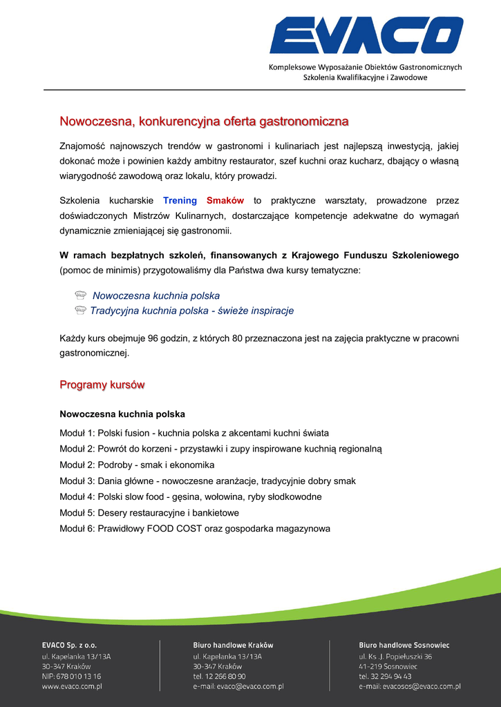 Nowoczesna, konkurencyjna oferta gastronomiczna Znajomość najnowszych trendów w gastronomi i kulinariach jest najlepszą inwestycją, jakiej dokonać może i powinien każdy ambitny restaurator, szef kuchni oraz kucharz, dbający o własną wiarygodność zawodową oraz lokalu, który prowadzi. Szkolenia kucharskie Trening Smaków to praktyczne warsztaty, prowadzone przez doświadczonych Mistrzów Kulinarnych, dostarczające kompetencje adekwatne do wymagań dynamicznie zmieniającej się gastronomii. W ramach bezpłatnych szkoleń, finansowanych z Krajowego Funduszu Szkoleniowego (pomoc de minimis) przygotowaliśmy dla Państwa dwa kursy tematyczne: Nowoczesna kuchnia polska Tradycyjna kuchnia polska - świeże inspiracje Każdy kurs obejmuje 96 godzin, z których 80 przeznaczona jest na zajęcia praktyczne w pracowni gastronomicznej. Programy kursów Nowoczesna kuchnia polska Moduł 1: Polski fusion - kuchnia polska z akcentami kuchni świata Moduł 2: Powrót do korzeni - przystawki i zupy inspirowane kuchnią regionalną Moduł 2: Podroby - smak i ekonomika Moduł 3: Dania główne - nowoczesne aranżacje, tradycyjnie dobry smak Moduł 4: Polski slow food - gęsina, wołowina, ryby słodkowodne Moduł 5: Desery restauracyjne i bankietowe Moduł 6: Prawidłowy FOOD COST oraz gospodarka magazynowa Tradycyjna kuchnia polska - świeże inspiracje Moduł 1: Przystawki, przekąski, sałatki Moduł 2: Zupy, sosy, podroby Moduł 3: Dania główne - mięso, drób Moduł 4: Dania główne - ryby, dania bezmięsne Moduł 5: Ciasta i desery Moduł 6: Organizacja pracy i planowanie w kuchni dnia codziennego Harmonogram i miejsce szkoleń terminy zjazdów 2015 Nazwa szkolenia Miejsce 1 zjazd 2 zjazd 3 zjazd 4 zjazd 5 zjazd 6 zjazd Nowoczesna kuchnia polska Kraków 2-3.03 20-21.04 18-19.05 15-16.06 13-14.07 17-18.08 Nowoczesna kuchnia polska Kraków 15-16.04 13-14.05 10-11.06 8-9.07 12-13.08 9-10.09 Sosnowiec 12-13.03 9-10.04 7-8.05 25-26.06 30-31.07 20-21.08 Nowoczesna kuchnia polska Tradycyjna kuchnia polska Kraków 4-5.03 22-23.04 20-21.05 17-18.06 15-16.07 19-20.08 Tradycyjna kuchnia polska Kraków 28-29.05 19-20.06 17-18.07 28-29.08 18-19.09 9-10.10 7-8.04 5-6.05 2-3.06 30.06-1.07 4-5.08 Tradycyjna kuchnia polska Sosnowiec 17-18.03 I dzień 10.00 - 11.30 11.30 - 11.45 11.45 - 13.15 13.15 - 14.00 14.00 - 15.30 15.30 - 15.45 15.45 - 17.15 II dzień warsztaty przerwa kawowa warsztaty lunch warsztaty przerwa kawowa warsztaty 8.30 - 10.00 10.00 -10.15 10.15 - 11.45 11.45 - 12.00 12.00 - 13.30 13.30 - 14.15 14.15 - 15.45 warsztaty przerwa kawowa warsztaty przerwa kawowa warsztaty lunch warsztat Informacje organizacyjne Warsztaty realizowane będą w grupach 10-cio osobowych. Zjazdy odbędą się w systemie 2-dniowym, raz w miesiącu. Zajęcia praktyczne, odbędą się w profesjonalnej kuchni, wielostanowiskowej, natomiast teoretyczne w klimatyzowanej sali konferencyjnej. Każdemu Uczestnikowi zapewnione zostaną zapaska kucharska, zestaw niezbędnych narzędzi oraz artykułów spożywczych oraz materiały i receptury szkoleniowe. Na ostatnim spotkaniu zostaną wręczone certyfikaty ukończenia kursu. Dojeżdżającym na szkolenie pokryte zostaną koszty dojazdu oraz noclegu. Kto może wziąć udział w programie? Pracownicy a. mają ukończone 45 lat b. zatrudnieni są na umowę o pracę c. zostali oddelegowani na szkolenie przez firmę lub instytucję Pracodawcy a. Zatrudniają minimum 1 osobę b. mają ukończone 45 lat Uczestnikami szkolenia mogą zostać osoby zatrudnione zarówno w sektorze prywatnym, jak również państwowym oraz non-profit. Kursy dla podmiotów zatrudniających do 9 osób na umowie o pracę są bezpłatne, natomiast pracodawcy zatrudniający 10 i więcej osób pokrywają 20% wartości kursu. Nie ma ograniczenia terytorialnego, związanego z województwem, gdzie znajduje się siedziba firmy. Przyjmujemy kursantów z całego kraju. Nie ma znaczenia, na jaki rodzaj umowy o pracę zatrudnieni są pracownicy, a także, czy jest to praca na pełen czy część etatu. Trenerzy Szkolenia poprowadzą najlepsi mistrzowie i eksperci kulinarni. Łączą oni wieloletnie doświadczenie zawodowe i trenerskie z pasją. Marcin Filipkiewicz Aleksandra Ścibich-Kopiec Rafał Targosz Sebastian Kopiec Adam Chrząstowski Magdalena Wiśniewska Robert Kurek Artur Kochański Mirosław Kała Krzysztof Gawlik Paweł Nowak Kontakt W celu otrzymania informacji, dotyczących przyjmowania zgłoszeń prosimy o kontakt. Paulina Jarynowska - kierownik projektu tel. 503 747 241 e-mail: [email protected]