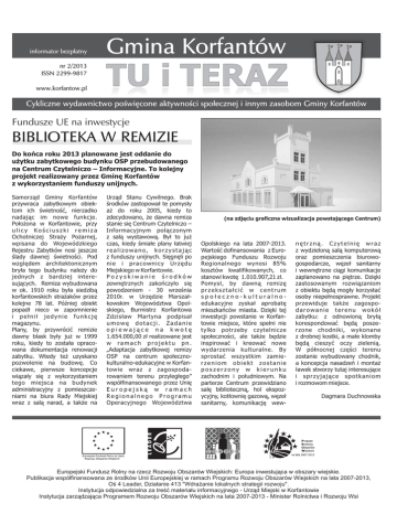 informator bezpłatny nr 2/2013 ISSN 2299-9817 www.korfantow.pl Gmina Korfantów TU i TERAZ Fundusze UE na inwestycje BIBLIOTEKA W REMIZIE Do końca roku 2013 planowane jest oddanie do użytku zabytkowego budynku OSP przebudowanego na Centrum Czytelniczo – Informacyjne. To kolejny projekt realizowany przez Gminę Korfantów z wykorzystaniem funduszy unijnych. Samorząd Gminy Korfantów przywraca zabytkowym obiektom ich świetność, nierzadko nadając im nowe funkcje. Położona w Korfantowie, przy ulicy Kościuszki remiza Ochotniczej Straży Pożarnej, wpisana do Wojewódzkiego Rejestru Zabytków nosi jeszcze ślady dawnej świetności. Pod względem architektonicznym bryła tego budynku należy do jednych z bardziej interesujących. Remiza wybudowana w ok. 1910 roku była siedzibą korfantowskich strażaków przez kolejne 78 lat. Później obiekt popadł nieco w zapomnienie i pełnił jedynie funkcję magazynu. Plany, by przywrócić remizie dawny blask były już w 1999 roku, kiedy to została opracowana dokumentacja renowacji zabytku. Wtedy też uzyskano pozwolenie na budowę. Co ciekawe, pierwsze koncepcje wiązały się z wykorzystaniem tego miejsca na budynek administracyjny z pomieszczeniami na biura Rady Miejskiej wraz z salą narad, a także na Urząd Stanu Cywilnego. Brak środków zastopował te pomysły aż do roku 2005, kiedy to zdecydowano, że dawna remiza stanie się Centrum Czytelniczo – Informacyjnym połączonym z salą wystawową. Był to już czas, kiedy śmiałe plany łatwiej realizowano, korzystając z funduszy unijnych. Sięgnęli po nie i pracownicy Urzędu Miejskiego w Korfantowie. Pozyskiwanie środków zewnętrznych zakończyło się powodzeniem - 30 września 2010r. w Urzędzie Marszałkowskim Województwa Opolskiego, Burmistrz Korfantowa Zdzisław Martyna podpisał umowę dotacji. Zadanie opiewające na kwotę 1.654.000,00 zł realizowane jest w ramach projektu pn. „Adaptacja zabytkowej remizy OSP na centrum społecznokulturalno-edukacyjne w Korfantowie wraz z zagospodarowaniem terenu przyległego” współfinansowanego przez Unię Europejską w ramach Regionalnego Programu Operacyjnego Województwa (na zdjęciu graficzna wizualizacja powstającego Centrum) Opolskiego na lata 2007-2013. Wartość dofinansowania z Europejskiego Funduszu Rozwoju Regionalnego wynosi 85% kosztów kwalifikowanych, co stanowi kwotę 1.010.907,21 zł. Pomysł, by dawną remizę przekształcić w centrum społeczno-kulturalnoedukacyjne zyskał aprobatę mieszkańców miasta. Dzięki tej inwestycji powstanie w Korfantowie miejsce, które spełni nie tylko potrzeby czytelnicze społeczności, ale także będzie inspirować i kreować nowe wydarzenia kulturalne. By sprostać wszystkim zamierzeniom obiekt zostanie poszerzony w kierunku zachodnim i południowym. Na parterze Centrum przewidziano salę biblioteczną, hol ekspozycyjny, kotłownię gazową, węzeł sanitarny, komunikację wew- nętrzną. Czytelnię wraz z wydzieloną salą komputerową oraz pomieszczenia biurowogospodarcze, węzeł sanitarny i wewnętrzne ciągi komunikacje zaplanowano na piętrze. Dzięki zastosowanym rozwiązaniom z obiektu będą mogły korzystać osoby niepełnosprawne. Projekt przewiduje także zagospodarowanie terenu wokół zabytku: z odnowioną bryłą korespondować będą poszerzone chodniki, wykonane z drobnej kostki, a małe klomby będą cieszyć oczy zielenią. W północnej części terenu zostanie wybudowany chodnik, a koncepcja nasadzeń i montaż ławek stworzy tutaj interesujące i sprzyjające spotkaniom i rozmowom miejsce. Dagmara Duchnowska Europejski Fundusz Rolny na rzecz Rozwoju Obszarów Wiejskich: Europa inwestująca w obszary wiejskie. Publikacja współfinansowana ze środków Unii Europejskiej w ramach Programu Rozwoju Obszarów Wiejskich na lata 2007-2013, Oś 4 Leader, Działanie 413 "Wdrażanie lokalnych strategii rozwoju". Instytucja odpowiedzialna za treść materiału informacyjnego - Urząd Miejski w Korfantowie Instytucja zarządzająca Programem Rozwoju Obszarów Wiejskich na lata 2007-2013 - Minister Rolnictwa i Rozwoju Wsi Aktywność społeczna Piękna Wieś Opolska WYGRAJMY KOLEJNY RAZ Zapraszamy do udziału w szesnastej edycji konkursu „Piękna Wieś Opolska 2013”. W tegorocznym konkursie uczestnicy będą oceniani w pięciu kategoriach : „Najpiękniejsza wieś” - udział może wziąć każda miejscowość wiejska o statusie sołectwa. „Najlepszy start w odnowie wsi” - do tej kategorii można zgłosić wieś, która przystąpiła do programu Odnowy Wsi w województwie opolskim w latach 2009 – 2012. „Najlepszy projekty odnowy wsi” - udział mogą wziąć przedsięwzięcia, których zakończenie realizacji nastąpiło w latach 2009 -2013 wykonane w ramach realizacji programu Odnowa Wsi, zgodne z Planem Odnowy Miejscowości. „Najlepsza zagroda wiejska” - udział może wziąć zagroda znajdująca się na terenie wsi, o obecnych bądź dawnych funkcjach gospodarstwa rolnego (prowadzącego produkcję roślinną lub zwierzęcą), która jest miejscem zamieszkania rodziny oraz pracy przynajmniej jednego z jej członków. Dopuszcza się udział zagród położonych w granicach miasta, na terenie o charakterze wiejskim. W roku 2013 sołectwa , które zdecydują się na udział w konkursie „Piękna wieś Opolska 2013” będą mogły się ubiegać o tytuł „Wieś dziedzictwa kulturowego” tj. miejscowość o wysokim zasobie kulturowym, wyróżniająca się z pośród innych dzięki specyfice i występowaniu kluczowego tematu przewodniego oraz posiadającej wyjątkowy i niepowtarzalny klimat. Kryteria oceny odnoszą się do aktywności społeczności lokalnej, zorganizowania procesu odnowy, dbałość o zachowanie i kształtowanie krajobrazu wiejskiego oraz kryteriów akcji „Wieś przyszłości”. Szczegółowy regulamin konkursu oraz pozostałe informacje dostępne są na stronie internetowej www.odnowawsi.eu w zakładce Program Odnowy W