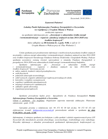 Szczecinek, 24.03.2016 r. Szanowni Państwo! Lokalny Punkt Informacyjny Funduszy Europejskich w Szczecinku we współpracy z Urzędem Miasta w Wałczu serdecznie zaprasza na spotkanie informacyjne pn.: „Inwestycje w odnawialne źródła energii i termomodernizacje – wsparcie z funduszy unijnych na lata 2014-2020 oraz środków krajowych” które odbędzie się 08 kwietnia br. o godz. 9:00, w sali nr 11 Urzędu Miasta w Wałczu przy ul. Plac Wolności 1. Celem spotkania jest przedstawienie informacji o możliwościach pozyskania środków unijnych na projekty z zakresu energii odnawialnej i termomodernizacji z funduszy unijnych na lata 2014-2020 oraz środków krajowych Narodowego Funduszu Ochrony Środowiska i Gospodarki Wodnej. Podczas spotkania uczestniczy zostaną również wprowadzeni w tematykę Funduszy Europejskich w perspektywie 2014-2020 oraz odnawialnych źródeł energii i termomodernizacji budynków. Spotkanie informacyjne pn.: „Inwestycje w odnawialne źródła energii i termomodernizacje – wsparcie z funduszy unijnych na lata 2014-2020 oraz środków krajowych” kierowane jest do: mikro, małych, średnich i dużych przedsiębiorców, osób fizycznych, jednostek samorządu terytorialnego, szkół wyższych, organów administracji rządowej prowadzących szkoły, kościołów i związków wyznaniowych, wspólnot i spółdzielni mieszkaniowych, instytucji oświatowych i opiekuńczych, zakładów opieki zdrowotnej, organizacji pozarządowych. Spotkanie prowadzone będzie przez Specjalistów ds. Funduszy Europejskich Punktu Informacyjnego Funduszy Europejskich w Szczecinku. Udział w spotkaniu jest bezpłatny. Organizator zapewnia materiały edukacyjne. Planowane zakończenie - godz. 13:00. Uprzejmie prosimy o telefoniczne (tel. 94 372 92 50 lub tel./fax. 94 372 92 47) lub elektroniczne (e-mail: [email protected]) potwierdzenie udziału w spotkaniu do dnia 07.04.2016 r. do godz. 12:00. Informujemy, iż niniejsze spotkanie jest kolejnym z cyklu spotkań i szkoleń organizowanych przez LPI Szczecinek dla mieszkańców powiatu drawskiego, szczecineckiego, świdwińskiego oraz wałeckiego. Wszystkie informacje o aktualnie prowadzonych spotkaniach informacyjnych, konferencjach czy Projekt współfinansowany przez Unię Europejską z Funduszu Spójności w ramach Programu Operacyjnego Pomoc Techniczna 2014-2020 szkoleniach można uzyskać śledząc następujące strony internetowe: www.funduszeeuropejskie.gov.pl lub www.rpo.wzp.pl w zakładce: Weź udział w konferencjach i szkoleniach. Organizator szkolenia: Lokalny Punkt Informacyjny Funduszy Europejskich w Szczecinku Ul. 28 Lutego 16 78 – 400 Szczecinek Tel.: 94 372 92 50 lub 94 372 92 47 e-mail: [email protected] Zaprasza zespół LPI: Małgorzata Kucharska-Kazirod Magdalena Wójciszyn Piotr Rozmus Projekt współfinansowany przez Unię Europejską z Funduszu Spójności w ramach Programu Operacyjnego Pomoc Techniczna 2014-2020