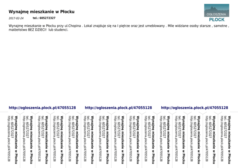 Wynajmę mieszkanie w Płocku tel.: 605272327 2017-02-24 Wynajmę mieszkanie w Płocku przy ul.Chopina . Lokal znajduje się na I piętrze oraz jest umeblowany . Mile widziane osoby starsze , samotne , małżeństwo BEZ DZIECI! lub studenci. http://ogloszenia.plock.pl/47055128 http://ogloszenia.plock.pl/47055128 http://ogloszenia.plock.pl/47055128 Wynajmę mieszkanie w Płocku tel.: 605272327 http://ogloszenia.plock.pl/47055128 Wynajmę mieszkanie w Płocku tel.: 605272327 http://ogloszenia.plock.pl/47055128 Wynajmę mieszkanie w Płocku tel.: 605272327 http://ogloszenia.plock.pl/47055128 Wynajmę mieszkanie w Płocku tel.: 605272327 http://ogloszenia.plock.pl/47055128 Wynajmę mieszkanie w Płocku tel.: 605272327 http://ogloszenia.plock.pl/47055128 Wynajmę mieszkanie w Płocku tel.: 605272327 http://ogloszenia.plock.pl/47055128 Wynajmę mieszkanie w Płocku tel.: 605272327 http://ogloszenia.plock.pl/47055128 Wynajmę mieszkanie w Płocku tel.: 605272327 http://ogloszenia.plock.pl/47055128 Wynajmę mieszkanie w Płocku tel.: 605272327 http://ogloszenia.plock.pl/47055128 Wynajmę mieszkanie w Płocku tel.: 605272327 http://ogloszenia.plock.pl/47055128 Wynajmę mieszkanie w Płocku tel.: 605272327 http://ogloszenia.plock.pl/47055128 Wynajmę mieszkanie w Płocku tel.: 605272327 http://ogloszenia.plock.pl/47055128 Wynajmę mieszkanie w Płocku tel.: 605272327 http://ogloszenia.plock.pl/47055128 Wynajmę mieszkanie w Płocku tel.: 605272327 http://ogloszenia.plock.pl/47055128 Wynajmę mieszkanie w Płocku tel.: 605272327 http://ogloszenia.plock.pl/47055128
