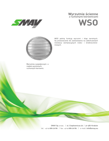 Wyrzutnie œcienne z ruchomymi kierownicami WSO WSO pe³ni¹ funkcjê wyrzutni i klap zwrotnych. S¹ przeznaczone do zastosowania na zakoñczeniach instalacji wentylacyjnych nisko- i œredniociœnieniowych. Wyrzutnia z pojedynczym rzêdem poziomych, ruchomych kierownic. SMAY Sp. z o.o. / ul. Ciep³ownicza 29 / 31-587 Kraków tel. +48 12 680 20 80 / fax. +48 12 680 20 89 / e-mail: [email protected] Wyrzutnie œcienne WSO Wykonanie Ruchome kierownice WSO pe³ni¹ rolê klapy zwrotnej i ulegaj¹ samoczynnemu zamkniêciu w przypadku wy³¹czenia wentylatora. Kierownice s¹ wykonane z aluminium. Ramka jest standardowo wykonana ze stali ocynkowanej. Na zamówienie mo¿liwe jest lakierowanie na kolor RAL oraz wykonanie specjalne: ramka ze stali nierdzewnej i aluminiowe kierownice lub ramka i kierownice wykonane z aluminium. Monta¿ WSO mo¿na montowaæ do przegrody wkrêtami poprzez otwory w ramce fasadowej. Wymiary d [mm] e [mm] g [mm] a [mm] 100 40 30 5 125 40 30 5 160 40 30 5 200 40 30 5 250 60 30 10 315 60 30 10 355 60 30 10 400 60 30 10 500 60 30 10 630 60 30 10 710 60 40 10 800 60 40 10 1000 60 40 10 Akcesoria i sposób zamówienia Przy zamówieniu nale¿y podaæ informacje wed³ug poni¿szego sposobu: WSO - <D> - <P><RAL> Gdzie: <D> <P> <RAL> - œrednica nominalna w mm - wykoñczenie: * SO – ramka stal ocynkowana, kierownice aluminiowe SL – ramka stal lakierowana, kierownice aluminiowe lakierowane AA – ramka i kierownice aluminiowe anodyzowane AL – ramka i kierownice aluminiowe lakierowane SN – ramka stal nierdzewna 1.4301 (wg PN-EN 10088), kierownice aluminiowe - kolor wg palety RAL (dla wykoñczenia SL, AL) * * wartoœci opcjonalne, w przypadku ich nie podania zostan¹ zastosowane wartoœci domyœlne Przyk³ad zamówienia: WSO – 125 - SL9010 2 wersja 5.2.2