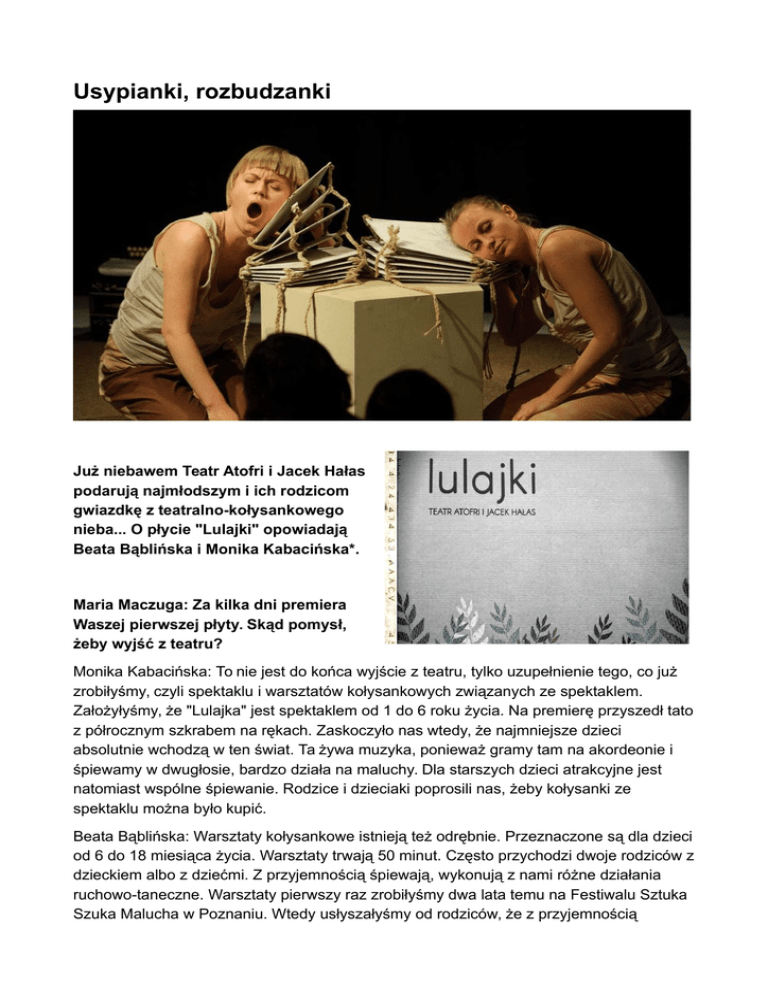 Usypianki, rozbudzanki Już niebawem Teatr Atofri i Jacek Hałas podarują najmłodszym i ich rodzicom gwiazdkę z teatralno-kołysankowego nieba... O płycie "Lulajki" opowiadają Beata Bąblińska i Monika Kabacińska*. Maria Maczuga: Za kilka dni premiera Waszej pierwszej płyty. Skąd pomysł, żeby wyjść z teatru? Monika Kabacińska: To nie jest do końca wyjście z teatru, tylko uzupełnienie tego, co już zrobiłyśmy, czyli spektaklu i warsztatów kołysankowych związanych ze spektaklem. Założyłyśmy, że "Lulajka" jest spektaklem od 1 do 6 roku życia. Na premierę przyszedł tato z półrocznym szkrabem na rękach. Zaskoczyło nas wtedy, że najmniejsze dzieci absolutnie wchodzą w ten świat. Ta żywa muzyka, ponieważ gramy tam na akordeonie i śpiewamy w dwugłosie, bardzo działa na maluchy. Dla starszych dzieci atrakcyjne jest natomiast wspólne śpiewanie. Rodzice i dzieciaki poprosili nas, żeby kołysanki ze spektaklu można było kupić. Beata Bąblińska: Warsztaty kołysankowe istnieją też odrębnie. Przeznaczone są dla dzieci od 6 do 18 miesiąca życia. Warsztaty trwają 50 minut. Często przychodzi dwoje rodziców z dzieckiem albo z dziećmi. Z przyjemnością śpiewają, wykonują z nami różne działania ruchowo-taneczne. Warsztaty pierwszy raz zrobiłyśmy dwa lata temu na Festiwalu Sztuka Szuka Malucha w Poznaniu. Wtedy usłyszałyśmy od rodziców, że z przyjemnością posłuchaliby w domu kołysanek, które śpiewamy na warsztatach. Jak się czułyście w nowej nieteatralnej roli? Każdy spektakl jest inny. Obserwujecie reakcje widzów i niektóre spektakle jeszcze po premierze zmieniacie. Wydana płyta nie daje takiej możliwości. M. K.: Mimo że jesteśmy muzykami, to czułyśmy, że przyda nam się wsparcie związane z aranżacją całości, dlatego poprosiłyśmy o pomoc Jacka Hałasa. Stworzył kompozycje bardzo inspirujące wyobraźnię, bardzo teatralne, do każdej z kołysanek wymyślił osobną historię. W związku z tym, że materiał miałyśmy ograny i ośpiewany, była to kwestia połączenia sił. To spotkanie z "Lulajkami" będzie podobne do poprzednich czy zupełnie inne? B.B.: Cały materiał pochodzi ze spektaklu. Jest jeszcze jedna kołysanka, którą śpiewamy tylko i wyłącznie na warsztatach. Mamy siedem lulajek i jedną powtarzamy w dwóch różnych wersjach. Płyta w warstwie muzycznej jest dużo bardziej barwna niż spektakl. Jakie instrumenty usłyszymy? M.K.: Jacek Hałas gra na akordeonie, altówce i na bębnie radomskim strojonym. Zaprosiliśmy Jacka Pietraszka, który użyczył nam skrzypiec góralskich. Jest góralem i lutnikiem. Michał Garstecki gra na kontrabasie. Płytę nagrywaliśmy we Free Fly Music Studio. B.B.: Na płycie znalazło się kilka ciekawych dźwiękowych pomysłów Jacka, np. dźwięk chodaków. Stukanie drewnianych chodaków było nagrywane na żywo i obrazuje chodzenie matki po izbie. Zarejestrowaliśmy również dmuchanie w gliniane ptaszki, głosyszepty dzieci. Jacek wymyślił historię o dzieciach, które leżą w łóżkach i nie chcą spać, śpiewamy im kołysankę, żeby zasnęły, lecz one cały czas szepczą sobie coś do ucha. "Lulajki" są usypiankami, dla mam chcących ukołysać dzieci, czy rozbudzankami, wciągającymi maluchy w muzyczną zabawę? M.K.: Jak przesłuchujemy całą płytę, to są na niej kołysanki do usypiania, ale również do rozbudzania i do tańca. Zaczyna się dosyć nastrojowo i kończy się nastrojowo. W połowie pojawia się pozytywka ze spektaklu i warsztatów. Z utworu na utwór narasta energia i akcja. Dzieci, jak to usłyszą, raczej będą się śmiać, tańczyć i bawić. Ludowe piosenki skłoniły Was do utrzymania tradycyjnych melodii czy pokusiłyście się o kilka współczesnych nut? B.B.: Ostatnia kołysanka jest w "wersji nocnej", z kontrabasem. Robi się bardzo jazzowo, więc wychodzimy troszeczkę poza folkowy świat. Było coś, co Was zdziwiło podczas nagrań? B.B.: Zaskoczyło nas jak Jacek Hałas wspaniale rozwinął i rozciągnął historie do każdej z kołysanek, które w spektaklu "Lulajka" trwają bardzo krótko. Jacek z każdej krótkiej piosenki zrobił utwory-obrazy, których przyjemnie się słucha. Teatr dla najnajów działa w Polsce prężnie, o koncertach raczej nie słychać. Planujecie trasę koncertową? B.B.: Tak, jest taki pomysł na przyszły sezon artystyczny. Mamy nadzieję, że wspólnie z Jackiem zagramy koncert lulajkowy dla najmłodszych dzieci. W tej chwili zachęcamy do zakupu płyty, by śpiewać lulajki wspólnie z dziećmi. rozmawiała Maria Maczuga *Beata Bąblińska i Monika Kabacińska - założycielki Teatru Atofri, dedykowanego najnajmłodszym widzom (0-5 lat). Działają w Poznaniu od 2008 r. Swoje spektakle (powstało ich kilkanaście) prezentują w CK Zamek, Scenie Wspólnej, Starym Browarze i Muzeum Archeologicznym. • • • • "Lulajki" - płyta Teatru Atofri i Jacka Hałasa premiera: 22.05 wyd. Free Fly Music Studio Poznań 2016 • spektakl "Lulajka" i warsztaty "Kołysanki, mruczanki, lulajki" • Scena Wspólna • 22.05, g. 10.30 i 12 (spektakle), g. 13 (warsztaty) Zobacz także • Teatr Atofri opublikowano: 2016-05-19 http://kultura.poznan.pl/mim/kultura/news/rozmowy,c,7/usypianki-rozbudzanki,94379.html