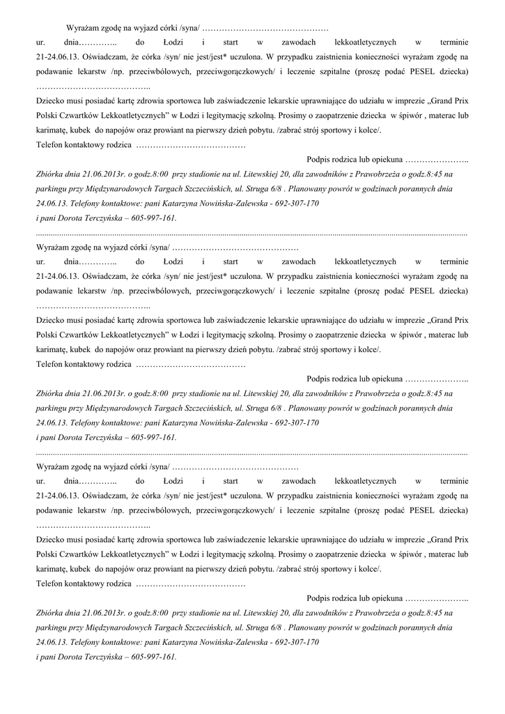Wyrażam zgodę na wyjazd córki /syna/ ……………………………………… ur. dnia………….. do Łodzi i start w zawodach lekkoatletycznych w terminie 21-24.06.13. Oświadczam, że córka /syn/ nie jest/jest* uczulona. W przypadku zaistnienia konieczności wyrażam zgodę na podawanie lekarstw /np. przeciwbólowych, przeciwgorączkowych/ i leczenie szpitalne (proszę podać PESEL dziecka) ………………………………….. Dziecko musi posiadać kartę zdrowia sportowca lub zaświadczenie lekarskie uprawniające do udziału w imprezie „Grand Prix Polski Czwartków Lekkoatletycznych” w Łodzi i legitymację szkolną. Prosimy o zaopatrzenie dziecka w śpiwór , materac lub karimatę, kubek do napojów oraz prowiant na pierwszy dzień pobytu. /zabrać strój sportowy i kolce/. Telefon kontaktowy rodzica ………………………………… Podpis rodzica lub opiekuna ………………….. Zbiórka dnia 21.06.2013r. o godz.8:00 przy stadionie na ul. Litewskiej 20, dla zawodników z Prawobrzeża o godz.8:45 na parkingu przy Międzynarodowych Targach Szczecińskich, ul. Struga 6/8 . Planowany powrót w godzinach porannych dnia 24.06.13. Telefony kontaktowe: pani Katarzyna Nowińska-Zalewska - 692-307-170 i pani Dorota Terczyńska – 605-997-161. ............................................................................................................................................................................................................ Wyrażam zgodę na wyjazd córki /syna/ ……………………………………… ur. dnia………….. do Łodzi i start w zawodach lekkoatletycznych w terminie 21-24.06.13. Oświadczam, że córka /syn/ nie jest/jest* uczulona. W przypadku zaistnienia konieczności wyrażam zgodę na podawanie lekarstw /np. przeciwbólowych, przeciwgorączkowych/ i leczenie szpitalne (proszę podać PESEL dziecka) ………………………………….. Dziecko musi posiadać kartę zdrowia sportowca lub zaświadczenie lekarskie uprawniające do udziału w imprezie „Grand Prix Polski Czwartków Lekkoatletycznych” w Łodzi i legitymację szkolną. Prosimy o zaopatrzenie dziecka w śpiwór , materac lub karimatę, kubek do napojów oraz prowiant na pierwszy dzień pobytu. /zabrać strój sportowy i kolce/. Telefon kontaktowy rodzica ………………………………… Podpis rodzica lub opiekuna ………………….. Zbiórka dnia 21.06.2013r. o godz.8:00 przy stadionie na ul. Litewskiej 20, dla zawodników z Prawobrzeża o godz.8:45 na parkingu przy Międzynarodowych Targach Szczecińskich, ul. Struga 6/8 . Planowany powrót w godzinach porannych dnia 24.06.13. Telefony kontaktowe: pani Katarzyna Nowińska-Zalewska - 692-307-170 i pani Dorota Terczyńska – 605-997-161. ............................................................................................................................................................................................................ Wyrażam zgodę na wyjazd córki /syna/ ……………………………………… ur. dnia………….. do Łodzi i start w zawodach lekkoatletycznych w terminie 21-24.06.13. Oświadczam, że córka /syn/ nie jest/jest* uczulona. W przypadku zaistnienia konieczności wyrażam zgodę na podawanie lekarstw /np. przeciwbólowych, przeciwgorączkowych/ i leczenie szpitalne (proszę podać PESEL dziecka) ………………………………….. Dziecko musi posiadać kartę zdrowia sportowca lub zaświadczenie lekarskie uprawniające do udziału w imprezie „Grand Prix Polski Czwartków Lekkoatletycznych” w Łodzi i legitymację szkolną. Prosimy o zaopatrzenie dziecka w śpiwór , materac lub karimatę, kubek do napojów oraz prowiant na pierwszy dzień pobytu. /zabrać strój sportowy i kolce/. Telefon kontaktowy rodzica ………………………………… Podpis rodzica lub opiekuna ………………….. Zbiórka dnia 21.06.2013r. o godz.8:00 przy stadionie na ul. Litewskiej 20, dla zawodników z Prawobrzeża o godz.8:45 na parkingu przy Międzynarodowych Targach Szczecińskich, ul. Struga 6/8 . Planowany powrót w godzinach porannych dnia 24.06.13. Telefony kontaktowe: pani Katarzyna Nowińska-Zalewska - 692-307-170 i pani Dorota Terczyńska – 605-997-161.