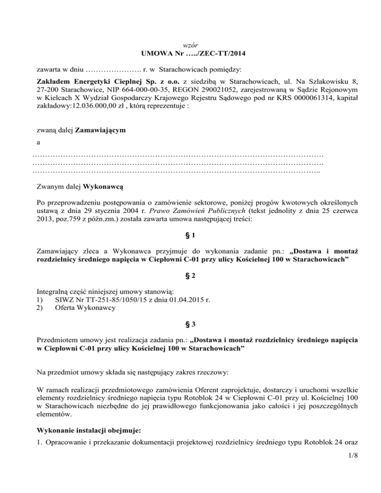 wzór UMOWA Nr …../ZEC-TT/2014 zawarta w dniu …………………. r. w Starachowicach pomiędzy: Zakładem Energetyki Cieplnej Sp. z o.o. z siedzibą w Starachowicach, ul. Na Szlakowisku 8, 27-200 Starachowice, NIP 664-000-00-35, REGON 290021052, zarejestrowaną w Sądzie Rejonowym w Kielcach X Wydział Gospodarczy Krajowego Rejestru Sądowego pod nr KRS 0000061314, kapitał zakładowy:12.036.000,00 zł , którą reprezentuje : zwaną dalej Zamawiającym a …………………………………………………………………………………………………… …………………………………………………………………………………………………… ………………………………………………………………………………………………….. Zwanym dalej Wykonawcą Po przeprowadzeniu postępowania o zamówienie sektorowe, poniżej progów kwotowych określonych ustawą z dnia 29 stycznia 2004 r. Prawo Zamówień Publicznych (tekst jednolity z dnia 25 czerwca 2013, poz.759 z późn.zm.) została zawarta umowa następującej treści: §1 Zamawiający zleca a Wykonawca przyjmuje do wykonania zadanie pn.: „Dostawa i montaż rozdzielnicy średniego napięcia w Ciepłowni C-01 przy ulicy Kościelnej 100 w Starachowicach” §2 Integralną część niniejszej umowy stanowią: 1) SIWZ Nr TT-251-85/1050/15 z dnia 01.04.2015 r. 2) Oferta Wykonawcy §3 Przedmiotem umowy jest realizacja zadania pn.: „Dostawa i montaż rozdzielnicy średniego napięcia w Ciepłowni C-01 przy ulicy Kościelnej 100 w Starachowicach” Na przedmiot umowy składa się następujący zakres rzeczowy: W ramach realizacji przedmiotowego zamówienia Oferent zaprojektuje, dostarczy i uruchomi wszelkie elementy rozdzielnicy średniego napięcia typu Rotoblok 24 w Ciepłowni C-01 przy ul. Kościelnej 100 w Starachowicach niezbędne do jej prawidłowego funkcjonowania jako całości i jej poszczególnych elementów. Wykonanie instalacji obejmuje: 1. Opracowanie i przekazanie dokumentacji projektowej rozdzielnicy średniego typu Rotoblok 24 oraz 1/8 dokonanie niezbędnych uzgodnień. 2. Demontaż istniejącej rozdzielnicy średniego napięcia wraz z przekazaniem Zamawiającemu odpadów metalowych (na miejsce przez niego wskazane na terenie ciepłowni) i odebraniem pozostałych odpadów. 3. Dostawę wszystkich urządzeń oraz materiałów niezbędnych do budowy nowej rozdzielnicy. 4. Wykonanie wszelkich prac montażowych, budowlanych oraz elektrycznych i AKPiA. 5. Przebudowę urządzeń i instalacji znajdujących się poza granicą dostaw, jeżeli konieczność przebudowy wynika z realizacji zamówienia. 6. Wykonanie badań i pomiarów odbiorowych wymienionej rozdzielni. 7. Przeszkolenie pracowników obsługi rozdzielni. 8. Inne elementy i prace niezbędne do prawidłowego funkcjonowania instalacji i osiągnięcia parametrów technicznych określonych w niniejszej specyfikacji Wymagania dotyczące rozdzielni średniego napięcia 1. Należy zaprojektować i wykonać całkowicie nową rozdzielnice średniego napięcia typu Rotoblok 24 w Ciepłowni C-01 w Starachowicach przy ulicy Kościelnej 100. Starą rozdzielnie należy całkowicie zdemontować. 2. Nowa rozdzielnica ma się składać z następujących elementów: a) Pole wyłącznikowe transformatorowe typu RWT nr 3,6 - Odłącznik GTR 4 24.06.16 z uziemieniem dolnym, napęd ręczny standardowy, - Wyłącznik VD4/R 24.06.16 próżniowy, wykonanie stacjonarne, napęd ręczny, - Przekładniki typu IP 24 szt. 3, zabezpieczenie typu REF610, - Sygnalizacja obecności napięcia, obwody wtórne pola. b) Pole transformatorowe typu RT1 nr 1,8 - rozłącznik typu GTR 2V 24.06.16 z uziemieniem dolnym, podstawy bezpiecznikowe, napęd ręczny zasobnikowy, blokada drzwi, tor szynowy Cu c) Pole liniowe typu RL1 nr 4 - rozłącznik typu GTR 4 z uziemnikiem dolnym, napęd ręczny, blokada drzwi, tor szynowy Cu, d) Pole pomiarowe typu RP1 nr 2,7 - odłącznik GTR 4 z uziemnikiem dolnym, napęd ręczny, blokada drzwi, tor szynowy Cu - przekładnik prądowy TPU … …/5A, … VA, kl. 0,5, leg. szt. 3, - przekładnik napięciowy UMZ …-1, … VA, kl. 0,5, leg szt. 3, - podstawy bezpiecznikowe PBPM – 20 szt. 3, - wkładki bezpiecznikowe WBP-20/0,5A szt. 3. e) Pole liniowe typu RŁ2 nr 5 - tor szynowy Cu, sygnalizacja obecności napięcia. 3. Dostawa rozdzielnicy obejmuje: - wkładki bezpiecznikowe SN 24/… szt. 6, - uzgadniacz faz typu WNF szt. 1, - blokada elektryczna uniemożliwiająca załączenie pola sprzęgłowego przy załączonych polach linowych. Roboty montażowe 1. Wykonanie dokumentacji projektowej, uzgodnienia z Zakładem Energetycznym, 2. Demontaż w podziale na sekcje istniejącej rozdzielnicy SN, 3. Dostawa i montaż rozdzielni typu Rotoblok 24 prod. ZPUE z wyłącznikami VD4 prod. ABB w polach liniowych, 4. Wykonanie połączenia kablowego między sekcjami projektowanej rozdzielnicy SN, 2/8 5. Wykonanie połączenia kablowego między projektowaną rozdzielnicą SN a transformatorami rozdzielczymi, 6. Przedłużenie istniejących kabli zasilających, 7. Wykonanie wewnętrznej instalacji oświetleniowej i gniazd wtyczkowych w pomieszczeniu rozdzielnicy SN, 8. Wymianę kabli łączących tablicę pomiarową z polami pomiarowymi rozdzielnicy SN, 9. Wykonanie instalacji uziemiającej w pomieszczeniu rozdzielnicy SN i połączenie z istniejącym uziemieniem, 10. Pomiary wykonanych instalacji i montowanych urządzeń, 11. Dostarczenie sprzętu BHP i ppoż. dla pomieszczenia rozdzielnicy SN, 12. Malowanie pomieszczenia rozdzielnicy SN. Wszystkie w/w elementy zamówienia zostały ujęte w cenie umownej. §4 1. Termin realizacji przedmiotu umowy ustala się do dnia – 31.07.2015 r. 2. Zamawiający przekaże Wykonawcy teren budowy w terminie 7 dni od dnia podpisania umowy. 3. Zamawiający zapłaci Wykonawcy wynagrodzenie wynikające z umowy za wykonane i odebrane roboty. §5 Wykonawca zobowiązuje się: 1. Wykonać przedmiot umow