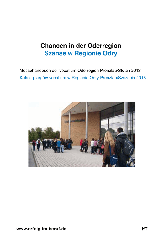 Chancen in der Oderregion Szanse w Regionie Odry Messehandbuch der vocatium Oderregion Prenzlau/Stettin 2013 Katalog targów vocatium w Regionie Odry Prenzlau/Szczecin 2013 www.erfolg-im-beruf.de IfT 2 Enertrag..........................................30 GLG...............................................31 IHK Ostbrandenburg ....................32 Landesjugendring Brandenburg Grußworte / Słowo wstępne Prof. Dr. Johanna Wanka..................4 Trägerwerk e.V................................34 Prof. Dr. Barbara Kudrycka...............5 Lidl.................................................35 Hendrik Sommer, Stadt Prenzlau.......6 Neubrandenburger Stadtwerke........36 Gundolf Schülke, PCK Raffinerie................................37 IHK Ostbrandenburg.......................7 SAE Institute Berlin........................39 Impressum.......................................57 Stadt Prenzlau.................................40 Uckermärker Milch.........................41 Teil I: Universitätsmedizin Greifswald.......42 Konzept Urząd Miasta Szczecin der vocatium Oderregion (Stadt Stettin).................................43 Część pierwsza: Koncepcja targów VR-Bank Uckermark-Randow........44 vocatium w Regionie Odry Wirtschaftsakademie Nord .............45 Sechs Schritte zum Messebesuch.....10 Wojewódzki Urząd Pracy Pięć kroków – aby uczestnictwo (Arbeitsamt Stettin)........................46 w targach uwieńczyć sukcesem.......11 Ausbildungsangebot im Überblick / Przegląd ofert praktycznej nauki Teil III: zawodu............................................58 Hochschulen Studienangebot im Überblick / Część trzecia: Szkoły wyższe Przegląd kierunków studiów............59 bbw Hochschule.............................48 BTU Cottbus..................................49 Fachhochschule Brandenburg...........51 Teil II: Akademia Morska Szczecin Ausbildungsbetriebe, Beratungs(Maritime Akademie in Stettin).......54 institutionen, Berufsfachschulen Pomorski Uniwersytet Medyczny Część druga: Pracodawcy, instytucje (Medizinische Universität Stettin)....55 doradcze, szkoły zawodowe Zachodniopom. Uniwersytet Agentur für Arbeit...........................16 Technologiczny (Westpommersche Asklepios Klinikum Uckermark.......18 Technologische Universität).............56 Bundesamt für Familie und zivilgesellschaftliche Aufgaben.........19 Bundeswehr militärisch....................20 Bundeswehr zivil.............................22 Deutsche Bahn...............................24 Deutsche Bank AG..........................26 ecolea / da!:DESIGNAKADEMIE...28 Inhalt / Spis treści 3 Messe, Ausbildung & Studium Tipps · Informacje Annahme von Bewerbungsunterlagen / Przyjmowanie podań.....3 Słowniczek.......................................12 Parentum.........................................13 Rahmenprogramm / Wykłady i warsztaty........................15 Online-Tests zur Berufswahl und Übungen zum Auswahlverfahren....23 Duales Studium .............................27 Online bewerben - was muss ich beachten?........................................29 Messebescheinigung........................34 Fragen an die Personalleiter.............38 Tipps für die Bewerbung................38 Certyfikat targowy..........................46 Studienfinanzierung.......................50 Curriculum Vitae.............................52 Pytania dot. studiów.........................52 IfT Institut für Talententwicklung..57 Internet-Adressen zum Thema Ausbildungs- und Berufswahl.........61 nordjob / vocatium Messen 2014...62 Nach der Schule ins Ausland..........63 Deutsch-Polnisches Wörterbuch / Rozmówki Polsko-Niemieckie........64 Annahme von Bewerbungsunterlagen Przyjmowanie podań ✔ Diese Messeaussteller nehmen auf der vocatium Oderregion 2013 vollständige Bewerbungsunterlagen entgegen. Na targach vocatium w Regionie Odry wystawcy przyjmą Twoje podanie. ✘ Bewerbungen werden auf der vocatium Oderregion 2013 nicht entgegengenommen. Die Aussteller sind aber gern bereit, Tipps und Anregungen zu mitgebrachten Unterlagen zu geben. Na targach vocatium w Regionie Odry wystawcy nie przyjmują podań, ale wydają opinię na temat Twoich dokumentów. Agentur für Arbeit ✘ Asklepios ✔ Bundeswehr ✘ Deutsche Bahn ✔ Deutsche Bank ✘ ecolea / da!:DESIGNAKADEMIE ✔ Enertrag ✔ GLG Gesellschaft für Leben u. Gesundheit ✔ IHK Ostbrandenburg ✔ Lidl ✔ Neubrandenburger Stadtwerke ✔ PCK Raffinerie ✔ SAE Institute ✔ Stadt Prenzlau ✔ Uckermärker Milch ✔ VR-Bank Uckermark-Randow eG ✔ Wirtschaftsakademie Nord ✔ Bewerbungsmappencheck Tipps zu Euren mitgebrachten Bewerbungsunterlagen erhaltet Ihr auch am Stand der Industrie- und Handelskammer Ostbrandenburg während der Messeöffnungszeiten an beiden Tagen. 4 Grußwort Ein gelungener Übergang von der Schule in die Ausbildung oder in ein Studium entscheidet oft über den erfolgreichen Start in das Berufsleben. Um möglichst gute Startchancen zu haben, sollten sich die jungen Menschen über ihre individuellen Fähigkeiten, Talente und Potenziale Gedanken machen. Es lohnt sich, sich gezielt und frühzeitig über Berufs- und Karrierewege zu informieren. 5 Powitanie Prof. Dr. Johanna Wanka, MdB Bundesministerin für Bildung und Forschung Ziel ist, die Aus- und Weiterbildung flexibler und durchlässiger zu gestalten sowie Forschung und Lehre an den Hochschulen zu stärken, um das hohe Bildungsniveau in unserem Land aufrecht zu erhalten und dem drohenden Fachkräftemangel entgegenzuwirken. Die Fachmessen für Ausbildung+Studium – vocatium bieten eine gute Gelegenheit, sich praxisnah mit der Vielfalt der Berufsfelder sowie der Ausbildungs- und Studienmöglichkeiten vertraut zu machen. Die Berufsaussichten für junge Menschen sind in Deutschland so gut wie lange nicht mehr. Die demografische Entwicklung schlägt sich auf dem Arbeitsmarkt nieder. Der Bedarf an gut ausgebildeten und hoch motivierten Nachwuchskräften ist groß. In keinem anderen Land der EU g