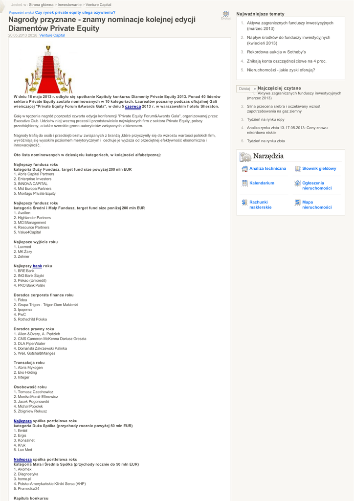 Jesteś w : Strona główna > Inwestowanie > Venture Capital Poprzedni artykuł Czy rynek private equity ulega ożywieniu? Nagrody przyznane - znamy nominacje kolejnej edycji Diamentów Private Equity Najważniejsze tematy Drukuj 20.05.2013 20:28 Venture Capital 1. Aktywa zagranicznych funduszy inwestycyjnych (marzec 2013) 2. Napływ środków do funduszy inwestycyjnych (kwiecień 2013) 3. Rekordowa aukcja w Sotheby’s 4. Znikają konta oszczędnościowe na 4 proc. 5. Nieruchomości - jakie zyski oferują? Dzisiaj W dniu 16 maja 2013 r. odbyło się spotkanie Kapituły konkursu Diamenty Private Equity 2013. Ponad 40 liderów sektora Private Equity zostało nominowanych w 10 kategoriach. Laureatów poznamy podczas oficjalnej Gali w i eńczącej "Private Equity Forum &Awards Gala", w dniu 5 czerwca 2013 r. w warszawskim hotelu Sheraton. Galę w ręczenia nagród poprzedzi czwarta edycja konferencji "Private Equity Forum&Awards Gala", organizowanej przez Executive Club. Udział w niej wezmą prezesi i przedstawiciele największych firm z sektora Private Equity, polscy przedsiębiorcy, a także szerokie grono autorytetów związanych z biznesem. Nagrody trafią do osób i przedsiębiorstw związanych z branżą ,które przyczyniły się do wzrostu wartości polskich firm, wyróżniają się wysokim poziomem merytorycznym i cechuje je wyższa od przeciętnej efektywność ekonomiczna i innowacyjność. Oto lista nominowanych w dziesięciu kategoriach, w kolejności alfabetycznej: Najlepszy fundusz roku kategoria Duży Fundusz, target fund size powyżej 200 mln EUR 1. Abris Capital Partners 2. Enterprise Investors 3. INNOVA CAPITAL 4. Mid Europa Partners 5. Montagu Private Equity Najlepszy fundusz roku kategoria Średni i Mały Fundusz, target fund size poniżej 200 mln EUR 1. Avallon 2. Highlander Partners 3. MCI Management 4. Resource Partners 5. Value4Capital Najlepsze wyjście roku 1. Luxmed 2. MK Żary 3. Zelmer Najlepszy bank roku 1. BRE Bank 2. ING Bank Śląski 3. Pekao (Unicredit) 4. PKO Bank Polski Doradca corporate finance roku 1. Fidea 2. Grupa Trigon - Trigon Dom Maklerski 3. Ipopema 4. PwC 5. Rothschild Polska Doradca prawny roku 1. Allen &Overy, A. Pędzich 2. CMS Cameron McKenna Dariusz Greszta 3. DLA PiperWiater 4. Domański Zakrzewski Palinka 5. Weil, Gotshal&Manges Transakcja roku 1. Abris Mykogen 2. Eko Holding 3. Integer Osobowość roku 1. Tomasz Czechowicz 2. Monika Morali-Efinowicz 3. Jacek Pogonowski 4. Michał Popiołek 5. Zbigniew Rekusz Najlepsza spółka portfelowa roku kategoria Duża Spółka (przychody rocznie powyżej 50 mln EUR) 1. Emitel 2. Ergis 3. Konsalnet 4. Kruk 5. Lux Med Najlepsza spółka portfelowa roku kategoria Mała i Średnia Spółka (przychody rocznie do 50 mln EUR) 1. Akomex 2. Diagnostyka 3. home.pl 4. Polsko-Amerykańskie Kliniki Serca (AHP) 5. Promedica24 Kapituła konkursu Najczęściej czytane 1. Aktywa zagranicznych funduszy inwestycyjnych (marzec 2013) 2. Silna przecena srebra i oczekiwany wzrost zapotrzebowania na gaz ziemny 3. Tydzień na rynku ropy 4. Analiza rynku złota 13-17.05.2013: Ceny znowu rekordowo niskie 5. Tydzień na rynku złota Narzędzia Analiza techniczna Słownik giełdowy Kalendarium Ogłoszenia nieruchomości Rachunki maklerskie Mapa nieruchomości Honorowy Przewodniczący Kapituły:Aleksander Kwaśniewski - Prezydent RP w latach 1995-2005 TillBurges - WiceprezesHarbourVest Partners Igor Chalupec - Partner Zarządzający, Prezes Zarządu ICENTIS Corporate Solutions oraz ICENTIS Capital Nick Fletcher - Partner Clifford Chance Przemysław Gdański - Wiceprezes Zarządu ds. Bankowości Korporacyjnej BRE Bank Jacek Korpała - Partner Zarządzający ARX Equity Partners Witold Orłowski - Członek Rady Gospodarczej przy Prezesie Rady Ministrów, Dyrektor Szkoły Biznesu Politechniki Warszawskiej Ludwik Sobolewski - Prezes Giełdy Papierów Wartościowych w latach 2006-2013 Lucyna Stańczak - Dyrektor Europejskiego Banku Odbudowy i Rozwoju na Polskę Michał Szwarc - Dyrektor Zarządzający JP Morgan (nie brał udziału w głosowaniu) http://www.executive-club.com.pl/index.php/pl/5-czerwca-2013-program 0 Dodaj artykuł do: Giełda Waluty Inwestowanie Finanse osobiste Notowania / Wiadomości giełdowe / Indeksy giełdowe / NewConnect / w ięcej Komentarze walutowe / Kursy walut / Kursy walut w kantorach / Notowania FOREX / Fundusze inwestycyjne / Lokaty / Nieruchomości / Produkty strukturyzowane / w ięcej E-biznes / Firma / Gospodarka / Kariera / Oferty pracy / Prawo / Przetargi / w ięcej Manager Czas zegarków / Cztery koła, dwa koła / Design XXI wieki / Golf / Pełen relaks / w ięcej Nasze portale Najnowsze wiadomości na Twoją skrzynkę! Zapisz się już teraz! Banki / Emerytury / Kariera / Kredyty / Podatki / Private Banking / w ięcej Biznes Pasaż finansowy Newsletter Wpisz swój e-mail Zapisz Kredyty / Pożyczki / Konta / Karty kredytowe / OFE / Lokaty / w ięcej www.waluty.com / www.investing.pl / www.kantory.pl / www.fundusze24.pl / www.sfera-finansow.pl Fora Zobacz również: Forum prawne / Forum giełdowe / Forum biznes / Forum fundusze inwestycje / w ięcej Oprogramowanie dla firm / Należności - usługi dla firm / Pożyczka-bez-bik-online / budowa domu / ogrody / aranżacje wnętrz / dachy / blachodachówka / kwiaty doniczkowe / Kantor internetowy Dom inwestycyjny (c) Inwestycje.pl 2011, ISSN 1897-9491 - wszelkie prawa zastrzeżone, kopiowanie bez zezwolenia zabronione. Wydawcą i właścicielem serwisu jest firma Inwestycje.pl S.A. Inwestycje.pl S.A. jest notowana na rynku akcji NewConnect: Strona korporacyjna / O spółce / Centrum prasowe / Reklama / Kontakt / Mapa serwisu Powered by wdsp.pl