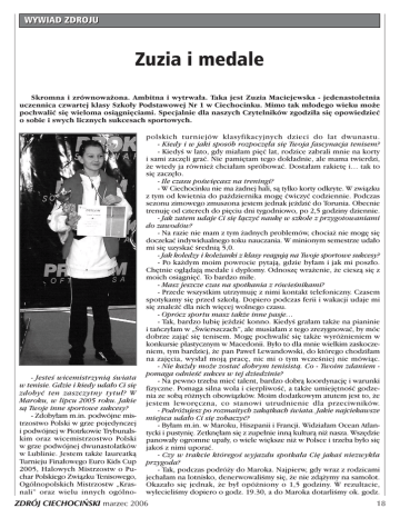 WYWIAD ZDROJU Zuzia i medale Skromna i zrównowa˝ona. Ambitna i wytrwa∏a. Taka jest Zuzia Maciejewska - jedenastoletnia uczennica czwartej klasy Szko∏y Podstawowej Nr 1 w Ciechocinku. Mimo tak m∏odego wieku mo˝e pochwaliç si´ wieloma osiàgni´ciami. Specjalnie dla naszych Czytelników zgodzi∏a si´ opowiedzieç o sobie i swych licznych sukcesach sportowych. - JesteÊ wicemistrzynià Êwiata w tenisie. Gdzie i kiedy uda∏o Ci si´ zdobyç ten zaszczytny tytu∏? W Maroku, w lipcu 2005 roku. Jakie sà Twoje inne sportowe sukcesy? - Zdoby∏am m.in. podwójne mistrzostwo Polski w grze pojedynczej i podwójnej w Piotrkowie Trybunalskim oraz wicemistrzostwo Polski w grze podwójnej dwunastolatków w Lublinie. Jestem tak˝e laureatkà Turnieju Fina∏owego Euro Kids Cup 2005, Halowych Mistrzostw o Puchar Polskiego Zwiàzku Tenisowego, Ogólnopolskich Mistrzostw „Krasnali” oraz wielu innych ogólno- polskich turniejów klasyfikacyjnych dzieci do lat dwunastu. - Kiedy i w jaki sposób rozpocz´∏a si´ Twoja fascynacja tenisem? - KiedyÊ w lato, gdy mia∏am pi´ç lat, rodzice zabrali mnie na korty i sami zacz´li graç. Nie pami´tam tego dok∏adnie, ale mama twierdzi, ˝e wtedy ja równie˝ chcia∏am spróbowaç. Dosta∏am rakiet´ i… tak to si´ zacz´∏o. - Ile czasu poÊwi´casz na treningi? - W Ciechocinku nie ma ˝adnej hali, sà tylko korty odkryte. W zwiàzku z tym od kwietnia do paêdziernika mog´ çwiczyç codziennie. Podczas sezonu zimowego zmuszona jestem jednak jeêdziç do Torunia. Obecnie trenuj´ od czterech do pi´ciu dni tygodniowo, po 2,5 godziny dziennie. - Jak zatem udaje Ci si´ ∏àczyç nauk´ w szkole z przygotowaniami do zawodów? - Na razie nie mam z tym ˝adnych problemów, chocia˝ nie mog´ si´ doczekaç indywidualnego toku nauczania. W minionym semestrze uda∏o mi si´ uzyskaç Êrednià 5,0. - Jak koledzy i kole˝anki z klasy reagujà na Twoje sportowe sukcesy? - Po ka˝dym moim powrocie pytajà, gdzie by∏am i jak mi posz∏o. Ch´tnie oglàdajà medale i dyplomy. Odnosz´ wra˝enie, ˝e cieszà si´ z moich osiàgni´ç. To bardzo mi∏e. - Masz jeszcze czas na spotkania z rówieÊnikami? - Przede wszystkim utrzymuj´ z nimi kontakt telefoniczny. Czasem spotykamy si´ przed szko∏à. Dopiero podczas ferii i wakacji udaje mi si´ znaleêç dla nich wi´cej wolnego czasu. - Oprócz sportu masz tak˝e inne pasje… - Tak, bardzo lubi´ jeêdziç konno. KiedyÊ gra∏am tak˝e na pianinie i taƒczy∏am w „Âwierszczach”, ale musia∏am z tego zrezygnowaç, by móc dobrze zajàç si´ tenisem. Mog´ pochwaliç si´ tak˝e wyró˝nieniem w konkursie plastycznym w Macedonii. By∏o to dla mnie wielkim zaskoczeniem, tym bardziej, ˝e pan Pawe∏ Lewandowski, do którego chodzi∏am na zaj´cia, wys∏a∏ mojà prac´, nic mi o tym wczeÊniej nie mówiàc. - Nie ka˝dy mo˝e zostaç dobrym tenisistà. Co - Twoim zdaniem pomaga odnieÊç sukces w tej dziedzinie? - Na pewno trzeba mieç talent, bardzo dobrà koordynacj´ i warunki fizyczne. Pomaga silna wola i cierpliwoÊç, a tak˝e umiej´tnoÊç godzenia ze sobà ró˝nych obowiàzków. Moim dodatkowym atutem jest to, ˝e jestem lewor´czna, co stanowi utrudnienie dla przeciwników. - Podró˝ujesz po rozmaitych zakàtkach Êwiata. Jakie najciekawsze miejsca uda∏o Ci si´ zobaczyç? - By∏am m.in. w Maroku, Hiszpanii i Francji. Widzia∏am Ocean Atlantycki i pustyni´. Zetkn´∏am si´ z zupe∏nie innà kulturà ni˝ nasza. Wsz´dzie panowa∏y ogromne upa∏y, o wiele wi´ksze ni˝ w Polsce i trzeba by∏o si´ jakoÊ z nimi uporaç. - Czy w trakcie któregoÊ wyjazdu spotka∏a Ci´ jakaÊ niezwyk∏a przygoda? - Tak, podczas podró˝y do Maroka. Najpierw, gdy wraz z rodzicami jecha∏am na lotnisko, denerwowaliÊmy si´, ˝e nie zdà˝ymy na samolot. Okaza∏o si´ jednak, ˝e by∏ opóêniony o 1,5 godziny. W rezultacie, wylecieliÊmy dopiero o godz. 19.30, a do Maroka dotarliÊmy ok. godz. ZDRÓJ CIECHOCI¡SKI marzec 2006 18 3.00 tamtejszego czasu. Na dodatek nie wylàdowaliÊmy tam, gdzie odbywa∏ si´ turniej, wi´c musieliÊmy jeszcze dalej jechaç autobusem. Pami´tam, ˝e ka˝dy by∏ bardzo zm´czony i chcia∏ sam siedzieç, by roz∏o˝yç si´ na dwóch fotelach i spróbowaç zasnàç. Mnie si´ jakoÊ uda∏o. Podczas powrotu do Polski, znowu trzeba by∏o spaç w samolocie, chocia˝ nie by∏o zbyt wygodnie. Gdy nad ranem wylàdowaliÊmy, byliÊmy nie tylko zm´czeni, ale i bardzo g∏odni. - Czy trudno by∏o Ci si´ porozumieç z „egzotycznymi” osobami? - Nie znam dobrze ˝adnego obcego j´zyka, ale zawsze mog´ liczyç na opiekunów lub starszych kolegów i kole˝anki, którzy pe∏nià rol´ t∏umaczy. JakoÊ to wychodzi… - Jakie sà Twoje najbli˝sze plany? - DziÊ jad´ na turniej do Gdaƒska, na poczàtku marca na fina∏ Dru˝ynowych Mistrzostw Polski, a potem na Halowy Super Master do Pabianic, rozgrywany przez szeÊç najlepszych zawodniczek do lat dwudwunastu. - Czego Ci mo˝na ˝yczyç? - Po pierwsze, ˝ebym wygra∏a w Super Mastersie stypendium, chocia˝ t´ najni˝szà kwot´, gdy˝ 500 z∏ na miesiàc przez pó∏ roku znacznie odcià˝y∏oby mam´, która jest mojà g∏ównà sponsorkà. Po drugie, ˝ebym umia∏a pogodziç sport z naukà. ˚ebym mia∏a same piàtki i szóstki. Bardzo chcia∏abym otrzymaç piàtk´ na koniec roku z j´zyka polskiego, gdy˝ w minionym pó∏roczu akurat z tego przedmiotu mia∏am jedynà czwórk´. - Oby to si´ spe∏ni∏o! Dzi´kuj´ za rozmow´. Rozmawia∏a Justyna Stawiszyƒska MCK Mi´dzynarodowy Konkurs Malarski PRACA A TURYSTYKA Ju˝ po raz czwarty Miejskie Centrum Kultury organizuje IV Mi´dzynarodowy (XIV Ogólnopolski)Konkurs Malarski dla dzieci i m∏odzie˝y do lat szesnastu pt.: "CZ¸OWIEK I JEGO PRACA" pod has∏em: „Sztuka j´zykiem m∏odych Europejczyków” Szczegó∏owym tematem konkursu jest: „PRACA A TURYSTYKA” (próba malarskiego przedstawienia pracy cz∏owieka w asp