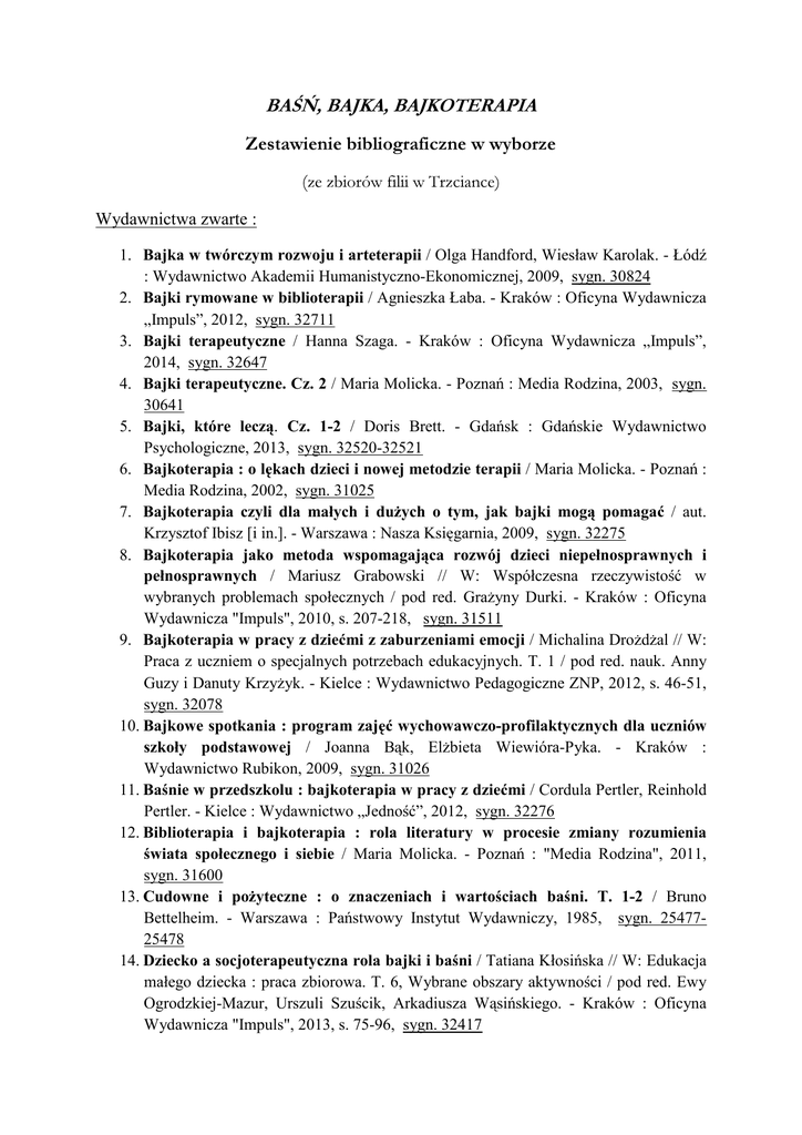 BAŚŃ, BAJKA, BAJKOTERAPIA Zestawienie bibliograficzne w wyborze (ze zbiorów filii w Trzciance) Wydawnictwa zwarte : 1. Bajka w twórczym rozwoju i arteterapii / Olga Handford, Wiesław Karolak. - Łódź : Wydawnictwo Akademii Humanistyczno-Ekonomicznej, 2009, sygn. 30824 2. Bajki rymowane w biblioterapii / Agnieszka Łaba. - Kraków : Oficyna Wydawnicza „Impuls”, 2012, sygn. 32711 3. Bajki terapeutyczne / Hanna Szaga. - Kraków : Oficyna Wydawnicza „Impuls”, 2014, sygn. 32647 4. Bajki terapeutyczne. Cz. 2 / Maria Molicka. - Poznań : Media Rodzina, 2003, sygn. 30641 5. Bajki, które leczą. Cz. 1-2 / Doris Brett. - Gdańsk : Gdańskie Wydawnictwo Psychologiczne, 2013, sygn. 32520-32521 6. Bajkoterapia : o lękach dzieci i nowej metodzie terapii / Maria Molicka. - Poznań : Media Rodzina, 2002, sygn. 31025 7. Bajkoterapia czyli dla małych i dużych o tym, jak bajki mogą pomagać / aut. Krzysztof Ibisz [i in.]. - Warszawa : Nasza Księgarnia, 2009, sygn. 32275 8. Bajkoterapia jako metoda wspomagająca rozwój dzieci niepełnosprawnych i pełnosprawnych / Mariusz Grabowski // W: Współczesna rzeczywistość w wybranych problemach społecznych / pod red. Grażyny Durki. - Kraków : Oficyna Wydawnicza "Impuls", 2010, s. 207-218, sygn. 31511 9. Bajkoterapia w pracy z dziećmi z zaburzeniami emocji / Michalina Drożdżal // W: Praca z uczniem o specjalnych potrzebach edukacyjnych. T. 1 / pod red. nauk. Anny Guzy i Danuty Krzyżyk. - Kielce : Wydawnictwo Pedagogiczne ZNP, 2012, s. 46-51, sygn. 32078 10. Bajkowe spotkania : program zajęć wychowawczo-profilaktycznych dla uczniów szkoły podstawowej / Joanna Bąk, Elżbieta Wiewióra-Pyka. - Kraków : Wydawnictwo Rubikon, 2009, sygn. 31026 11. Baśnie w przedszkolu : bajkoterapia w pracy z dziećmi / Cordula Pertler, Reinhold Pertler. - Kielce : Wydawnictwo „Jedność”, 2012, sygn. 32276 12. Biblioterapia i bajkoterapia : rola literatury w procesie zmiany rozumienia świata społecznego i siebie / Maria Molicka. - Poznań : "Media Rodzina", 2011, sygn. 31600 13. Cudowne i pożyteczne : o znaczeniach i wartościach baśni. T. 1-2 / Bruno Bettelheim. - Warszawa : Państwowy Instytut Wydawniczy, 1985, sygn. 2547725478 14. Dziecko a socjoterapeutyczna rola bajki i baśni / Tatiana Kłosińska // W: Edukacja małego dziecka : praca zbiorowa. T. 6, Wybrane obszary aktywności / pod red. Ewy Ogrodzkiej-Mazur, Urszuli Szuścik, Arkadiusza Wąsińskiego. - Kraków : Oficyna Wydawnicza "Impuls", 2013, s. 75-96, sygn. 32417 15. Jesteśmy wyjątkowi : bajki, które pomagają dzieciom zrozumieć chorych rówieśników / Paola Viezzer. - Kraków : Wydawnictwo ESPe, 2010, sygn. 32531 16. Metoda Bajkoterapii // W: Poznanie przez działanie : gry i zabawy wspomagające rozwój dziecka / Ewa Minor, Marcin Minor. - Warszawa : Difin, 2009, s. 28, sygn. 31910 17. Morfologia bajki / Vladimir Akovlevic Propp. - Warszawa : "Książka i Wiedza", 1976, sygn. 15312 18. Opowieści z planety Holo : opowiadania terapeutyczne / Jovanka Tomaszewska i Wojciech Kołyszko. - Warszawa : Fundacja Drabina Rozwoju, 2011, sygn. 31573 19. Rymowanki wrażliwe na tematy kłopotliwe : wiersze terapeutyczne dla dzieci / Magdalena Kotowska. - Warszawa : Oficyna Wydawnicza "Impuls", 2011, sygn. 31568 20. Zaczarowane bajki, które leczą : dla dzieci i dorosłych / Anna Kozłowska. Warszawa : Wydawnictwo Akademickie "Żak", 2007, sygn. 32335 Artykuły z czasopism : 1. Atmosfera cudowności....: o baśni w wychowaniu i terapii / Monika Wujek // Życie Szkoły. – 2003, nr 1, s. 42-43 2. Bajka jako metoda redukcji lęku u dzieci / Maria Molicka // Probl. Opiekuńczo Wychowawcze. - 2001, nr 1, s. 40 – 44 3. Bajka stymuluje rozwój moralny dziecka / Ewa Capińska // Edukacja i Dialog. 2003, nr 7, s. 65-71 4. Bajka terapeutyczna jako środek oddziaływań psychokorekcyjnych / Beata Hoffmann // Problemy Opiekuńczo-Wychowawcze. - 2012, nr 10, s. 24-28 5. Bajka, bajkoterapia, wychowanie... / Marta Pytka // Opieka Wychowanie Terapia. 2002, nr 4, s. 38 – 42 6. Bajki dzieciom / Aleksandra Roźniak // Życie Szkoły. – 2007, nr 8, s. 30-37 7. Bajki nie-bajki i bajkoterapia / Wita Szulc // Życie Szkoły. - 2006, nr 6, s. 5-11 8. Bajki pomagają dzieciom i rodzicom / Katarzyna Wioska // Wychowanie w Przedszkolu. – 2004, nr 2, s. 59-60 9. Bajki pomagają dzieciom oswoić lęk / Jadwiga Lubowiecka // Wychowanie w Przedszkolu 2011, nr 5, s. 12-17 10. Bajki szczególne, bajki terapeutyczne // Ewa Kramarczyk // Życie Szkoły 2007, nr 10, s. 11-13 11. Bajki terapeutyczne w pracy z dziećmi / Genowefa Surniak // Poradnik Bibliotekarza. – 2008, nr 1, dod. „Świat książki dziecięcej”, s. 1-2 12. Bajkoterapia / Marta Niedźwiecka // Wychowanie w Przedszkolu 2008, nr 11, s. 60 13. Bajkoterapia w szkole podstawowej / Renata Gromek // Biblioteka w Szkole. - 2009, nr 12, s. 5-6 14. Baśnie uczą życiowych ról // Mirosław Huszcz, Małgorzata Cichoń-Piasecka // Wychowanie w Przedszkolu 2003, nr 10, s. 4-9 15. Baśnie w profilaktyce zagrożeń / Maria Lipka // Wychowanie w Przedszkolu. - 2008, nr 5, s. 38-40 16. Baśnioterapia w rehabilitacji dzieci upośledzonych umysłowo / Małgorzata Cichoń-Piasecka // Szkoła Specjalna. - 2005, nr 1, s. 53-58 17. Baśniowe przygody uczą życia / Katarzyna Och // Edukacja i Dialog. - 2006, nr 3, s. 62-65 18. „Baśniowe spotkania" w pracy rewalidacyjnej z dziećmi o obniżonych możliwościach intelektualnych / Ewa Lejowska, Jan Fedczak // Wszystko dla Szkoły. - 2008, nr 2, s. 9-12 19. Baśń i dziecko / Aleksandra Smoleńska // Poradnik Bibliotekarza. – 2006, nr 3, s. 1921 20. Kiedy boję się szkoły? : metody oddziaływań biblioterapeutycznych minimalizujących lęk i agresję wśród dzieci i młodzieży / Wanda Matras-Mastalerz // Poradnik Bibliotekarza. - 2009, nr 6, s. 36-39 21. Kochamy mimo odmienności : scenariusz baśnioterapii / Katarzyna John // Biblioteka w Szkole. - 2008, nr 12, s. 16 22. Magiczna siła baśni – wywiad