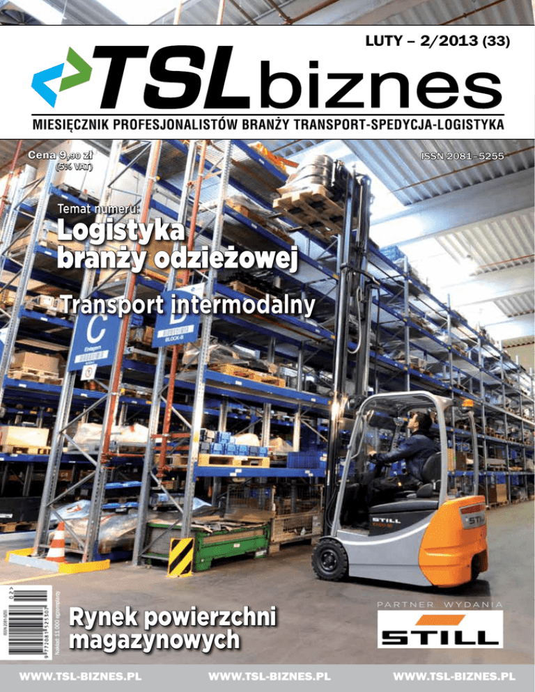 luty – 2/2013 (33) biznes Miesięcznik profesjonalistów branży transport-spedycja-logistyka Cena 9,90 zł ISSN 2081–5255 (5% VAT) Temat numeru: Logistyka branży odzieżowej Nakład: 11 000 egzemplarzy Transport intermodalny Rynek powierzchni magazynowych WWW.TSL-BIZNES.PL WWW.TSL-BIZNES.PL Pa r t n e r wy da n i a WWW.TSL-BIZNES.PL PL-20130128 Transport z przyszłością! Wszystkie drogi prowadzą do TimoCom. Załadowcy, spedytorzy i przewoźnicy – każdy znajdzie coś dla siebie: ▪ codziennie nawet 300.000 ładunków i wolnych pojazdów ▪ oferty z pierwszej ręki od firm z 44 krajów ▪ stałe zlecenia transportowe od europejskich załadowców ▪ 30.000 sprawdzonych usługodawców z całej Europy ▪ bezpłatny okres testowania Więcej informacji dostępnych pod numerem telefonu 008000 8466266 (bezpłatna infolinia). Dołącz do nas na Facebook'u! www.timocom.pl Luty 2013 TSL biznes 2/2013 W numerze temat numeru > Powierzchnie magazynowe > Logistyka Nie tylko w „sieciówce”...............................6 W magazynach – stabilizacja................. 48 Usługi dedykowane branży fashion....... 10 Dominują operatorzy logistyczni............ 50 Oszczędniej i wydajniej............................ 12 Optimus Sorter Technology BV wygrywa przetarg..................................... 14 Specyfika obsługi branży odzieżowej..... 16 Perfekcyjne dopasowanie....................... 18 Otwarci na największych......................... 20 Dalszy wzrost dla Poczty Polskiej........... 22 Z żelazna konsekwencją......................... 23 > Transport intermodalny Łącząc mobilność z niskim kosztem..... 26 Ze statków na tory................................... 27 Lepiej będzie za kilka lat......................... 30 Sposób na zdobycie przewagi rynkowej.................................... 32 Dynamika będzie rosła ........................... 33 Niespełnione oczekiwania...................... 34 Jeszcze długa droga................................. 36 > Transport kolejowy Gra o polskie tory..................................... 38 Polska bliżej europejskiej kolei bez granic.................................................. 42 Wkrótce testy systemu ETCS 2............... 45 Kopalnie, wożone koleją......................... 46 Czytaj również: LUTY 2 /2 0 1 3 (2 3) ISSN 208 Cena: 5,2-9795 50 (w tym 5% VAT ) > Logistyka – technologia Wspólne oszczędności w łańcuchu dostaw.................................. 52 Sprawniej między regałami..................... 53 > Transport drogowy Trzeci rok kampanii „Rzetelny przewoźnik”............................. 54 Program – czas na zmiany...................... 57 > Finansowanie Kryzys rzucił cień na rynek leasingu...... 58 Jak wydać mniej pieniędzy?.................... 62 > Prawo Parking strzeżony, czyli jak to z kradzieżą było..................... 64 Odpowiedzialność przewoźnika mimo braku winy...................................... 68 > Kadry i zarządzanie Rola komunikacji wewnętrznej w zarządzaniu projektami logistycznymi............ 72 Miesięcznik TSL Biznes ul. Skrzetuskiego 16 B 02-726 Warszawa tel. 22 213 88 28 fax 22 205 07 57 [email protected] www.tsl-biznes.pl ISSN: 2081-5255 Redaktor naczelny i wydawca Mirosław Ganiec tel. 502 532 575 [email protected] MAN TG Nakład: 11 000 egz . Praktyc TRUCK 02-2013. indd 1 Gazow e hybryd czy owe? X Effic zny spra ient Line wdzian oszcz Alternaty wne napędy Redakcja Elżbieta Haber tel. 501 36 77 56 [email protected] ędnośc i Cyste do trans rny portu gazu każdy Liczy się kilogra m 2013-02-0 5 16:4 5:14 www.truck-van.pl 4 www.TSL biznes.pl Redakcja nie odpowiada za treść reklam i ogłoszeń. Redakcja zastrzega sobie prawo do redagowania i skracania tekstów. Transport intermodalny Zeszły rok obfitował w wyjątkowo wiele wydarzeń w przewozach intermodalnych. Widać to było zwłaszcza w polskich portach. Niestety nie oznacza to, że z naszym intermodalem jest dobrze – i że wszystko idzie we właściwym kierunku. temat numeru Logistyka branży odzieżowej Polacy chętnie robią zakupy w centrach handlowych i coraz częściej korzystają ze zlokalizowanych w nich sklepów odzieżowych. Polski rynek to ważny klient dla sektora odzieżowego, a polscy odbiorcy coraz częściej zachowują się tak, jak konsumenci w krajach zachodnich. Logistyka też nie może „wyjść z mody” i musi podążać za aktualnymi trendami i oczekiwaniami. Prenumerata – strona 75 Dział reklamy i marketingu [email protected] Krystyna Koch – tel. 515 444 589 [email protected] Jarosław Dynek – tel. 694 725 118 [email protected] Marcin Marczuk – tel. 513 432 305 [email protected] Współpraca Tomasz Dobczyński, Aleksander Domaradzki, Dariusz Drabek, Marcin Jurczak, Arkadiusz Kawa, Michał Kij, Franciszek Nietz, Dorota Raben, Remigiusz Romaniuk, Marek Różycki, Jerzy Różyk, Radosław Sitek, Beata Trochymiak, Karol Wójtowicz, Damian Żabicki. Prenumerata tel. 22 213 88 28 fax 22 205 07 57 [email protected] Nakład: 11 000 egzemplarzy Druk: Drukarnia Edit, tel. 22 872 95 08 Wydawca KMG Media Sp. z o.o., ul. Skrzetuskiego 16 B, 02-726 Warszawa NIP: 522 294 09 47, REGON: 142231181, KRS: 0000348328 Sąd Rejonowy dla m. st. Warszawy, XIII Wydział Gospodarczy KRS ATNnYa) Ł P Z E B DZIAŁ graniczo U iejsc o (liczba m Nie zostawaj w tyle weź udział w bezpłatnych Spotkaniach Transportowych Dowiedz się: > jak przetrwać na trudnym i niestabilnym rynku? > jak unikać problemów w transporcie? > jak zwiększać efektywność i zyski firmy transportowej? Podczas wszystkich edycji Spotkań Transportowych będziesz miał okazję zapoznać się bliżej z najnowszym modelem ciągnika siodłowego DAF XF Euro 6. > Bądź na bieżąco ze zmianami w prawie transportowym, rozliczaniem i rozwojem sieci e-myta, czasem pracy kierowców > zobacz, jakie problemy i pułapki czyhają na przewoźników oraz jak ich unikać > poznaj rozwiązania, które zwiększą wydajność i zyski Twoj