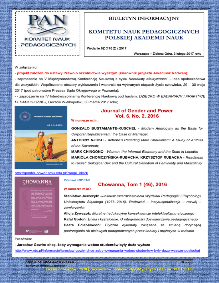 BIULETYN INFORMACYJNY KOMITETU NAUK PEDAGOGICZNYCH POLSKIEJ AKADEMII NAUK Wydanie 6Z (176 Z) / 2017 Warszawa – Zielona Góra, 3 lutego 2017 roku ewnie W załączeniu: - projekt założeń do ustawy Prawo o szkolnictwie wyższym (kierownik projektu Arkadiusz Radwan); - zaproszenie na V Międzynarodową Konferencję Naukową z cyklu Konteksty efektywności… Idea społeczeństwa dla wszystkich. Współczesne obszary wykluczenia i wsparcia na wybranych etapach życia człowieka, 29 – 30 maja 2017 (pod patronatem Prezesa Sądu Okręgowego w Poznaniu); - - zaproszenie na IV Interdyscyplinarną Konferencję Naukową pod hasłem: DZIECKO W BADANIACH I PRAKTYCE PEDAGOGICZNEJ, Gorzów Wielkopolski, 30 marca 2017 roku; Journal of Gender and Power Vol. 6, No. 2, 2016 W numerze m.in.: GONZALO BUSTAMANTE-KUSCHEL - Modern Androgyny as the Basis for Corporal Republicanism: the Case of Marriage; ANTHONY NJOKU - Achebe’s Receding Male Chauvinism: A Study of Anthills of the Savannah; MARK CHINGONO - Women, the Informal Economy and the State in Lesotho MARIOLA CHOMCZYŃSKA-RUBACHA, KRZYSZTOF RUBACHA - Readiness to Resist: Biological Sex and the Cultural Definition of Femininity and Masculinity http://gender-power.amu.edu.pl/?page_id=20 Patronat KNP PAN Chowanna, Tom 1 (46), 2016 W numerze m.in.: Stanisław Juszczyk: Jubileusz czterdziestolecia Wydziału Pedagogiki i Psychologii Uniwersytetu Śląskiego (1976–2016). Rodowód – instytucjonalizacja – rozwój – zamierzenia; Alicja Żywczok: Moralne i edukacyjne konsekwencje intelektualizmu etycznego Rafał Godoń: Etyka i kształcenie. O integralności doświadczenia pedagogicznego Beata Ecler-Nocoń: Etyczne dylematy związane ze zmianą dotyczącą postrzegania ról płciowych podejmowanych przez kobiety i mężczyzn w rodzinie Prasówka: - Jarosław Gowin: chcę, żeby wymagania wobec studentów były dużo wyższe http://www.rdc.pl/informacje/jaroslaw-gowin-chce-zeby-wymagania-wobec-studentow-byly-duzo-wyzsze-posluchaj SEKCJA DS. INFORMACJI KNP PAN [email protected] Strona 1 Liczba odbiorców: 1578 pracowników naukowo-dydaktycznych (stan na 12.01.2016)