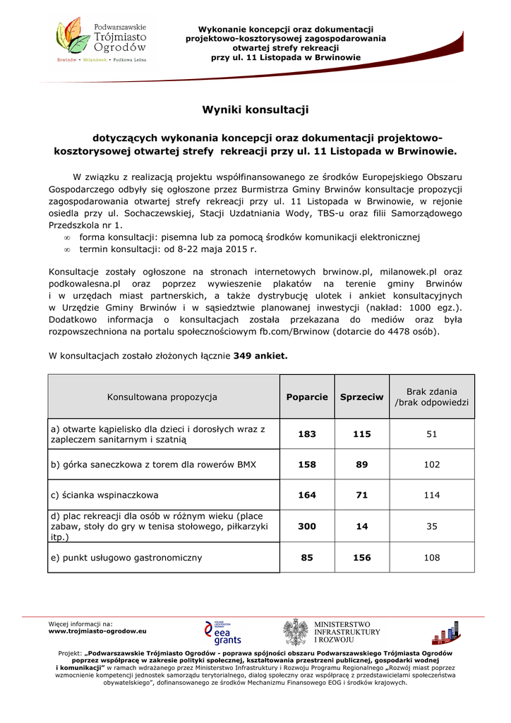 Wykonanie koncepcji oraz dokumentacji projektowo-kosztorysowej zagospodarowania otwartej strefy rekreacji przy ul. 11 Listopada w Brwinowie Wyniki konsultacji dotyczących wykonania koncepcji oraz dokumentacji projektowokosztorysowej otwartej strefy rekreacji przy ul. 11 Listopada w Brwinowie. W związku z realizacją projektu współfinansowanego ze środków Europejskiego Obszaru Gospodarczego odbyły się ogłoszone przez Burmistrza Gminy Brwinów konsultacje propozycji zagospodarowania otwartej strefy rekreacji przy ul. 11 Listopada w Brwinowie, w rejonie osiedla przy ul. Sochaczewskiej, Stacji Uzdatniania Wody, TBS-u oraz filii Samorządowego Przedszkola nr 1. • forma konsultacji: pisemna lub za pomocą środków komunikacji elektronicznej • termin konsultacji: od 8-22 maja 2015 r. Konsultacje zostały ogłoszone na stronach internetowych brwinow.pl, milanowek.pl oraz podkowalesna.pl oraz poprzez wywieszenie plakatów na terenie gminy Brwinów i w urzędach miast partnerskich, a także dystrybucję ulotek i ankiet konsultacyjnych w Urzędzie Gminy Brwinów i w sąsiedztwie planowanej inwestycji (nakład: 1000 egz.). Dodatkowo informacja o konsultacjach została przekazana do mediów oraz była rozpowszechniona na portalu społecznościowym fb.com/Brwinow (dotarcie do 4478 osób). W konsultacjach zostało złożonych łącznie 349 ankiet. Poparcie Sprzeciw Brak zdania /brak odpowiedzi a) otwarte kąpielisko dla dzieci i dorosłych wraz z zapleczem sanitarnym i szatnią 183 115 51 b) górka saneczkowa z torem dla rowerów BMX 158 89 102 c) ścianka wspinaczkowa 164 71 114 d) plac rekreacji dla osób w różnym wieku (place zabaw, stoły do gry w tenisa stołowego, piłkarzyki itp.) 300 14 35 85 156 108 Konsultowana propozycja e) punkt usługowo gastronomiczny Więcej informacji na: www.trojmiasto-ogrodow.eu Projekt: „Podwarszawskie Trójmiasto Ogrodów - poprawa spójności obszaru Podwarszawskiego Trójmiasta Ogrodów poprzez współpracę w zakresie polityki społecznej, kształtowania przestrzeni publicznej, gospodarki wodnej i komunikacji” w ramach wdrażanego przez Ministerstwo Infrastruktury i Rozwoju Programu Regionalnego „Rozwój miast poprzez wzmocnienie kompetencji jednostek samorządu terytorialnego, dialog społeczny oraz współpracę z przedstawicielami społeczeństwa obywatelskiego”, dofinansowanego ze środków Mechanizmu Finansowego EOG i środków krajowych. Z ankiety wynika, że największym poparciem mieszkańców cieszy się propozycja utworzenia strefy rekreacji dla osób w różnym wieku. Takie rozwiązanie poparło ponad 85% osób uczestniczących w ankiecie, a odpowiedź „jestem przeciw” wybrało zaledwie 4%. Jest to oczekiwanie najczęściej rekomendowane, zapewne jako najbardziej uniwersalne. W części ankiet zaznaczono też w części opisowej dodatkowe życzenia i wskazówki, m.in. stawiając jako przykład udanej realizacji podobnej strefy Park Bajka w Błoniu. Za otwartym kąpieliskiem opowiedziało się 52% osób, które wzięły udział w ankiecie, ale jednocześnie ten punkt okazał się dość kontrowersyjny. „Jestem przeciw” odpowiedziała niemal jedna trzecia ankietowanych (32,95%), przy czym znaczna część tych głosów pochodziła z najbliższych okolic terenu: ul. Sochaczewskiej i sąsiednich. Jeśli odjąć głosy sprzeciwu od głosów poparcia, to takie rozwiązanie okazuje się mieć nawet minimalnie mniej zwolenników od kolejnych propozycji, dotyczących górki/toru BMX oraz ścianki wspinaczkowej Te dwie propozycje – dotyczące górki saneczkowej/toru BMX i ścianki wspinaczkowej – spotkały się z bardzo podobnym oddźwiękiem wśród osób wypełniających ankietę: „Popieram ten pomysł” odpowiedziało ok. 45% uczestników konsultacji (przy sprzeciwie odpowiednio jednej czwartej i jednej piątej respondentów). Zdecydowanie najmniejszym poparciem cieszył się pomysł zaprojektowania na terenie strefy rekreacyjnej punktu usługowo-gastronomicznego. Prawie 47% osób sprzeciwiło się tej propozycji. W części ankiet mieszkańcy skorzystali z możliwości podzielenia się swoimi uwagami. Niektórzy dodawali własne pomysły na zagospodarowanie strefy rekreacji, niektórzy podawali swój punkt widzenia na temat propozycji, rozszerzając zaznaczoną opcję („popieram ten pomysł” lub „jestem przeciw”) o uzasadnienie własnego wyboru. Uwagi dodatkowe – zebrane łącznie: Pomysł (w nawiasie liczba ankiet, w których pojawił się dany temat) Siłownia na świeżym powietrzu (25) Teren zadrzewiony, ławeczki, krzewy ozdobne (17) Miejsce na ognisko/grill z zadaszeniem (11) Basen kryty (7) Pozostawienie działek Uzasadnienie, dodatkowe informacje, fragmenty wypowiedzi Orbitrek, biegacz, koła tai-chi, wahadło, rower – wraz z tablicami informacyjnymi oraz regulaminem korzystania z nich; to może być wymarzona strefa relaksu, zdrowia i poprawy kondycji dorosłych i dzieci; siłownia z prawdziwego zdarzenia, nie dwa czy trzy sprzęty, ale może po kilka usytuowanych w różnych miejscach tak dużego terenu; Dużo zieleni przy minimalnej ilości betonu; po parku i terenach zielonych na północ od DW 719 byłby to trzeci teren zielony; proszę nie niszczcie zieleni!; zaglądają tu sarny, lisy, można by w części przynajmniej zachować ten klimat; proszę o pozostawienie dużej ilości terenów zielonych; teren nadaje się na park; jestem zdecydowanie przeciwny wycince młodego drzewostanu; Korzyści z basenu: nauka pływania dla niemowlaków, przedszkolaków, uczniów, dorosłych, aerobic, zawody pływackie; postulat organizacji punktów b) i c) na terenach SGGW od strony ul. Przejazd; kąpielisko można zorganizować w oparciu o glinianki (jak zrobił to Pruszków); Na części terenu; element rekreacji dla osób starszych; Strona 2 z 4 mieszkańców (5) Teren dostępny na spacery z psami (5) Boisko do gry w siatkówkę i koszykówkę, piłkę plażową (5) Fontanna/kurtyna wodna (4) Ścieżki dla 