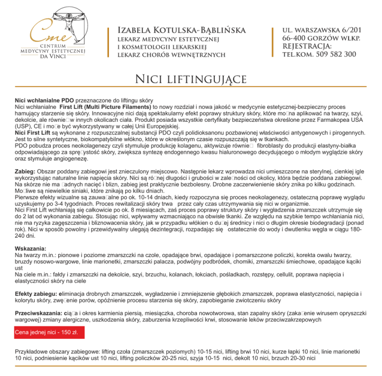 Nici wchłanialne PDO przeznaczone do liftingu skóry Nici wchłanialne First Lift (Multi Picture Filaments) to nowy rozdział i nowa jakość w medycynie estetycznej-bezpieczny proces hamujący starzenie się skóry. Innowacyjne nici dają spektakularny efekt poprawy struktury skóry, które można aplikować na twarzy, szyi, dekolcie, ale również w innych okolicach ciała. Produkt posiada wszystkie certyfikaty bezpieczeństwa określone przez Farmakopea USA (USP), CE i może być wykorzystywany w całej Unii Europejskiej. Nici First Lift są wykonane z rozpuszczalnej substancji PDO czyli polidioksanonu pozbawionej właściwości antygenowych i pirogennych. Jest to silne syntetyczne, biokompatybilne włókno, które w określonym czasie rozpuszczają się w tkankach. PDO pobudza proces neokolagenezy czyli stymuluje produkcję kolagenu, aktywizuje również fibroblasty do produkcji elastyny-białka odpowiadającego za sprężystość skóry, zwiększa syntezę endogennego kwasu hialuronowego decydującego o młodym wyglądzie skóry oraz stymuluje angiogenezę. Zabieg: Obszar poddany zabiegowi jest znieczulony miejscowo. Następnie lekarz wprowadza nici umieszczone na sterylnej, cienkiej igle wykorzystując naturalne linie napięcia skóry. Nici są różnej długości i grubości w zależności od okolicy, która będzie poddana zabiegowi. Na skórze nie ma żadnych nacięć i blizn, zabieg jest praktycznie bezbolesny. Drobne zaczerwienienie skóry znika po kilku godzinach. Możliwe są niewielkie siniaki, które znikają po kilku dniach. Pierwsze efekty wizualne są zauważalne po ok. 10-14 dniach, kiedy rozpoczyna się proces neokolagenezy, ostateczną poprawę wyglądu uzyskujemy po 3-4 tygodniach. Proces rewitalizacji skóry trwa przez cały czas utrzymywania się nici w organizmie. Nici First Lift wchłaniają się całkowicie po ok. 8 miesiącach, zaś proces poprawy struktury skóry i wygładzenia zmarszczek utrzymuje się do 2 lat od wykonania zabiegu. Stosując nici, wpływamy wzmacniająco na obwisłe tkanki. Ze względu na szybkie tempo wchłaniania nici, nie ma ryzyka zagęszczenia i bliznowacenia skóry, jak w przypadku włókien o dużej średnicy i nici o długim okresie biodegradacji (ponad rok). Nici w sposób powolny i przewidywalny ulegają dezintegracji, rozpadając się ostatecznie do wody i dwutlenku węgla w ciągu 180240 dni. Wskazania: Na twarzy m.in.: pionowe i poziome zmarszczki na czole, opadające brwi, opadające i pomarszczone policzki, korekta owalu twarzy, bruzdy nosowo-wargowe, linie marionetki, zmarszczki palacza, podwójny podbródek, chomiki, zmarszczki śmiechowe, opadające kąciki ust Na ciele m.in.: fałdy i zmarszczki na dekolcie, szyi, brzuchu, kolanach, łokciach, pośladkach, rozstępy, cellulit, poprawa napięcia i elastyczności skóry na ciele Efekty zabiegu: eliminacja drobnych zmarszczek, wygładzenie i zmniejszenie głębokich zmarszczek, poprawa elastyczności, napięcia i kolorytu skóry, zwężenie porów, opóźnienie procesu starzenia się skóry, zapobieganie zwiotczeniu skóry Przeciwskazania: ciąża i okres karmienia piersią, miesiączka, choroba nowotworowa, stan zapalny skóry (zakażenie wirusem opryszczki wargowej) zmiany alergiczne, uszkodzenia skóry, zaburzenia krzepliwości krwi, stosowanie leków przeciwzakrzepowych Cena jednej nici - 150 zł. Przykładowe obszary zabiegowe: lifting czoła (zmarszczek poziomych) 10-15 nici, lifting brwi 10 nici, kurze łapki 10 nici, linie marionetki 10 nici, podniesienie kącików ust 10 nici, lifting policzków 20-25 nici, szyja 10-15 nici, dekolt 10 nici, brzuch 20-30 nici