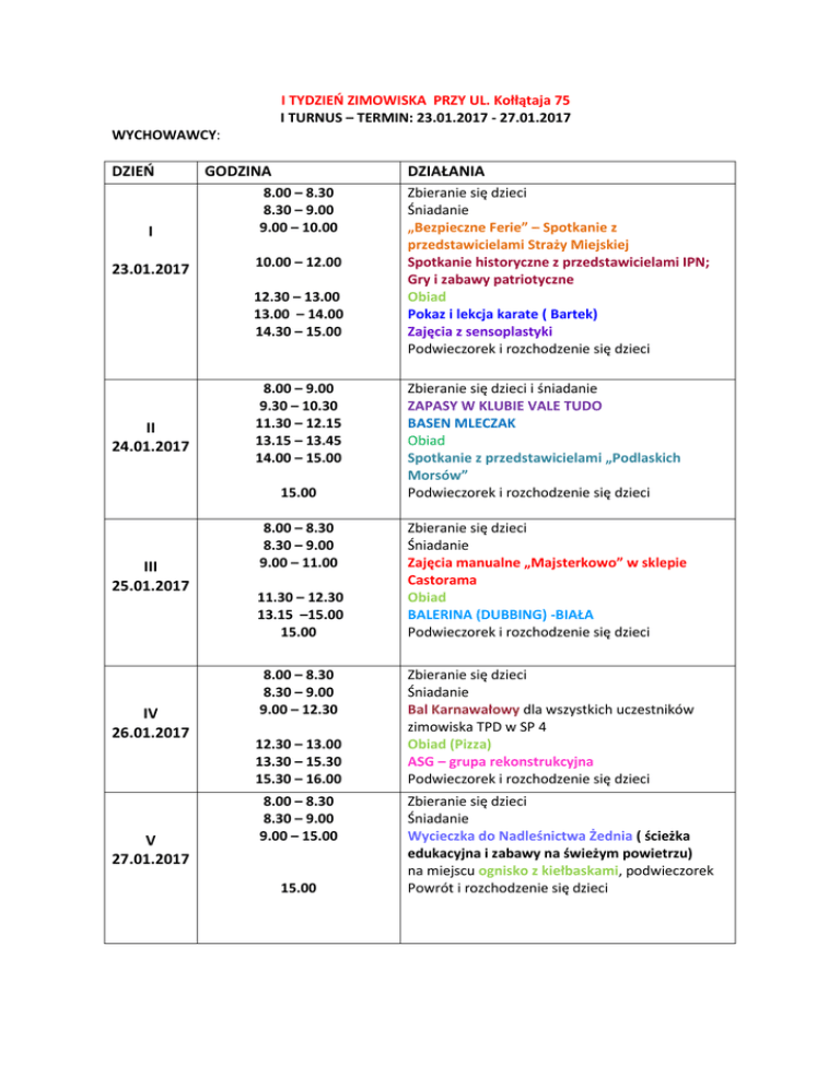 I TYDZIEŃ ZIMOWISKA PRZY UL. Kołłątaja 75 I TURNUS – TERMIN: 23.01.2017 - 27.01.2017 WYCHOWAWCY: DZIEŃ I 23.01.2017 GODZINA DZIAŁANIA 8.00 – 8.30 8.30 – 9.00 9.00 – 10.00 10.00 – 12.00 12.30 – 13.00 13.00 – 14.00 14.30 – 15.00 II 24.01.2017 8.00 – 9.00 9.30 – 10.30 11.30 – 12.15 13.15 – 13.45 14.00 – 15.00 15.00 III 25.01.2017 IV 26.01.2017 V 27.01.2017 8.00 – 8.30 8.30 – 9.00 9.00 – 11.00 11.30 – 12.30 13.15 –15.00 15.00 8.00 – 8.30 8.30 – 9.00 9.00 – 12.30 12.30 – 13.00 13.30 – 15.30 15.30 – 16.00 8.00 – 8.30 8.30 – 9.00 9.00 – 15.00 15.00 Zbieranie się dzieci Śniadanie „Bezpieczne Ferie” – Spotkanie z przedstawicielami Straży Miejskiej Spotkanie historyczne z przedstawicielami IPN; Gry i zabawy patriotyczne Obiad Pokaz i lekcja karate ( Bartek) Zajęcia z sensoplastyki Podwieczorek i rozchodzenie się dzieci Zbieranie się dzieci i śniadanie ZAPASY W KLUBIE VALE TUDO BASEN MLECZAK Obiad Spotkanie z przedstawicielami „Podlaskich Morsów” Podwieczorek i rozchodzenie się dzieci Zbieranie się dzieci Śniadanie Zajęcia manualne „Majsterkowo” w sklepie Castorama Obiad BALERINA (DUBBING) -BIAŁA Podwieczorek i rozchodzenie się dzieci Zbieranie się dzieci Śniadanie Bal Karnawałowy dla wszystkich uczestników zimowiska TPD w SP 4 Obiad (Pizza) ASG – grupa rekonstrukcyjna Podwieczorek i rozchodzenie się dzieci Zbieranie się dzieci Śniadanie Wycieczka do Nadleśnictwa Żednia ( ścieżka edukacyjna i zabawy na świeżym powietrzu) na miejscu ognisko z kiełbaskami, podwieczorek Powrót i rozchodzenie się dzieci