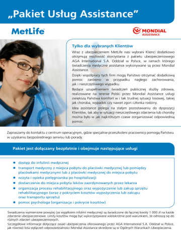 „Pakiet Usług Assistance” Tylko dla wybranych Klientów Wraz z ubezpieczeniem MetLife nasi wybrani Klienci dodatkowo otrzymują możliwość skorzystania z pakietu ubezpieczeniowego AGA International S.A. Oddział w Polsce, w ramach którego świadczenia medyczne assistance wykonywane są przez Mondial Assistance. Dzięki współpracy tych firm mogą Państwo otrzymać dodatkową pomoc zarówno w przypadku nagłego zachorowania, jak i nieszczęśliwego wypadku. Będące uzupełnieniem świadczeń publicznej służby zdrowia, realizowane na terenie Polski przez Mondial Assistance usługi zwiększą Państwa komfort w i tak trudnej sytuacji losowej, takiej jak choroba, wypadek czy nawet zgon członka rodziny. Idea assistance polega na stałym pozostawaniu do dyspozycji Klientów, tak aby w sytuacji nieszczęśliwego zdarzenia lub choroby można było w jak najkrótszym czasie zorganizować odpowiednią pomoc. Zapraszamy do kontaktu z centrum operacyjnym, gdzie specjalnie przeszkoleni pracownicy pomogą Państwu w uzyskaniu bezpośredniego serwisu lub porady. Pakiet jest dołączany bezpłatnie i obejmuje następujące usługi zz dostęp do infolinii medycznej zz transport medyczny z miejsca pobytu do placówki medycznej lub pomiędzy z placówkami medycznymi lub z placówki medycznej do miejsca pobytu zz wizyta i opieka pielęgniarska po hospitalizacji zz dostarczenie do miejsca pobytu leków zaordynowanych przez lekarza zz organizacja procesu rehabilitacyjnego oraz wypożyczenie lub zakup sprzętu z rehabilitacyjnego (wraz z pokryciem kosztów wypożyczenia lub zakupu z oraz transportu sprzętu) zz pomoc psychologa (organizacja i pokrycie kosztów) Świadczenia wymienione powyżej (za wyjątkiem infolinii medycznej) są świadczone do łącznej kwoty 1 000 zł na każde zdarzenie ubezpieczeniowe. Limity kosztów mogą być wykorzystywane wielokrotnie pod warunkiem, że odnoszą się do różnych zdarzeń ubezpieczeniowych. Szczegółowe informacje dotyczące zasad ubezpieczenia oferowanego przez AGA International S.A. Oddział w Polsce, jak również lista wyłączeń odpowiedzialności Mondial Assistance określone są w Ogólnych Warunkach Ubezpieczenia. Zakres „Pakietu Usług Assistance” Dostęp do infolinii medycznej: umożliwia telefoniczną rozmowę z lekarzem uprawnionym z Centrum Pomocy, który w miarę posiadanej wiedzy specjalistycznej oraz istniejących możliwości udzieli Ubezpieczonemu ustnej informacji co do dalszego sposobu postępowania w danej sytuacji. Wiedza ta może dotyczyć: zakresu usług świadczonych przez państwowe lub prywatne placówki służby zdrowia, działania leków, funkcjonowania placówek rehabilitacyjnych i placówek handlowych oferujących sprzęt rehabilitacyjny, sposobu przygotowania do zabiegów i badań medycznych, diet i sposobów zdrowego żywienia. Udzielane informacje nie mają charakteru diagnostycznego i leczniczego Transport medyczny (zgodnie ze wskazaniem lekarza prowadzącego): zz z miejsca pobytu do placówki medycznej – w przypadku zaistnienia zdarzenia ubezpieczeniowego wymagającego pobytu Ubezpieczonego w placówce medycznej jest organizowany transport, o ile nie jest konieczna interwencja pogotowia ratunkowego oraz o ile stan zdrowia pacjenta utrudnia skorzystanie z dostępnego publicznego lub prywatnego środka transportu zz pomiędzy placówkami medycznymi – w przypadku, gdy placówka, w której przebywa Ubezpieczony, nie odpowiada wymogom leczenia odpowiednim dla jego stanu zdrowia oraz w przypadku, gdy Ubezpieczony skierowany jest na badania specjalistyczne lub zabieg chirurgiczny w innej placówce medycznej. Transport jest organizowany, o ile stan zdrowia pacjenta utrudnia skorzystanie z dostępnego publicznego lub prywatnego środka transportu zz z placówki medycznej do miejsca pobytu – w przypadku, gdy w następstwie zdarzenia ubezpieczeniowego Ubezpieczony przebywał w placówce medycznej. Transport jest organizowany, o ile stan zdrowia pacjenta utrudnia skorzystanie z dostępnego publicznego lub prywatnego środka transportu Wizyta i opieka pielęgniarska po hospitalizacji: zorganizowanie i pokrycie kosztów dojazdów do miejsca pobytu Ubezpieczonego i honorariów pielęgniarki oraz – jeżeli Ubezpieczony na skutek zdarzenia ubezpieczeniowego był hospitalizowany i istnieje konieczność przebywania na zwolnieniu lekarskim – Ubezpieczyciel zapewnia zorganizowanie i pokrycie kosztów opieki pielęgniarskiej w miejscu pobytu Ubezpieczonego po zakończeniu hospitalizacji Dostarczenie do miejsca pobytu leków zaordynowanych przez lekarza: w sytuacji, gdy Ubezpieczony w następstwie zdarzenia ubezpieczeniowego, zgodnie z dokumentem zwolnienia lekarskiego wystawionego zgodnie z przepisami prawa, wymaga leżenia, Ubezpieczyciel organizuje i pokrywa koszty dostarczenia leków do miejsca pobytu Ubezpieczonego Organizacja procesu rehabilitacyjnego oraz wypożyczenie lub zakup sprzętu rehabilitacyjnego (wraz z pokryciem kosztów wypożyczenia lub zakupu oraz transportu sprzętu): w przypadku, gdy w następstwie zdarzenia ubezpieczeniowego Ubezpieczony, zgodnie ze wskazaniem lekarza prowadzącego, powinien używać sprzętu rehabilitacyjnego w miejscu pobytu, Ubezpieczyciel dostarcza informację o placówkach handlowych lub wypożyczalniach oferujących sprzęt rehabilitacyjny oraz zapewnia taki sprzęt Pomoc psychologa (organizacja i pokrycie kosztów): jeżeli na skutek trudnej sytuacji losowej (zgonu bliskiej osoby lub poważnego zachorowania Ubezpieczonego) będzie wskazana, zdaniem lekarza uprawnionego, konsultacja z psychologiem, Ubezpieczyciel zapewnia organizację i pokrycie kosztów wizyt u psychologa Prawo do powyższych świadczeń obowiązuje tylko w przypadku trwania umowy pomiędzy MetLife TUnŻiR S.A. a AGA International S.A. Oddział w Polsce, którego przedstawicielem jest centrum operacyjne Mondial Assistance Sp. z o.o. Zapraszamy do pełnego korzystania z przysługujących Państwu świadczeń.