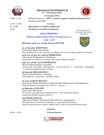 PROGRAM KONFERENCJI 13 - 14 kwietnia 2016 r. 10.00 - 11.30 11.30 - 12.00 do 12.00 12.00 13 kwietnia 2016 r. Wykład otwarty nt. „ABW w systemie organów bezpieczeństwa państwa” Przedstawiciel ABW Dyskusja Rejestracja uczestników konferencji Powitanie uczestników konferencji SESJA PIERWSZA Patronat honorowy: Marszałek Województwa Opolskiego Wybrane aspekty bezpieczeństwa wewnętrznego cz. I 12.00 - 14.00 Moderator: prof. nzw. dr hab. Henryk SPUSTEK ks. dr Jarosław KRZEWICKI Uniwersytet Santa Croce Roma Kościół Katolicki wobec zagrożeń wynikających z kryzysu migracyjnego w Europie prof. nzw. dr hab. inż. Andrzej ŻEBROWSKI Uniwersytet Pedagogiczny w Krakowie Zagrożenia wywiadowcze u progu XXI wieku. Wybrane aspekty prof. nzw. dr hab. Jacek DWORZECKI Wyższa Szkoła Policji w Szczytnie Nowoczesne narzędzia informatyczne wykorzystywane w zarządzaniu informacją i w szkoleniu funkcjonariuszy Policji dr Dominik HRYSZKIEWICZ Wyższa Szkoła Policji w Szczytnie Komunikacja wewnętrzna w polskiej Policji dr Anna SAKSON-BOULET Uniwersytet Adama Mickiewicza Wydział Nauk Politycznych i Dziennikarstwa Polityka klimatyczna państw po COP-21 w Paryżu dr Radosław ANTONÓW Uniwersytet Wrocławski Terroryzm i przestępczość zorganizowana w XXI wieku jako główne zagrożenia bezpieczeństwa państwa mgr Klaudia ŚLĘZAK Uniwersytet Śląski w Katowicach Wydział Prawa i Administracji Rola operatora systemu przesyłowego w zapewnieniu krajowego bezpieczeństwa dostaw energii elektrycznej w obliczu zagrożenia blackoutem Dyskusja 14.00 - 14.30 Przerwa kawowa SESJA PIERWSZA cz. II Wybrane aspekty bezpieczeństwa wewnętrznego 14.30 – 18.30 Moderator: dr Tomasz DUKIEWICZ prof. nzw. dr hab. Libor GASPERIK Uniwersytet Opolski, Wydział Prawa i Administracji, Zakład Nauk o Bezpieczeństwie Żandarmeria Wojskowa w systemie bezpieczeństwa wewnętrznego Republiki Słowackiej Ivan MAJCHÚT Ph.D. Armed Forces Academy of gen. M. R. Štefánik, Liptovský Mikuláš, Słowacja Renewable energy sources as the aspects of energy security doc. mgr Jaroslav UŠIAK Ph.D., mgr Dominika KOSÁROVÁ Faculty of Political Science and International Relations Matej Bel University in Banska Bystrica, Słowacja Maritime piracy as a security threat in the 21st century mgr Kamil GLINKA Uniwersytet Wrocławski Instytut Politologii Pomiędzy oczekiwaniem a rzeczywistością. Bezpieczeństwo ekonomiczne w polityce największych miast Dolnego Śląska mgr Katarzyna GŁOWANIA Uniwersytet Opolski Instytut Nauk Pedagogicznych Poczucie bezpieczeństwa publicznego mieszkańców województwa opolskiego - doniesienie z badań mgr Alicja PALUCH Uniwersytet Opolski Instytut Politologii Komponenty zintegrowanego systemu bezpieczeństwa państwa lic. Natalia CISZEWSKA Uniwersytet Mikołaja Kopernika w Toruniu Izraelska strategia bezpieczeństwa państwa i jej wpływ na sytuację w regionie Przerwa kawowa Daria KRAWCZYK Uniwersytet Opolski Wydział Prawa i Administracji Internet jako zagrożenie dla bezpieczeństwa wewnętrznego Sara KRYSTOŃ Akademia Obrony Narodowej Państwo Islamskie zagrożeniem dla bezpieczeństwa Polski Iryna ROMANCHUK Uniwersytet Opolski Rewolucja godności albo Euromajdan Karolina STRZYBIŃSKA Uniwersytet Opolski Wydział Prawa i Administracji Religia w kontekście bezpieczeństwa Dżenifer LEDWOŃ Uniwersytet Opolski Wydział Prawa i Administracji Patologie społeczne i ich wpływ na bezpieczeństwo wewnętrzne Dyskusja 19.00 Uroczysta kolacja 14 kwietnia 2016 r. SESJA DRUGA Strategie i projekty 10.00 - 12.30 Moderatorzy: prof. nzw. dr hab. Teresa GRABIŃSKA, prof. nzw. dr hab. Henryk Spustek prof. nzw. dr hab. Teresa GRABIŃSKA Wyższa Szkoła Oficerska Wojsk Lądowych Wrocław Nanotechnologiczne zagrożenia stanu zdrowia i środowiska naturalnego prof. dr hab. Василь ГУЛАЙ Politechnika Lwowska, Ukraina Manipulacyjne technologie wpływu informacyjno-komunikatywnego prof. nzw. dr hab. Jaromir MLYNEK Akademia Korpusu Policji w Bratysławie, Słowacja Rola Korpusu Policji Republiki Słowackiej w zwalczaniu przestępczości zorganizowanej dr Joanna FILABER Wyższa Szkoła Prawa im. H. Chodkowksiej we Wrocławiu Racjonalizacja działań planistycznych w ochronie bezpieczeństwa wewnętrznego na poziomie gminy - aspekt prawny dr Bartosz MAZIARZ Uniwersytet Opolski Instytut Politologii Bezpieczeństwo społeczne jako element polityk publicznych państwa Lubomír KLAČKO Ph.D. Faculty of Political Science and International Relations Matej Bel University in Banska Bystrica, Słowacja The Situation Centre of the Slovak Republic as a required Element of the Slovak Security Environment dr Mirosław BORKOWSKI Gdańska Szkoła Wyższa Bezpieczeństwo pacjenta i konsumenta – analiza wybranych praw pacjenta dr Hanna DUSZKA-JAKIMKO, dr Monika HACZKOWSKA Uniwersytet Opolski, Wydział Prawa i Administracji. Politechnika Opolska Wartość bezpieczeństwa prawnego w demokratycznym porządku prawnym mgr Marta HOFFMANN Instytut Nauk Politycznych i Stosunków Międzynarodowych Uniwersytet Jagielloński w Krakowie Studia medykalizacyjne jako nowa rama opisu zjawisk z zakresu bezpieczeństwa narodowego mgr Jarosław KRYSIŃSKI Instytutu Politologii i Europeistyki Uniwersytetu Szczecińskiego Bezpieczeństwo państwa a obrona terytorialna Gracjan MIERNICKI Uniwersytet Opolski Wydział Prawa i Administracji Podatek od emisji CO2? Jesteśmy zgubieni! Kacper DĄBROWSKI Uniwersytet Opolski Wydział Prawa i Administracji Determinanty zachowań ludzkich w rozumieniu bezpieczeństwa Marcin ADAMCZYK Uniwersytet Opolski Wydział Prawa i Administracji System dozoru elektronicznego w świetle zmian i nowelizacji Sylwia RATAJ Uniwersytet Opolski Wydział Prawa i Administracji Świadomość informacyjna warunkiem bezpieczeństwa społeczeństwa informacyjnego Dyskusja 12.15 - 12.30 Przerwa kawowa SESJA TRZECIA Społeczeństwo obywatelskie 12.30 – 14.00 Moderator: dr Kamila KASPERSKA-KURZAWA Zbyšek KORECKI Ph.D. Mendel U