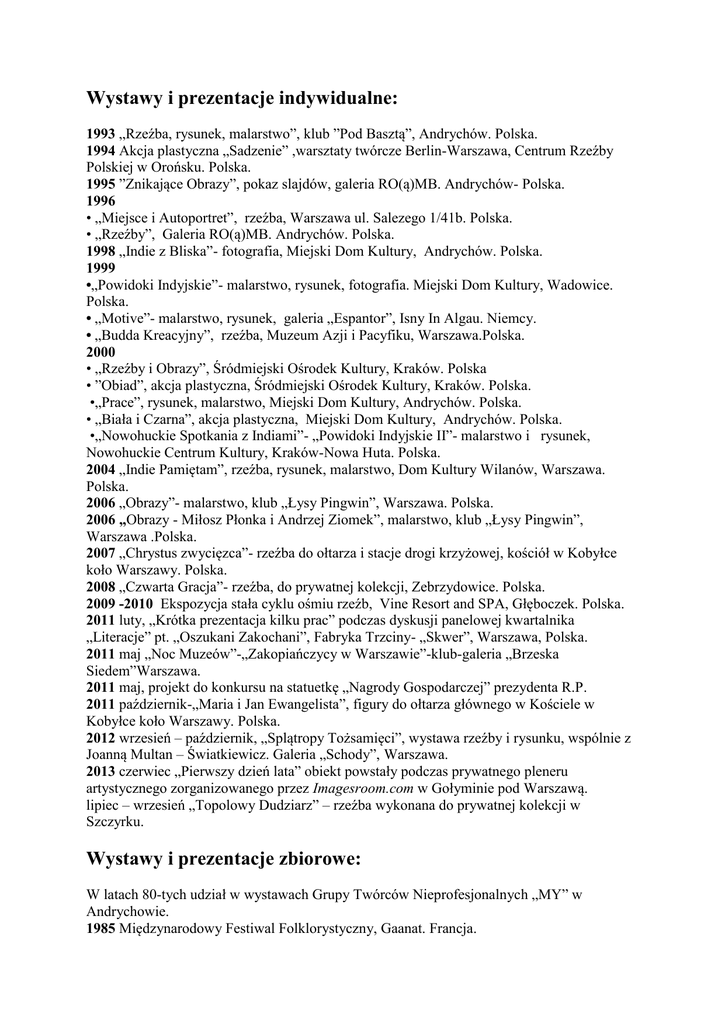 Wystawy i prezentacje indywidualne: 1993 „Rzeźba, rysunek, malarstwo”, klub ”Pod Basztą”, Andrychów. Polska. 1994 Akcja plastyczna „Sadzenie” ,warsztaty twórcze Berlin-Warszawa, Centrum Rzeźby Polskiej w Orońsku. Polska. 1995 ”Znikające Obrazy”, pokaz slajdów, galeria RO(ą)MB. Andrychów- Polska. 1996 • „Miejsce i Autoportret”, rzeźba, Warszawa ul. Salezego 1/41b. Polska. • „Rzeźby”, Galeria RO(ą)MB. Andrychów. Polska. 1998 „Indie z Bliska”- fotografia, Miejski Dom Kultury, Andrychów. Polska. 1999 •„Powidoki Indyjskie”- malarstwo, rysunek, fotografia. Miejski Dom Kultury, Wadowice. Polska. • „Motive”- malarstwo, rysunek, galeria „Espantor”, Isny In Algau. Niemcy. • „Budda Kreacyjny”, rzeźba, Muzeum Azji i Pacyfiku, Warszawa.Polska. 2000 • „Rzeźby i Obrazy”, Śródmiejski Ośrodek Kultury, Kraków. Polska • ”Obiad”, akcja plastyczna, Śródmiejski Ośrodek Kultury, Kraków. Polska. •„Prace”, rysunek, malarstwo, Miejski Dom Kultury, Andrychów. Polska. • „Biała i Czarna”, akcja plastyczna, Miejski Dom Kultury, Andrychów. Polska. •„Nowohuckie Spotkania z Indiami”- „Powidoki Indyjskie II”- malarstwo i rysunek, Nowohuckie Centrum Kultury, Kraków-Nowa Huta. Polska. 2004 „Indie Pamiętam”, rzeźba, rysunek, malarstwo, Dom Kultury Wilanów, Warszawa. Polska. 2006 „Obrazy”- malarstwo, klub „Łysy Pingwin”, Warszawa. Polska. 2006 „Obrazy - Miłosz Płonka i Andrzej Ziomek”, malarstwo, klub „Łysy Pingwin”, Warszawa .Polska. 2007 „Chrystus zwycięzca”- rzeźba do ołtarza i stacje drogi krzyżowej, kościół w Kobyłce koło Warszawy. Polska. 2008 „Czwarta Gracja”- rzeźba, do prywatnej kolekcji, Zebrzydowice. Polska. 2009 -2010 Ekspozycja stała cyklu ośmiu rzeźb, Vine Resort and SPA, Głęboczek. Polska. 2011 luty, „Krótka prezentacja kilku prac” podczas dyskusji panelowej kwartalnika „Literacje” pt. „Oszukani Zakochani”, Fabryka Trzciny- „Skwer”, Warszawa, Polska. 2011 maj „Noc Muzeów”-„Zakopiańczycy w Warszawie”-klub-galeria „Brzeska Siedem”Warszawa. 2011 maj, projekt do konkursu na statuetkę „Nagrody Gospodarczej” prezydenta R.P. 2011 październik-„Maria i Jan Ewangelista”, figury do ołtarza głównego w Kościele w Kobyłce koło Warszawy. Polska. 2012 wrzesień – październik, „Splątropy Tożsamięci”, wystawa rzeźby i rysunku, wspólnie z Joanną Multan – Światkiewicz. Galeria „Schody”, Warszawa. 2013 czerwiec „Pierwszy dzień lata” obiekt powstały podczas prywatnego pleneru artystycznego zorganizowanego przez Imagesroom.com w Gołyminie pod Warszawą. lipiec – wrzesień „Topolowy Dudziarz” – rzeźba wykonana do prywatnej kolekcji w Szczyrku. Wystawy i prezentacje zbiorowe: W latach 80-tych udział w wystawach Grupy Twórców Nieprofesjonalnych „MY” w Andrychowie. 1985 Międzynarodowy Festiwal Folklorystyczny, Gaanat. Francja. 1986 Wystawa absolwentów i profesorów Liceum Sztuk Plastycznych w Zakopanem, z okazji 110 lat istnienia szkoły, Zakopane.Polska. 1994 Warsztaty Twórcze Berlin –Warszawa, „Centrum Rzeźby Polskiej” w Orońsku- Polska. 1994 Wystawa-aukcja sztuki-Hotel Forum, Warszawa. Polska. 1997 „Międzynarodowe Sympozjum Rzeźby w Drewnie”- Galeria Baśta „T”, Komarno. Słowacja. 1997 „Adam Myjak Przedstawia”- wystawa absolwentów i studentów z pracowni prof. Adama Myjaka, ”Reszelskie Dni Sztuki”, zamek w Reszlu. Polska. 1998 „Międzynarodowe Spotkania Rzeźbiarzy”- Wydział Sztuk Wizualnych, Benares Hindu Uniwersity, Waranasi - Indie. 1999 „Międzynarodowe Warsztaty Twórcze”, Kremnica. Słowacja. 2000 „Spotkania z Indiami”-Nowohuckie Centrum Kultury, Kraków,Nowa Huta. Polska. 2001 „Lhasa Apso - Moja Miłość”. Międzynarodowa wystawa w Muzeum Azji i Pacyfiku, Galeria ZOO w Warszawie. Polska. 2001 ilustracje ( rysunek) do tomiku poezji Przemysława Płonki „Milczenie”. 2002 Międzynarodowy Plener Rzeźbiarski, Galeria Baśta „T”, Komarno.Słowacja. 2003 „Pracownia”, wystawa absolwentów z pracowni prof. Jacka Sienickiego.Warszawa. Polska. 2003 „ Międzynarodowy Plener Rzeźbiarski”, Fuzhou. Chiny. 2006 „Sąsiedzi Dla Sąsiadów”, festiwal artystyczny, Warszawa-Praga. Polska. 2008 „Międzynarodowe Spotkanie Artystów”, aukcja sztuki, Association Saint-Henri. Francja. 2010 „Kakadu Moja Miłość”,międzynarodowa wystawa malarstwa i rzeźby w Muzeum Azji i Pacyfiku, Galeria ZOO w Warszawie. Polska. 2010 Wystawa i Aukcja Sztuki Młodej- Desa Unicum- Warszawa- Polska. 2011 Wystawa i Aukcja Sztuki Młodej, Desa Unicum,Warszawa. Polska 2012 Otwarcie „Oazy Orientalnej”, Muzeum Azji i Pacyfiku, prezentacja rzeźb „Budda Kreacyjny”, „Papuga” i in. 2012 „O człowieku”, wystawa zbiorowa w filii Biblioteki Krasińskich, ul. Okólnik Warszawa.Polska. 2013 lipiec „Wspomnienie”, praca będąca kontynuacją obiektu „Pierwszy dzień lata”, powstałego na prywatnym plenerze w Gołyminie; wystawa poplenerowa w galerii „Graże” w Warszawie.