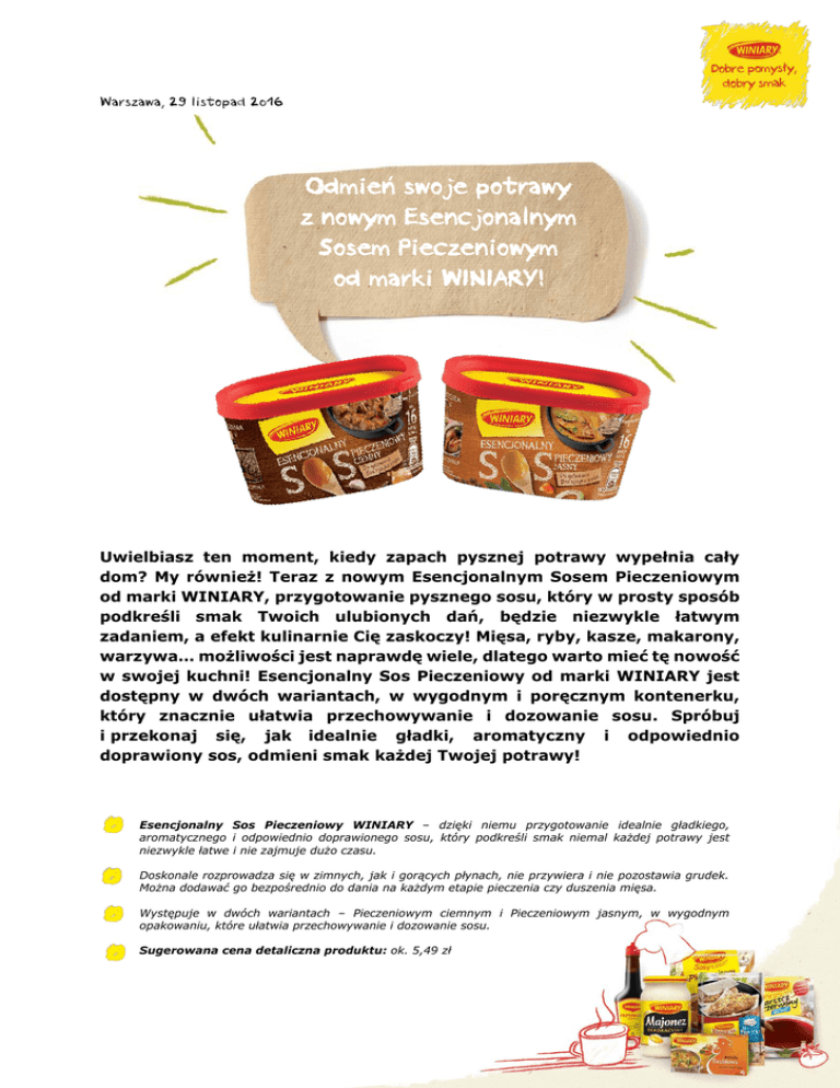 Warszawa, 29 listopad 2016 Odmień swoje potrawy z nowym Esencjonalnym Sosem Pieczeniowym od marki WINIARY! Uwielbiasz ten moment, kiedy zapach pysznej potrawy wypełnia cały dom? My również! Teraz z nowym Esencjonalnym Sosem Pieczeniowym od marki WINIARY, przygotowanie pysznego sosu, który w prosty sposób podkreśli smak Twoich ulubionych dań, będzie niezwykle łatwym zadaniem, a efekt kulinarnie Cię zaskoczy! Mięsa, ryby, kasze, makarony, warzywa… możliwości jest naprawdę wiele, dlatego warto mieć tę nowość w swojej kuchni! Esencjonalny Sos Pieczeniowy od marki WINIARY jest dostępny w dwóch wariantach, w wygodnym i poręcznym kontenerku, który znacznie ułatwia przechowywanie i dozowanie sosu. Spróbuj i przekonaj się, jak idealnie gładki, aromatyczny i odpowiednio doprawiony sos, odmieni smak każdej Twojej potrawy! Esencjonalny Sos Pieczeniowy WINIARY – dzięki niemu przygotowanie idealnie gładkiego, aromatycznego i odpowiednio doprawionego sosu, który podkreśli smak niemal każdej potrawy jest niezwykle łatwe i nie zajmuje dużo czasu. Doskonale rozprowadza się w zimnych, jak i gorących płynach, nie przywiera i nie pozostawia grudek. Można dodawać go bezpośrednio do dania na każdym etapie pieczenia czy duszenia mięsa. Występuje w dwóch wariantach – Pieczeniowym ciemnym i Pieczeniowym jasnym, w wygodnym opakowaniu, które ułatwia przechowywanie i dozowanie sosu. Sugerowana cena detaliczna produktu: ok. 5,49 zł Sos to w naszej codziennej kuchni absolutny niezbędnik! Polanie nim mięs, kasz, warzyw czy makaronów to idealny sposób na podkreślenie smaku ulubionych potraw, które podajemy naszym bliskim. Z nowym Esencjonalnym Sosem Pieczeniowym marki WINIARY z łatwością przygotujesz sos do dań, który doda wyrazistości i charakteru Twoim potrawom. Produkt doskonale rozprowadza się w zimnych, jak i gorących płynach, nie przywiera i nie pozostawia grudek. Ponadto, jego przyrządzenie jest niezwykle proste, bo sos można dodawać bezpośrednio do dania na każdym etapie pieczenia czy duszenia mięsa. Co więcej, jest idealnie doprawiony, a także bardzo wydajny – do jego przyrządzenia potrzebujemy ok. 3 łyżek i gotowe! Esencjonalny Sos Pieczeniowy WINIARY można wykorzystać, jako samodzielny sos do dań lub do podkreślenia smaku oraz poprawienia konsystencji już zrobionego sosu na bazie wywaru z mięsa. Występuje w dwóch wariantach – Esencjonalny Sos Pieczeniowy Ciemny oraz Esencjonalny Sos Pieczeniowy Jasny. Jego dozowanie będzie niezwykle wygodne, gdyż nowy sos od marki WINIARY jest dostępny w wygodnym opakowaniu – kontenerku, dzięki czemu można przechowywać go długo i bez obaw, że nasz produkt się rozsypie lub zbryluje. Spróbuj i przekonaj się, ile wspaniałych dań możesz przygotować mając go w kuchni! Smacznego! Po inspiracje na pyszne dania z wykorzystaniem aromatycznych sosów zapraszamy na www.winiary.pl ## WINIARY to marka, która od lat jest gwarancją sukcesu w kuchni. Jej produkty inspirują współczesne panie domu do przygotowywania najsmaczniejszych potraw dla całej rodziny. Zupy, majonezy, buliony, sosy, Pomysł na…, dania instant, przyprawy, galaretki, kisiele czy budynie – w sumie ponad 230 różnych produktów kulinarnych WINIARY, które pozwalają w szybki i prosty sposób przyrządzić posiłek. Na stronie www.winiary.pl panie domu znajdą przepisy oraz inspiracje kulinarne na każdy dzień. Produkty marki WINIARY rokrocznie zdobywają liczne nagrody przyznawane przez konsumentów i detalistów. W 2011, 2012 oraz 2015 roku redakcja „Rzeczpospolitej” przyznała marce WINIARY prestiżowy tytuł Najmocniejszej Marki Roku. Kontakt do biura prasowego: Kamila Dębniak kom. +48 508 988 861 email: [email protected]