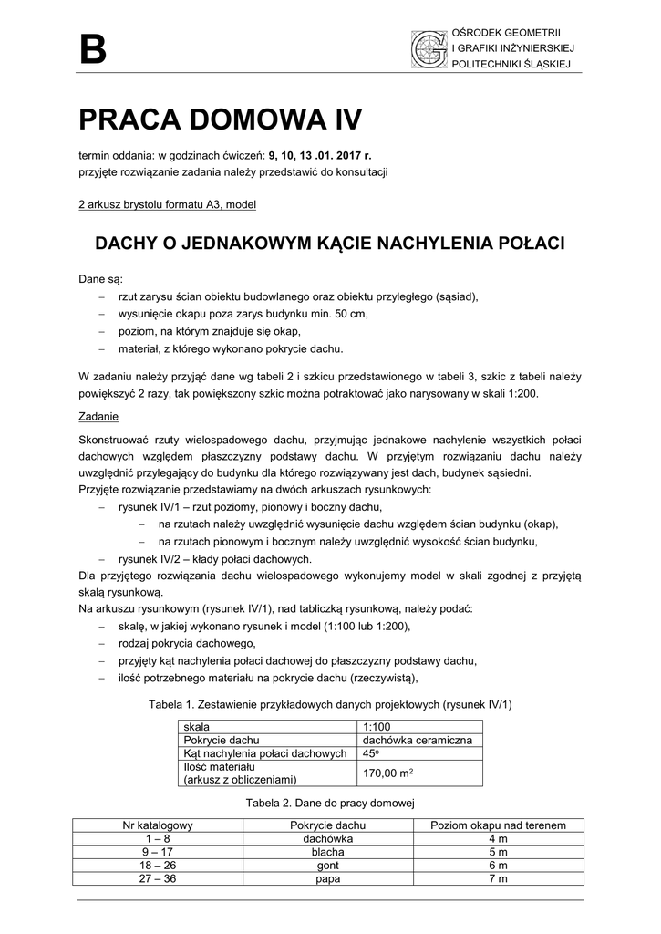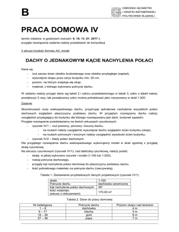 OŚRODEK GEOMETRII B I GRAFIKI INŻYNIERSKIEJ POLITECHNIKI ŚLĄSKIEJ PRACA DOMOWA IV termin oddania: w godzinach ćwiczeń: 9, 10, 13 .01. 2017 r. przyjęte rozwiązanie zadania należy przedstawić do konsultacji 2 arkusz brystolu formatu A3, model DACHY O JEDNAKOWYM KĄCIE NACHYLENIA POŁACI Dane są: rzut zarysu ścian obiektu budowlanego oraz obiektu przyległego (sąsiad), wysunięcie okapu poza zarys budynku min. 50 cm, poziom, na którym znajduje się okap, materiał, z którego wykonano pokrycie dachu. W zadaniu należy przyjąć dane wg tabeli 2 i szkicu przedstawionego w tabeli 3, szkic z tabeli należy powiększyć 2 razy, tak powiększony szkic można potraktować jako narysowany w skali 1:200. Zadanie Skonstruować rzuty wielospadowego dachu, przyjmując jednakowe nachylenie wszystkich połaci dachowych względem płaszczyzny podstawy dachu. W przyjętym rozwiązaniu dachu należy uwzględnić przylegający do budynku dla którego rozwiązywany jest dach, budynek sąsiedni. Przyjęte rozwiązanie przedstawiamy na dwóch arkuszach rysunkowych: rysunek IV/1 – rzut poziomy, pionowy i boczny dachu, na rzutach należy uwzględnić wysunięcie dachu względem ścian budynku (okap), na rzutach pionowym i bocznym należy uwzględnić wysokość ścian budynku, rysunek IV/2 – kłady połaci dachowych. Dla przyjętego rozwiązania dachu wielospadowego wykonujemy model w skali zgodnej z przyjętą skalą rysunkową. Na arkuszu rysunkowym (rysunek IV/1), nad tabliczką rysunkową, należy podać: skalę, w jakiej wykonano rysunek i model (1:100 lub 1:200), rodzaj pokrycia dachowego, przyjęty kąt nachylenia połaci dachowej do płaszczyzny podstawy dachu, ilość potrzebnego materiału na pokrycie dachu (rzeczywistą), Tabela 1. Zestawienie przykładowych danych projektowych (rysunek IV/1) skala Pokrycie dachu Kąt nachylenia połaci dachowych Ilość materiału (arkusz z obliczeniami) 1:100 dachówka ceramiczna 45o 170,00 m2 Tabela 2. Dane do pracy domowej Nr katalogowy 1–8 9 – 17 18 – 26 27 – 36 Pokrycie dachu dachówka blacha gont papa Poziom okapu nad terenem 4m 5m 6m 7m B OŚRODEK GEOMETRII I GRAFIKI INŻYNIERSKIEJ POLITECHNIKI ŚLĄSKIEJ PRACA DOMOWA IV Tabela 3. Dane do pracy domowej – szkic zarysu budynku wraz z przylegającym budynkiem sąsiednim. Należy przyjąć „sąsiada” zgodnie z własnym numerem katalogowym. B OŚRODEK GEOMETRII I GRAFIKI INŻYNIERSKIEJ POLITECHNIKI ŚLĄSKIEJ PRACA DOMOWA IV Tabela 3. Dane do pracy domowej – szkic zarysu budynku wraz z przylegającym budynkiem sąsiednim. Należy przyjąć „sąsiada” zgodnie z własnym numerem katalogowym.