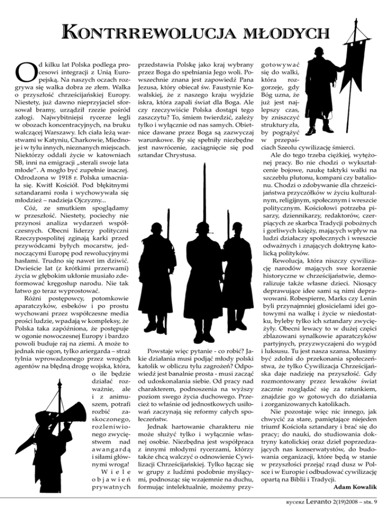 O d kilku lat Polska podlega procesowi integracji z Unią Europejską. Na naszych oczach rozgrywa się walka dobra ze złem. Walka o przyszłość chrześcijańskiej Europy. Niestety, już dawno nieprzyjaciel sforsował bramy, urządził rzezie pośród załogi. Najwybitniejsi rycerze legli w obozach koncentracyjnych, na bruku walczącej Warszawy. Ich ciała leżą warstwami w Katyniu, Charkowie, Miednoje i w tylu innych, nieznanych miejscach. Niektórzy oddali życie w katowniach SB, inni na emigracji „sterali swoje lata młode”. A mogło być zupełnie inaczej. Odrodzona w 1918 r. Polska umacniała się. Kwitł Kościół. Pod błękitnymi sztandarami rosła i wychowywała się młodzież – nadzieja Ojczyzny... Cóż, ze smutkiem spoglądamy w przeszłość. Niestety, pociechy nie przynosi analiza wydarzeń współczesnych. Obecni liderzy polityczni Rzeczypospolitej zginają karki przed przywódcami byłych mocarstw, jednoczącymi Europę pod rewolucyjnymi hasłami. Trudno się nawet im dziwić. Dwieście lat (z krótkimi przerwami) życia w głębokim ukłonie musiało zdeformować kręgosłup narodu. Nie tak łatwo go teraz wyprostować. Różni postępowcy, potomkowie aparatczyków, esbeków i po prostu wychowani przez współczesne media prości ludzie, wpadają w kompleksy, że Polska taka zapóźniona, że postępuje w ogonie nowoczesnej Europy i bardzo powoli buduje raj na ziemi. A może to jednak nie ogon, tylko ariergarda – straż tylnia wprowadzonego przez wrogich agentów na błędną drogę wojska, która, o ile będzie działać rozważnie, ale i z animuszem, potrafi rozbić zaskoczonego, rozleniwionego zwycięstwem nad a wa n g a r d ą i siłami głównymi wroga! W i e l e objawień prywatnych przedstawia Polskę jako kraj wybrany przez Boga do spełniania Jego woli. Powszechnie znana jest zapowiedź Pana Jezusa, który obiecał św. Faustynie Kowalskiej, że z naszego kraju wyjdzie iskra, która zapali świat dla Boga. Ale czy rzeczywiście Polska dostąpi tego zaszczytu? To, śmiem twierdzić, zależy tylko i wyłącznie od nas samych. Obietnice dawane przez Boga są zazwyczaj warunkowe. By się spełniły niezbędne jest nawrócenie, zaciągnięcie się pod sztandar Chrystusa. Powstaje więc pytanie - co robić? Jakie działania musi podjąć młody polski katolik w obliczu tylu zagrożeń? Odpowiedź jest banalnie prosta - musi zacząć od udoskonalania siebie. Od pracy nad charakterem, podnoszenia na wyższy poziom swego życia duchowego. Przecież to właśnie od jednostkowych usiłowań zaczynają się reformy całych społeczeństw. Jednak hartowanie charakteru nie może służyć tylko i wyłącznie własnej osobie. Niezbędna jest współpraca z innymi młodymi rycerzami, którzy także chcą walczyć o odnowienie Cywilizacji Chrześcijańskiej. Tylko łącząc się w grupy z ludźmi podobnie myślącymi, podnosząc się wzajemnie na duchu, formując intelektualnie, możemy przy- gotowywać się do walki, która rozgorzeje, gdy Bóg uzna, że już jest najlepszy czas, by zniszczyć struktury zła, by pogrążyć w przepaściach Szeolu cywilizację śmierci. Ale do tego trzeba ciężkiej, wytężonej pracy. Bo nie chodzi o wykształcenie bojowe, naukę taktyki walki na szczeblu plutonu, kompani czy batalionu. Chodzi o zdobywanie dla chrześcijaństwa przyczółków w życiu kulturalnym, religijnym, społecznym i wreszcie politycznym. Kościołowi potrzeba pisarzy, dziennikarzy, redaktorów, czerpiących ze skarbca Tradycji pobożnych i gorliwych księży, mających wpływ na ludzi działaczy społecznych i wreszcie odważnych i znających doktrynę katolicką polityków. Rewolucja, która niszczy cywilizację narodów mających swe korzenie historyczne w chrześcijaństwie, demoralizuje także własne dzieci. Niosący deprawujące idee sami są nimi deprawowani. Robespierre, Marks czy Lenin byli przynajmniej głosicielami idei gotowymi na walkę i życie w niedostatku, byleby tylko ich sztandary zwyciężyły. Obecni lewacy to w dużej części zblazowani synalkowie aparatczyków partyjnych, przyzwyczajeni do wygód i luksusu. Tu jest nasza szansa. Musimy być zdolni do przekonania społeczeństwa, że tylko Cywilizacja Chrześcijańska daje nadzieję na przyszłość. Gdy rozmontowany przez lewaków świat zacznie rozglądać się za ratunkiem, znajdzie go w gotowych do działania i zorganizowanych katolikach. Nie pozostaje więc nic innego, jak chwycić za stare, pamiętające niejeden triumf Kościoła sztandary i brać się do pracy; do nauki, do studiowania doktryny katolickiej oraz dzieł poprzedzających nas konserwatystów, do budowania organizacji, które będą w stanie w przyszłości przejąć rząd dusz w Polsce i w Europie i odbudować cywilizację opartą na Biblii i Tradycji. Adam Kowalik rycerz Lepanto 2(19)2008 – str.
