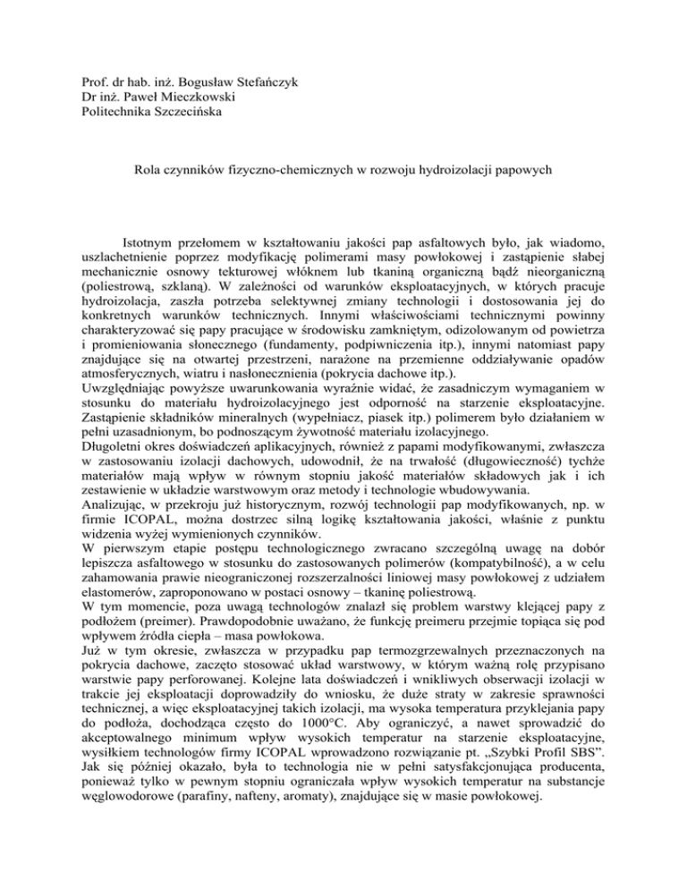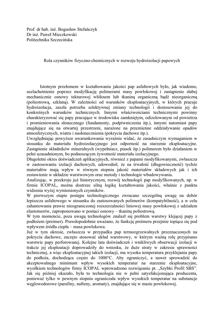 Prof. dr hab. in. Bogus aw Stefaczyk Dr in. Pawe Mieczkowski Politechnika Szczeciska Rola czynników fizyczno-chemicznych w rozwoju hydroizolacji papowych Istotnym prze omem w kszta towaniu jakoci pap asfaltowych by o, jak wiadomo, uszlachetnienie poprzez modyfikacj polimerami masy pow okowej i zastpienie s abej mechanicznie osnowy tekturowej w óknem lub tkanin organiczn bd nieorganiczn (poliestrow, szklan). W zalenoci od warunków eksploatacyjnych, w których pracuje hydroizolacja, zasz a potrzeba selektywnej zmiany technologii i dostosowania jej do konkretnych warunków technicznych. Innymi w aciwociami technicznymi powinny charakteryzowa si papy pracujce w rodowisku zamknitym, odizolowanym od powietrza i promieniowania s onecznego (fundamenty, podpiwniczenia itp.), innymi natomiast papy znajdujce si na otwartej przestrzeni, naraone na przemienne oddzia ywanie opadów atmosferycznych, wiatru i nas onecznienia (pokrycia dachowe itp.). Uwzgldniajc powysze uwarunkowania wyranie wida, e zasadniczym wymaganiem w stosunku do materia u hydroizolacyjnego jest odporno na starzenie eksploatacyjne. Zastpienie sk adników mineralnych (wype niacz, piasek itp.) polimerem by o dzia aniem w pe ni uzasadnionym, bo podnoszcym ywotno materia u izolacyjnego. D ugoletni okres dowiadcze aplikacyjnych, równie z papami modyfikowanymi, zw aszcza w zastosowaniu izolacji dachowych, udowodni , e na trwa o (d ugowieczno) tyche materia ów maj wp yw w równym stopniu jako materia ów sk adowych jak i ich zestawienie w uk adzie warstwowym oraz metody i technologie wbudowywania. Analizujc, w przekroju ju historycznym, rozwój technologii pap modyfikowanych, np. w firmie ICOPAL, mona dostrzec siln logik kszta towania jakoci, w anie z punktu widzenia wyej wymienionych czynników. W pierwszym etapie postpu technologicznego zwracano szczególn uwag na dobór lepiszcza asfaltowego w stosunku do zastosowanych polimerów (kompatybilno), a w celu zahamowania prawie nieograniczonej rozszerzalnoci liniowej masy pow okowej z udzia em elastomerów, zaproponowano w postaci osnowy – tkanin poliestrow. W tym momencie, poza uwag technologów znalaz si problem warstwy klejcej papy z pod oem (preimer). Prawdopodobnie uwaano, e funkcj preimeru przejmie topica si pod wp ywem ród a ciep a – masa pow okowa. Ju w tym okresie, zw aszcza w przypadku pap termozgrzewalnych przeznaczonych na pokrycia dachowe, zaczto stosowa uk ad warstwowy, w którym wan rol przypisano warstwie papy perforowanej. Kolejne lata dowiadcze i wnikliwych obserwacji izolacji w trakcie jej eksploatacji doprowadzi y do wniosku, e due straty w zakresie sprawnoci technicznej, a wic eksploatacyjnej takich izolacji, ma wysoka temperatura przyklejania papy do pod oa, dochodzca czsto do 1000°C. Aby ograniczy, a nawet sprowadzi do akceptowalnego minimum wp yw wysokich temperatur na starzenie eksploatacyjne, wysi kiem technologów firmy ICOPAL wprowadzono rozwizanie pt. „Szybki Profil SBS”. Jak si póniej okaza o, by a to technologia nie w pe ni satysfakcjonujca producenta, poniewa tylko w pewnym stopniu ogranicza a wp yw wysokich temperatur na substancje wglowodorowe (parafiny, nafteny, aromaty), znajdujce si w masie pow okowej. Ogrzewanie palnikiem gazowym p aszczyzny papy, celem roztopienia pokrywajcego j asfaltu, skutkuje wzrostem temperatury, lokalnie nawet do ok. 1000°C. Wynikiem tego moe by tzw. przepalanie papy oraz uszkodzenie jej osnowy, najczciej równie wglowodorowej. W wysokiej temperaturze w masie pow okowej, sk adajcej si z mieszaniny fizycznej asfalt – SBS (styren-butadien-styren), nastpuj istotne, nieodwracalne zmiany w obu sk adnikach jednoczenie. Zarówno asfalt jak jego sk adniki grupowe (oleje, ywice, asfalteny), podlegaj procesom utleniania, czego efektem jest zjawisko koksowania materia u bitumicznego z jednej strony, z drugiej natomiast zanieczyszczenie rodowiska naturalnego gazowymi produktami spalania w postaci tlenku i dwutlenku wgla, siarki, azotu. W przypadku SBS wysoka temperatura palnika wywo uje w pierwszym etapie rozprzganie kopolimeru na polibutylen i polistyren (temp. ok. 120°C). Ten ostatni w duej czci ulega spaleniu na tlenek i dwutlenek wgla, przy czym znaczna jego cz wydziela si do otoczenia (atmosfery) w postaci bardzo toksycznych oparów, niebezpiecznych nie tylko dla personelu pracowniczego, ale równie rodowiska naturalnego w ogólnoci. W konsekwencji tych procesów masa powokowa zubaa si w kopolimer SBS i traci swoje waciwoci plastyczno-elastyczne, stajc si w wikszym lub mniejszym stopniu ciaem kruchym, podlegajcym w warunkach eksploatacyjnych dalszemu starzeniu. Zmiana waciwoci, zwaszcza masy powokowej, skutkuje znacznym pogorszeniem wikszoci podstawowych parametrów, takich jak: penetracja, temperatura miknienia, gitko w niskich temperaturach oraz adhezja do podoa betonowego. Wynika wic z tego, e dugotrwae, energochonne zgrzewanie z uyciem palników gazowych jest czynnikiem ograniczajcym znaczco dugowieczno tego typu izolacji. Na potwierdzenie tego wykonano badania penetracji, temperatury miknienia i lepkoci w 60°C na próbkach masy pow okowej, pobranej z papy typu Szybki Profil SBS i Szybki Syntany SBS przed ich ogrzewaniem technologicznym i po ogrzaniu (p omieniem palnika zgodnie z zaleceniami producenta papy). Zmiany parametrów (w %) w stosunku do wartoci pocztkowych przedstawiono na rys. 1. Rys. 1. Zmiana parametrów masy pow okowej przed i po ogrzewaniu technologicznym (na budowie) Wyranie wida, e decydujcy wp yw na zmian parametrów technicznych odgrywa sposób i intensywno ogrzewania (przy zblionych parametrach wyjciowych masy pow okowej), co przek ada si bezporednio na trwa o i ywotno papy. Wszystkie te dowiadczenia zainspirowa y nadzór naukowy firmy ICOPAL do poszukiwa takich rozwiza technologicznych, które wyeliminuj dotychczasowe b dy, wynikajce g ównie ze s abo kontrolowanych procesów d ugotrwa ego zgrzewania pap na gorco. W rozwaaniach nad opracowaniem najnowszej wersji technologii przyjto cztery g
